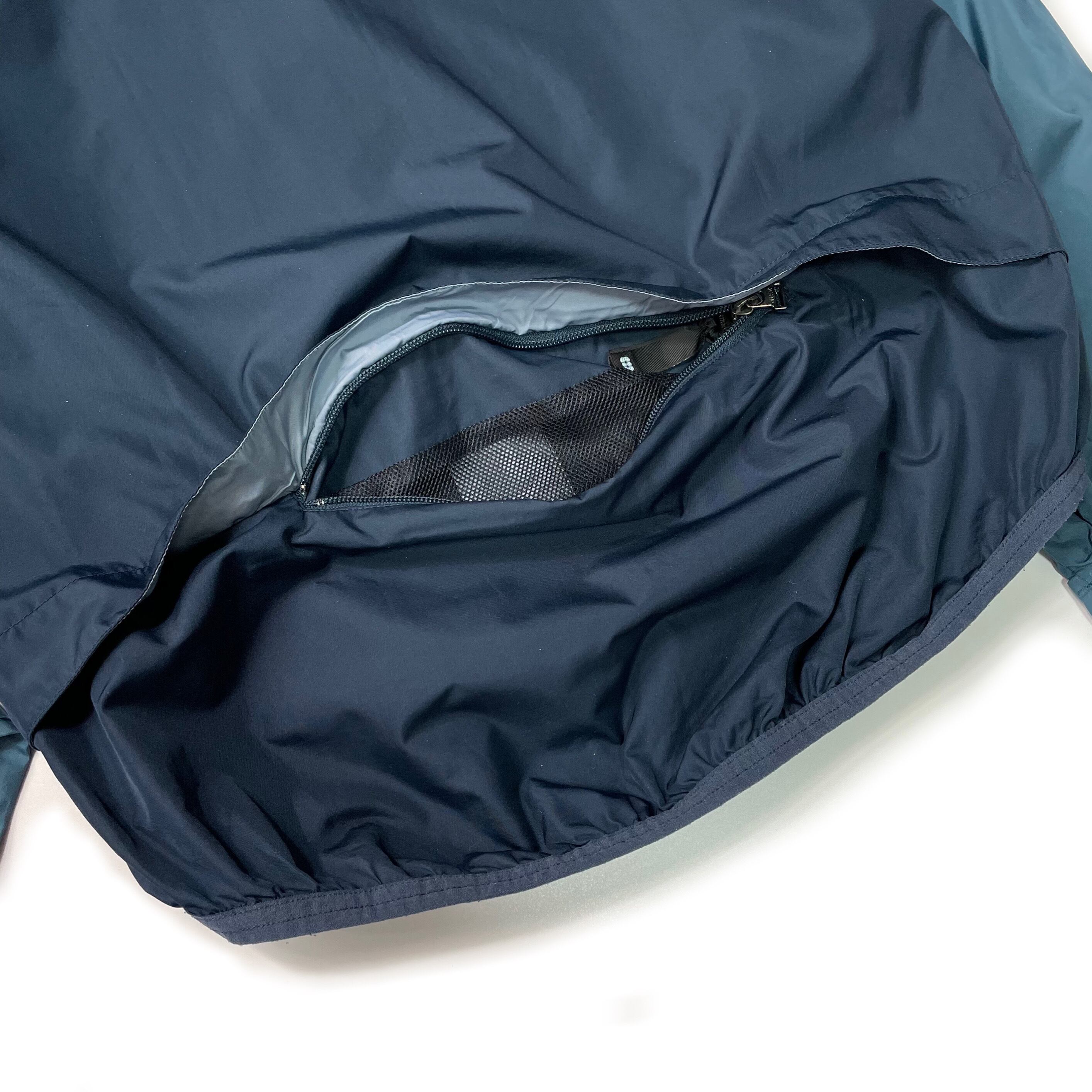背中にポケットが付いていて、フロントにはポケットがありません。背面のポケットに収納することでパッカブル仕様に。