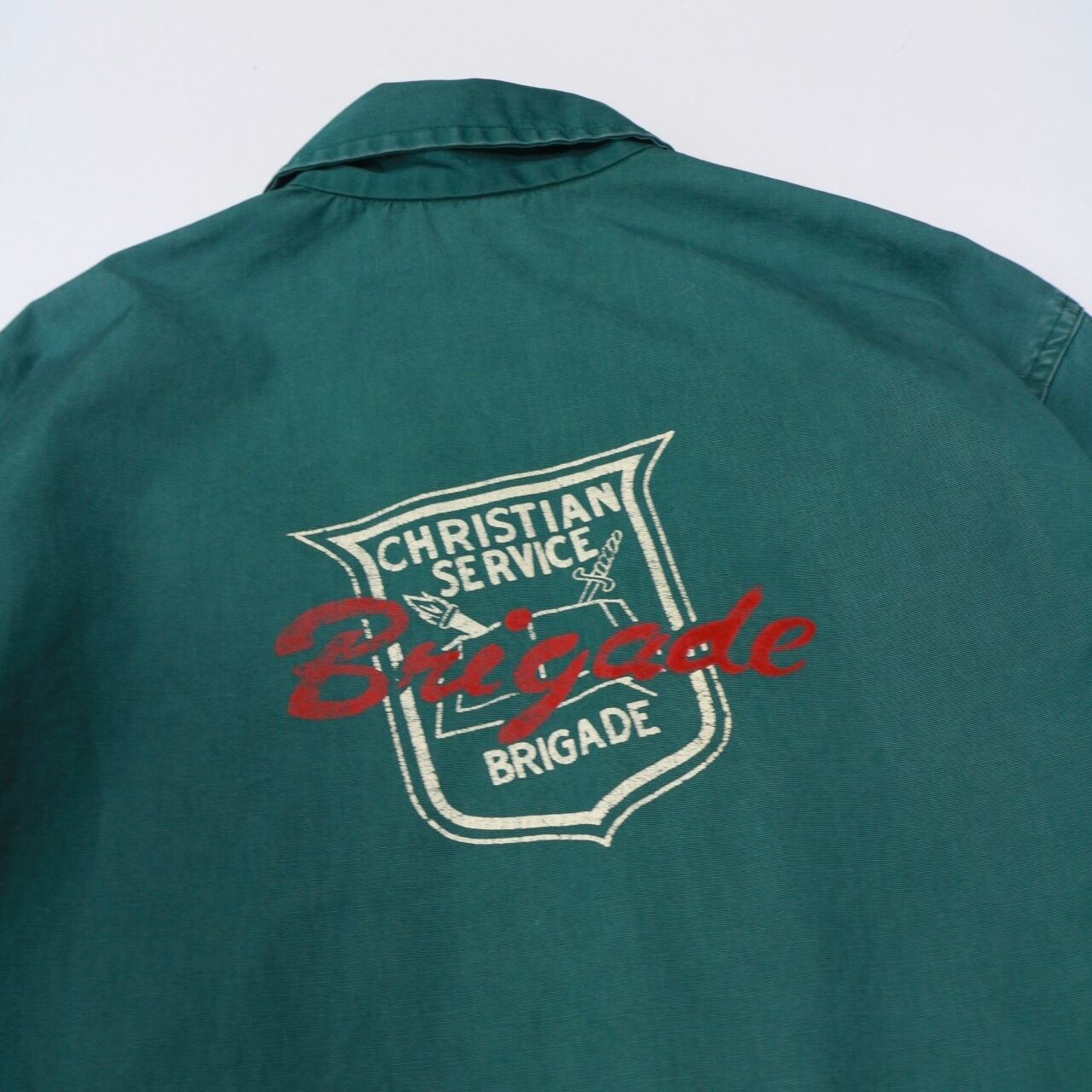 左胸にはChristian Service Brigade (キリスト教奉仕団)のワッペン、背面にはプリントが施されています。