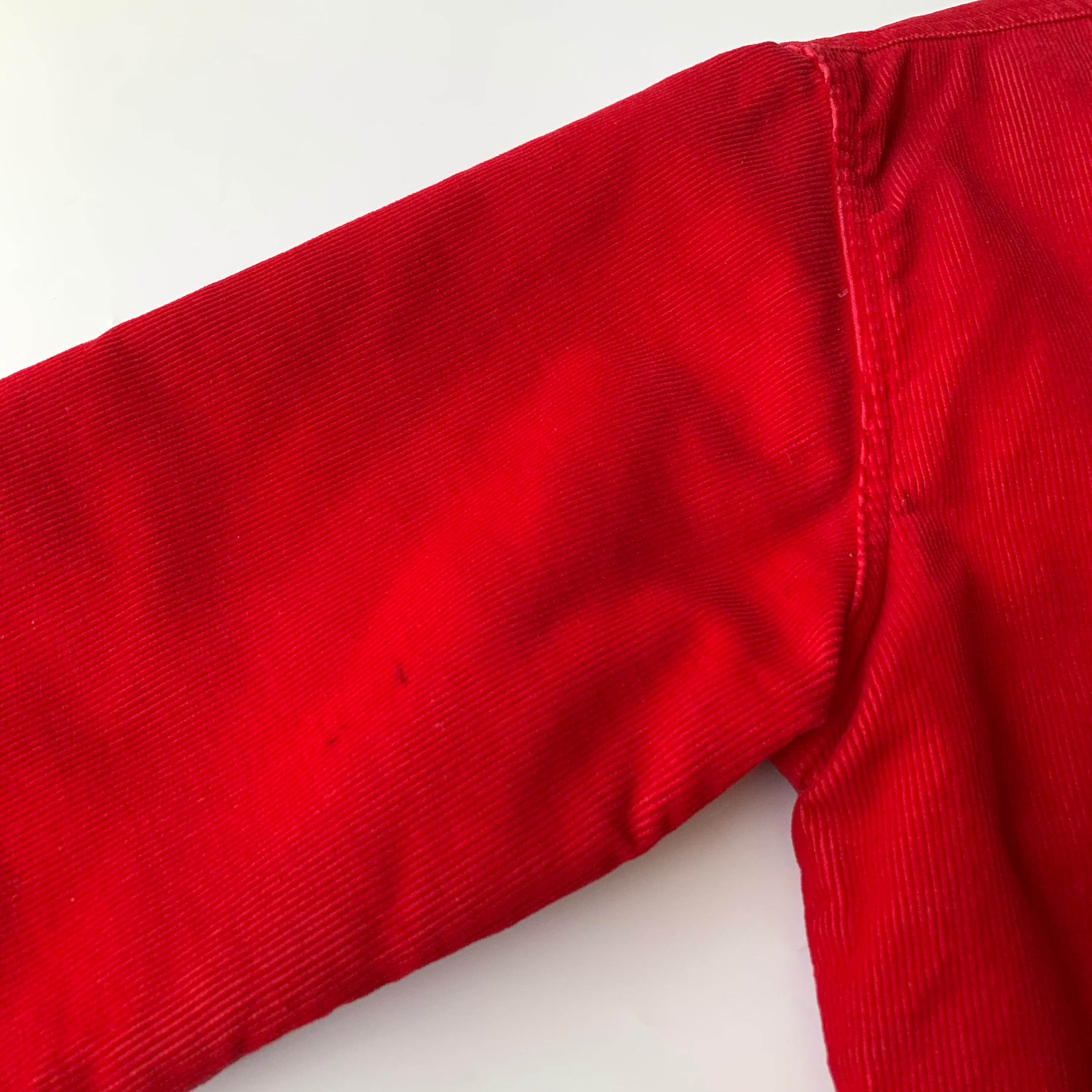 赤いコーデュロイとポケットやリブライン、裏地の青いカラーリングが良いコントラストに◎。胸元のブルドッグも可愛いらしいです。