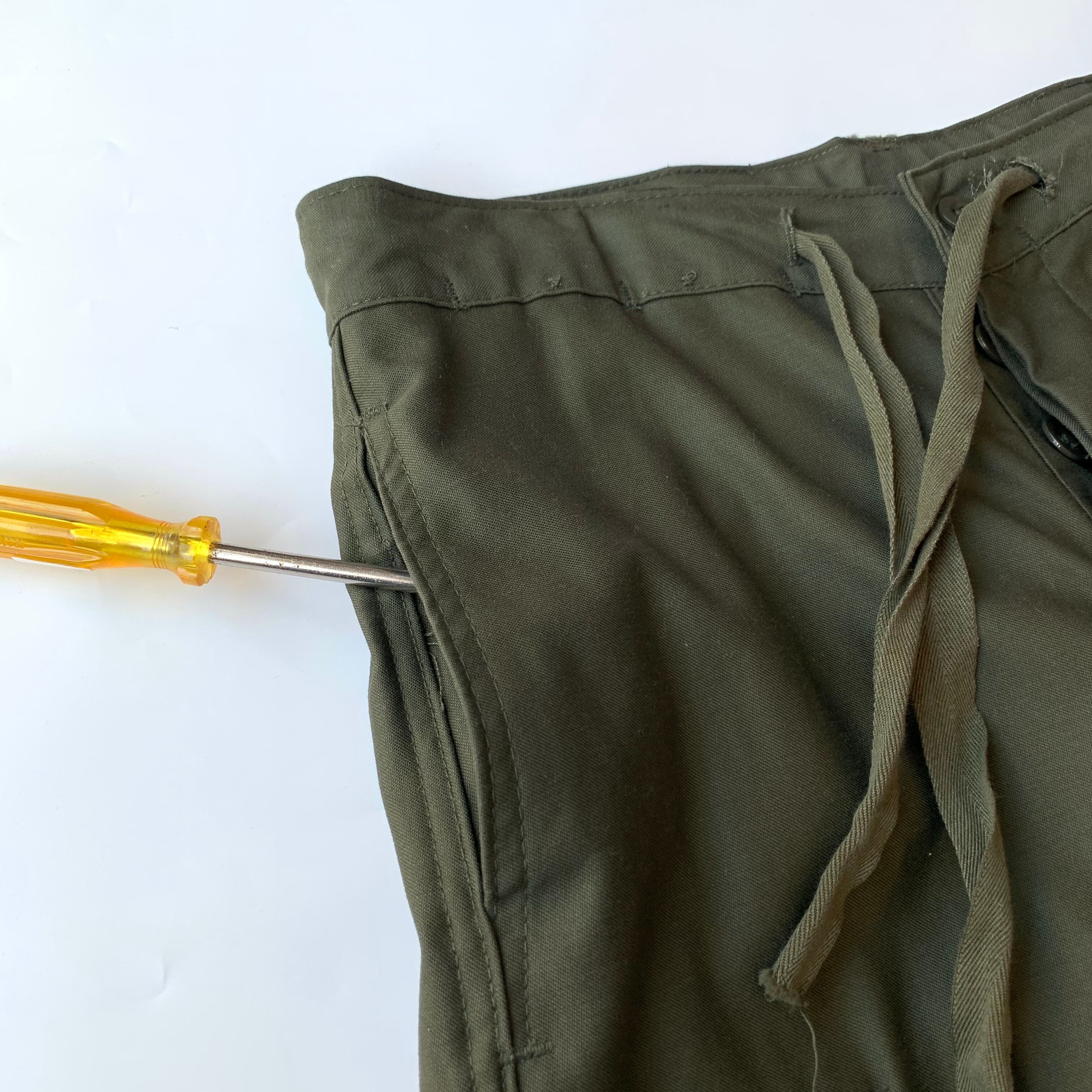 右側のみにカーゴポケットとバックポケットが付きます。太めのシルエットで、元々は通常のパンツの上から穿くオーバーパンツとして使われていたもの。なのでサイドのポケットは貫通しています(4枚目の写真、左下)