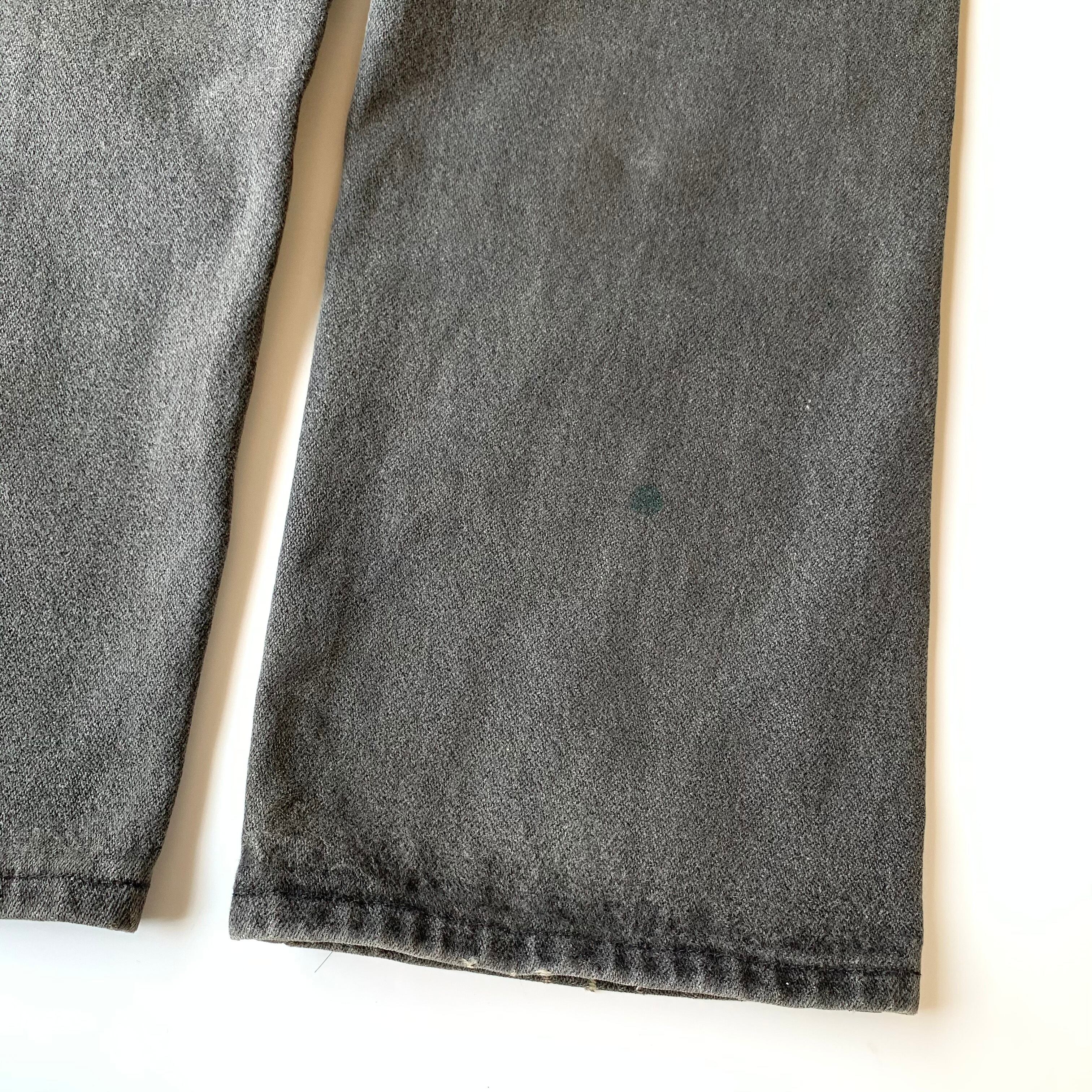 程よく色落ちし、グレーブラックのような色味になっております。小さなシミなどはございますが、大きく目立つものはないかと。