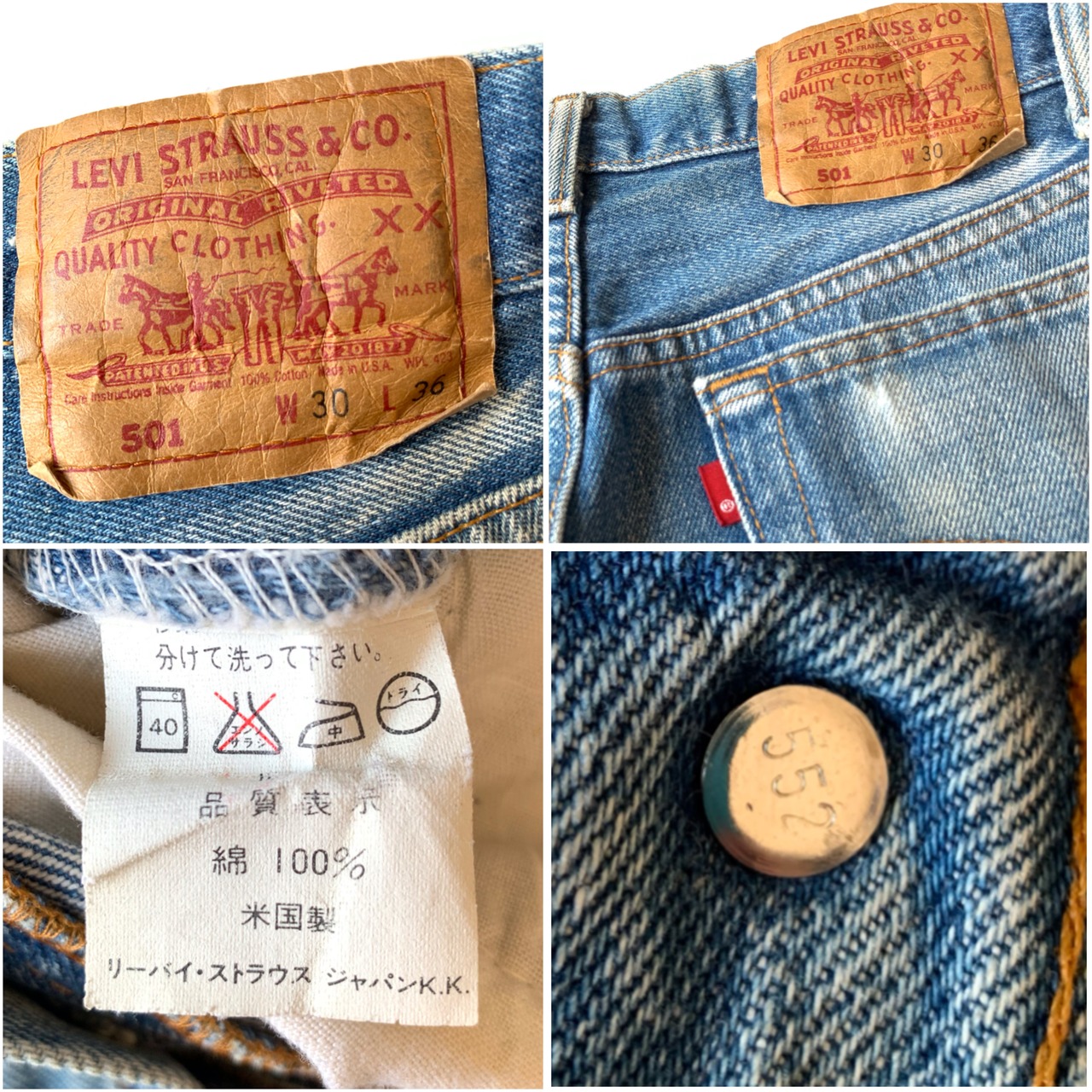 トップボタン裏刻印552のアメリカ製。丈つめされておりますが、実寸W30L30とゴールデンサイズ。