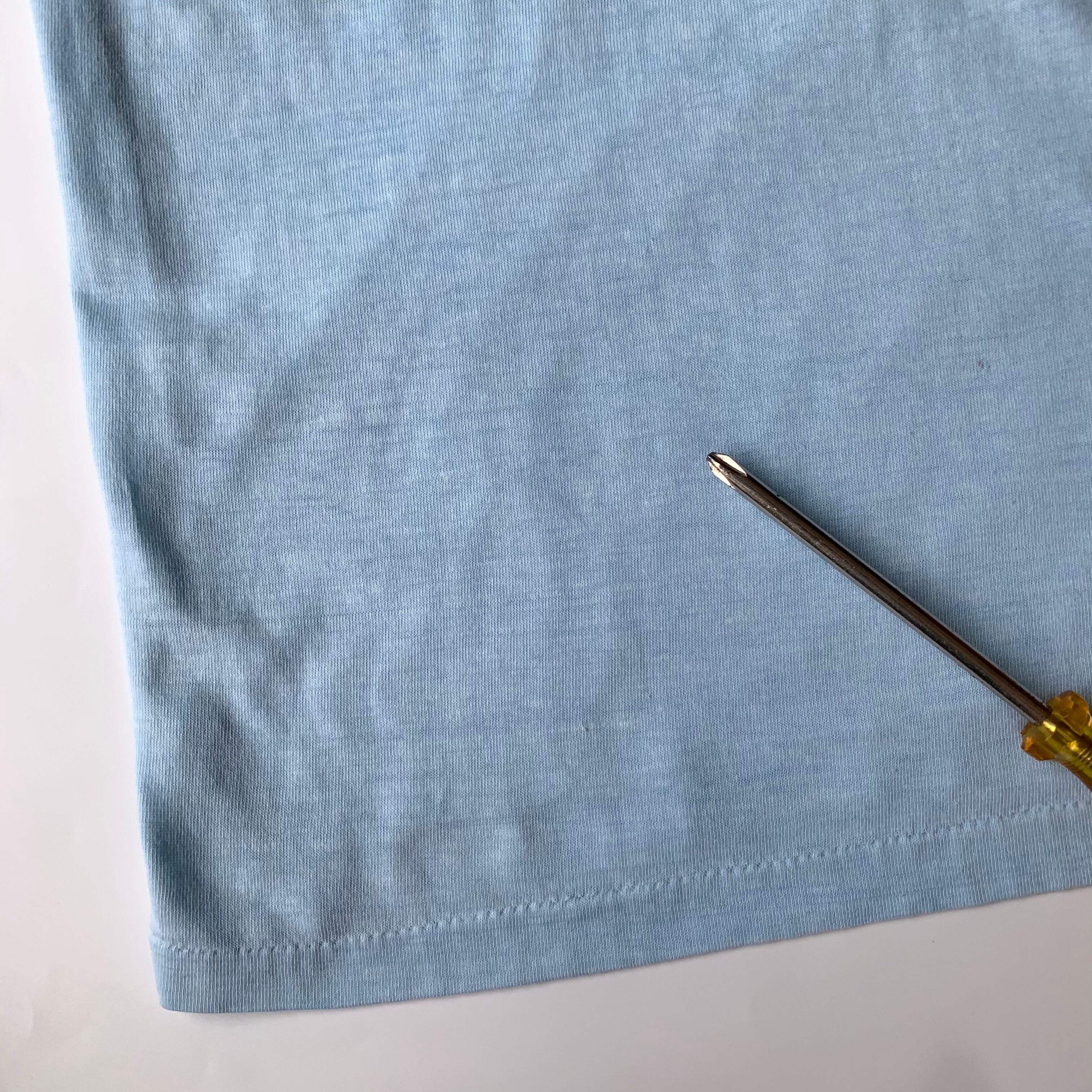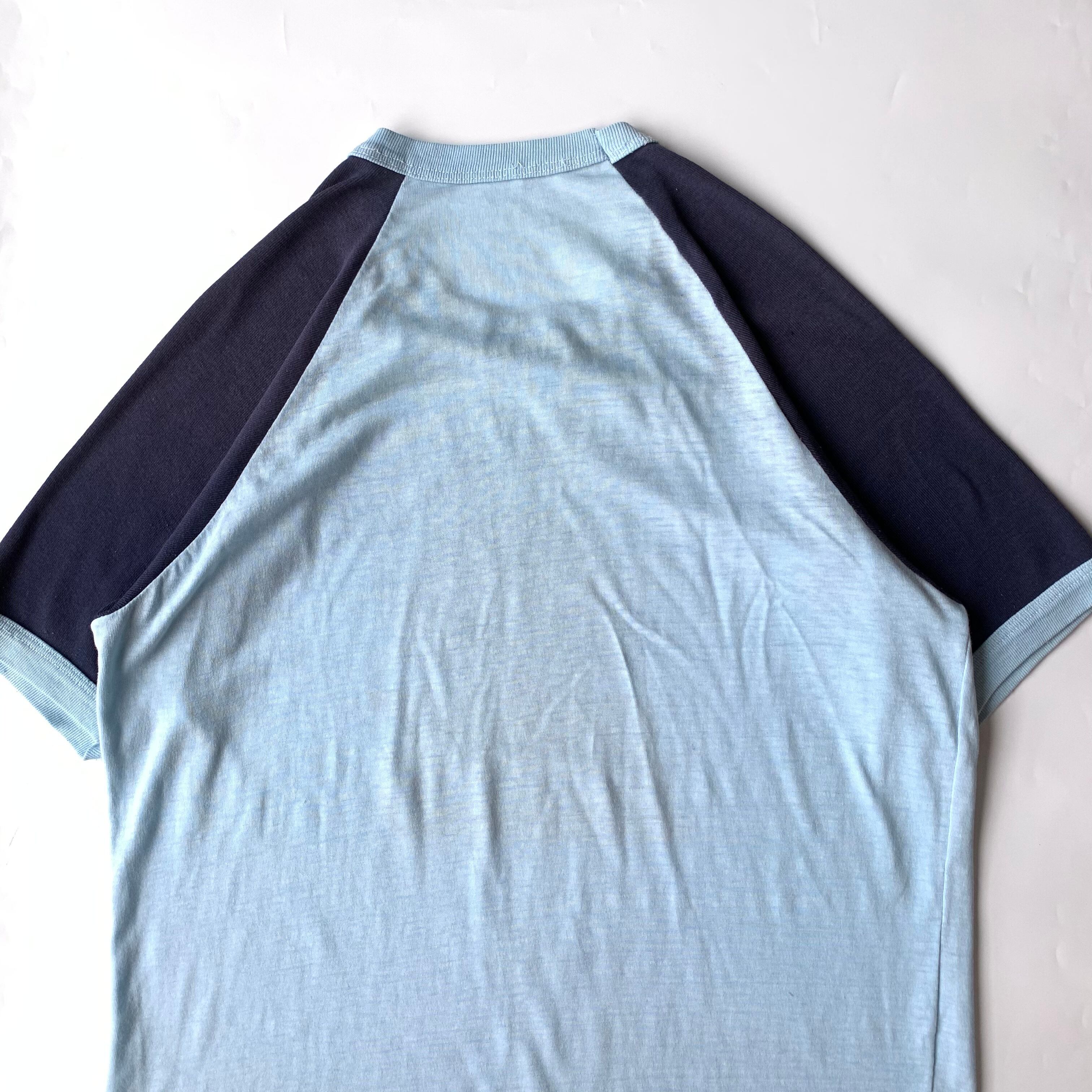 水色のボディにネイビーのラグラン切り替え。リブ周りの色の切り替えがリンガーっぽさもあります。