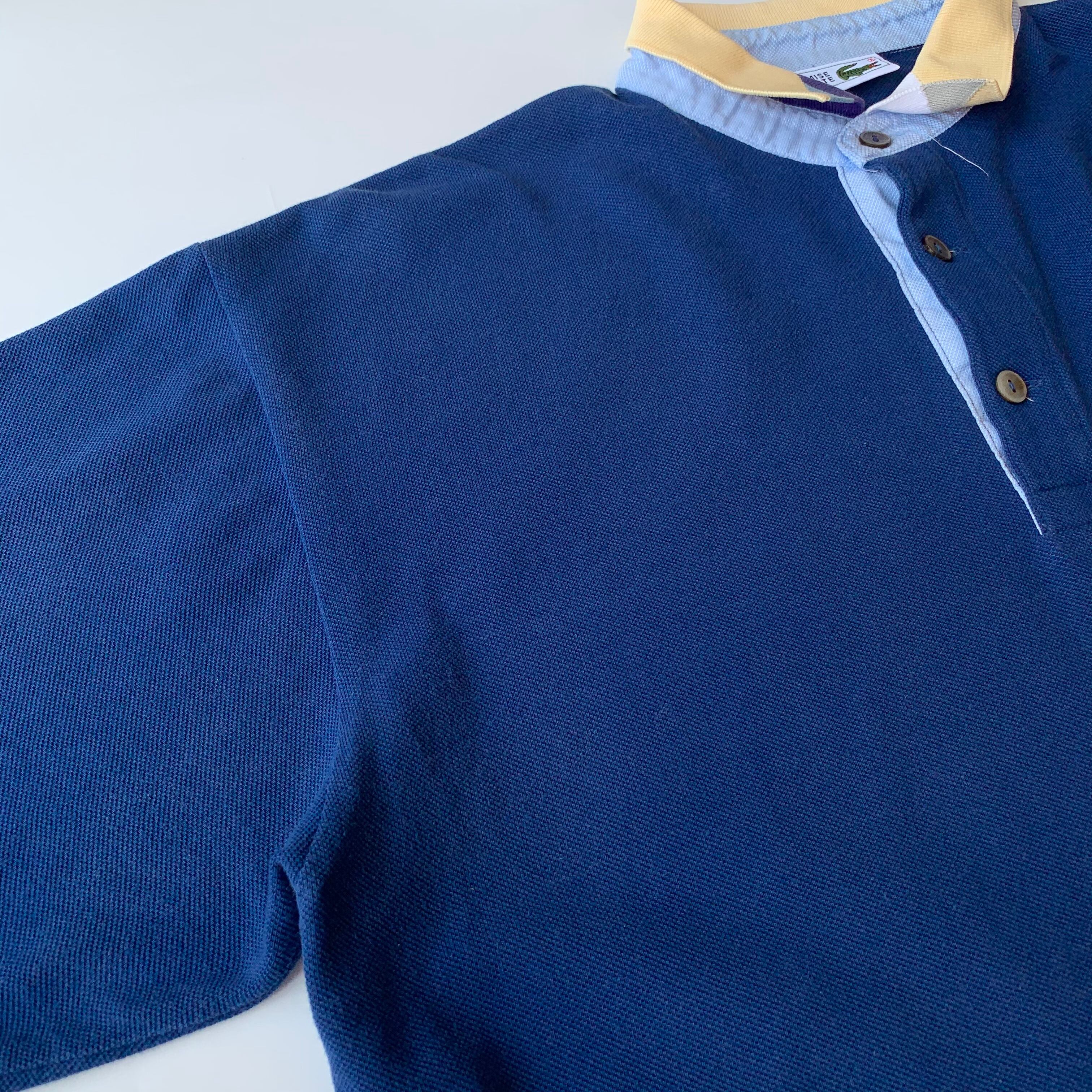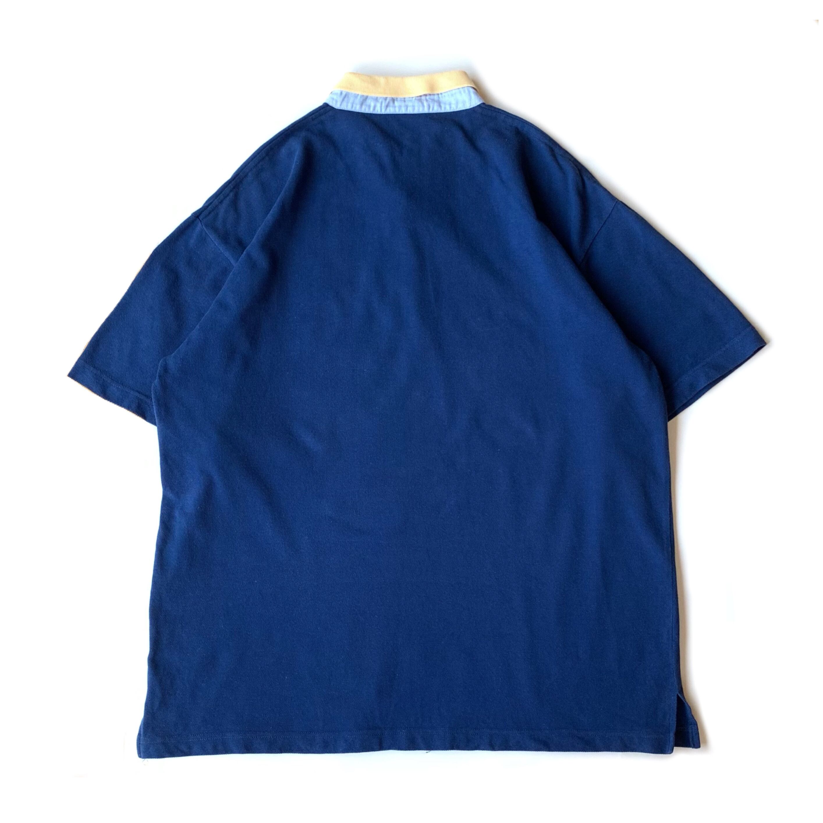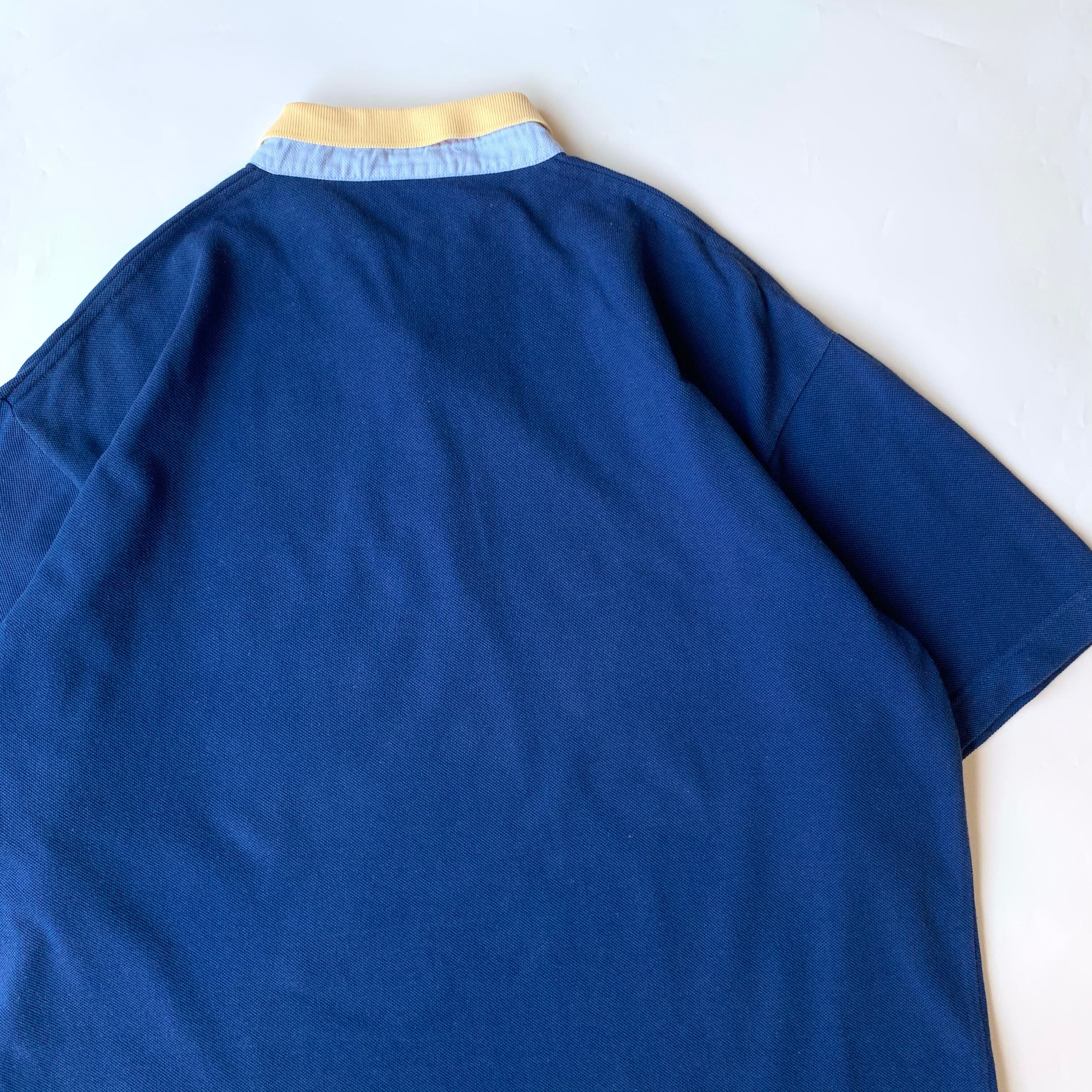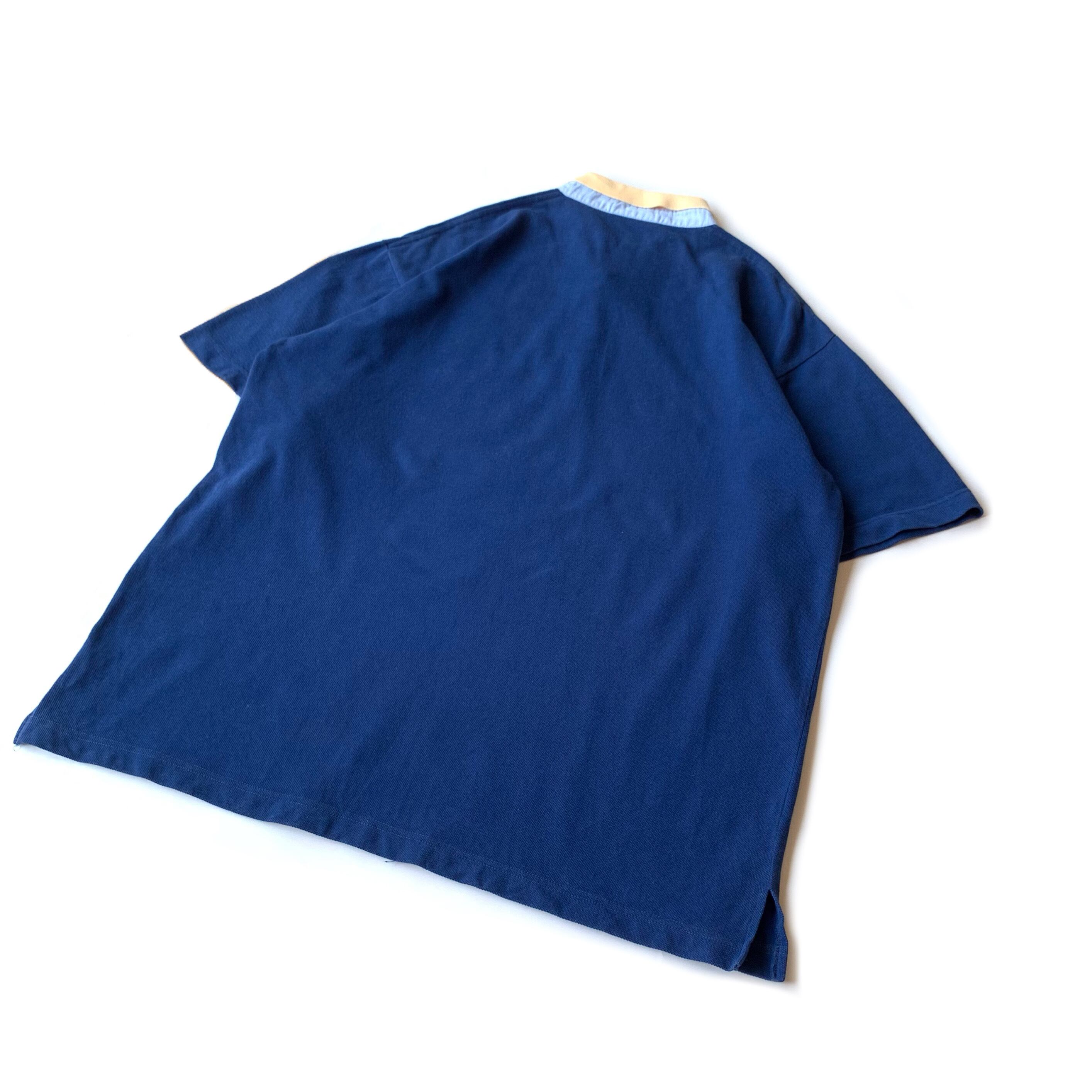 無地のブルーボディに胸元にはワニの刺繍。襟は薄いイエローカラーで、襟先に小さな切り替えが施されております。