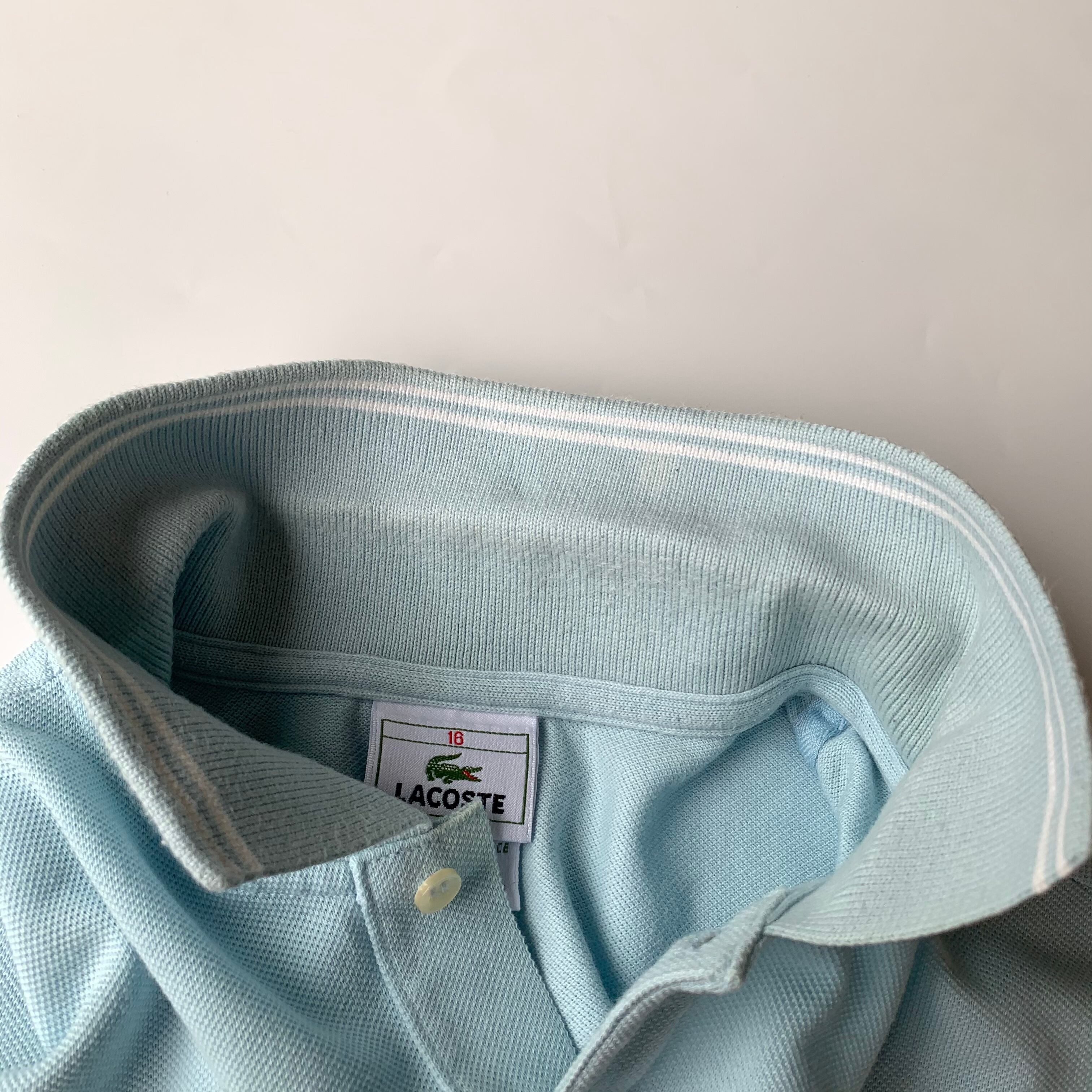 フランスデザインのペルー製。無地の水色ボディに袖と襟には白のリブライン。裾には薄いですがLACOSTEという文字の刺繍入り。