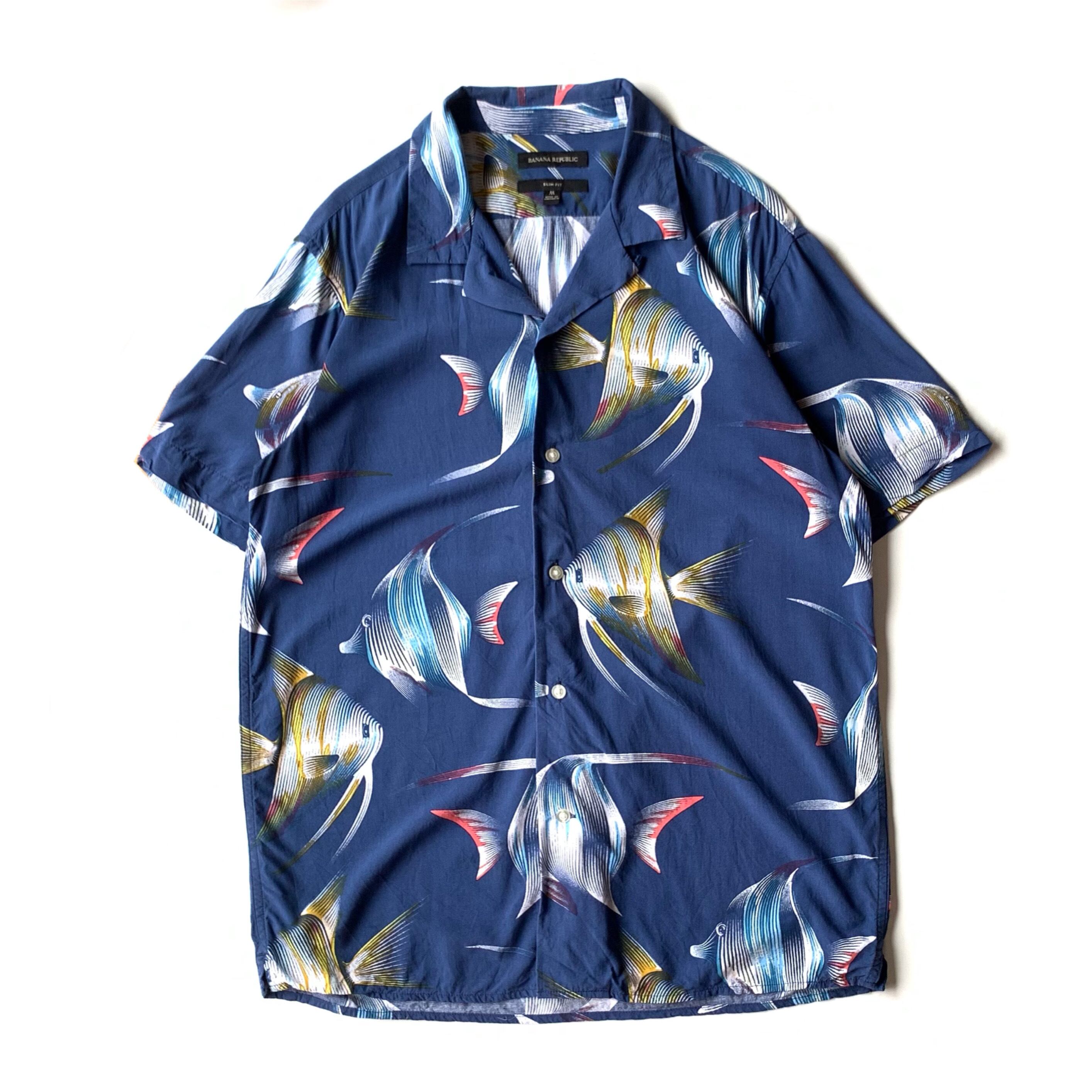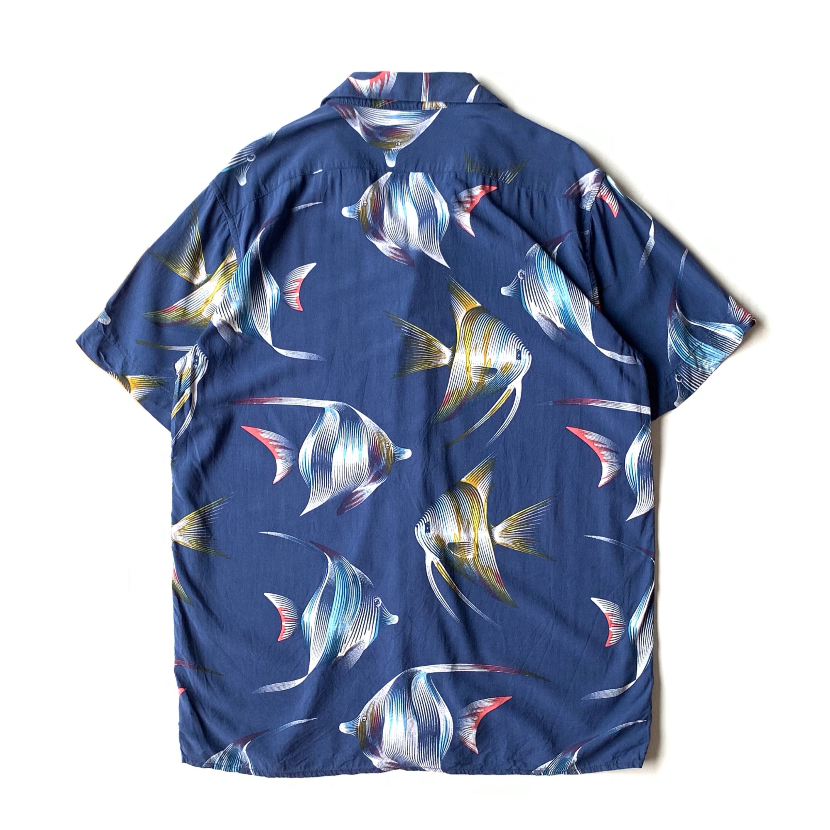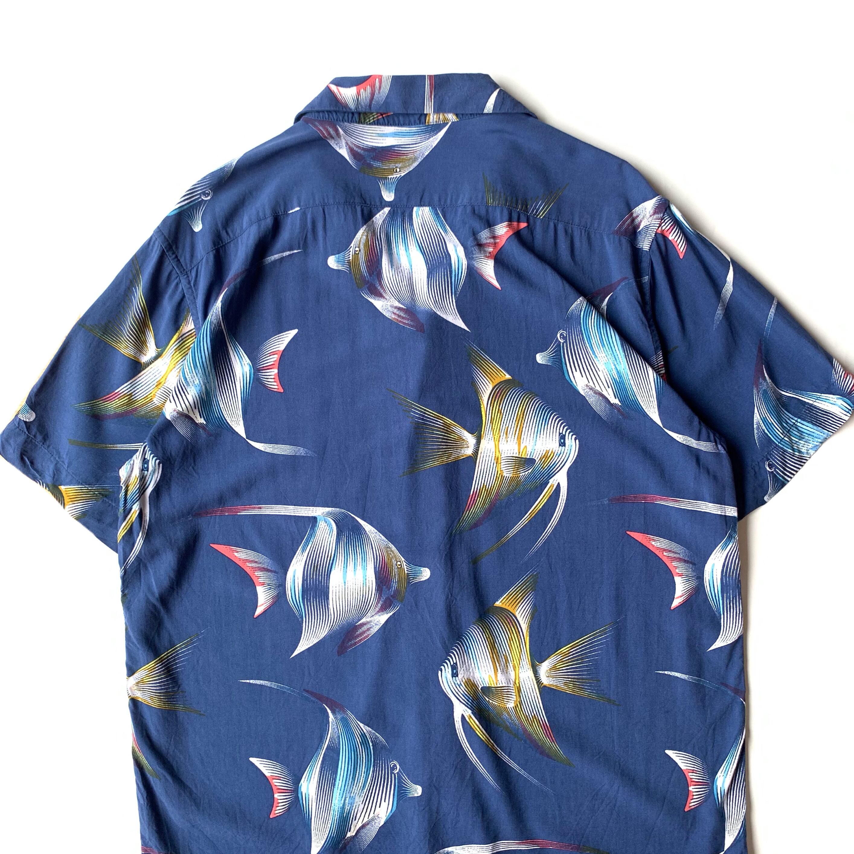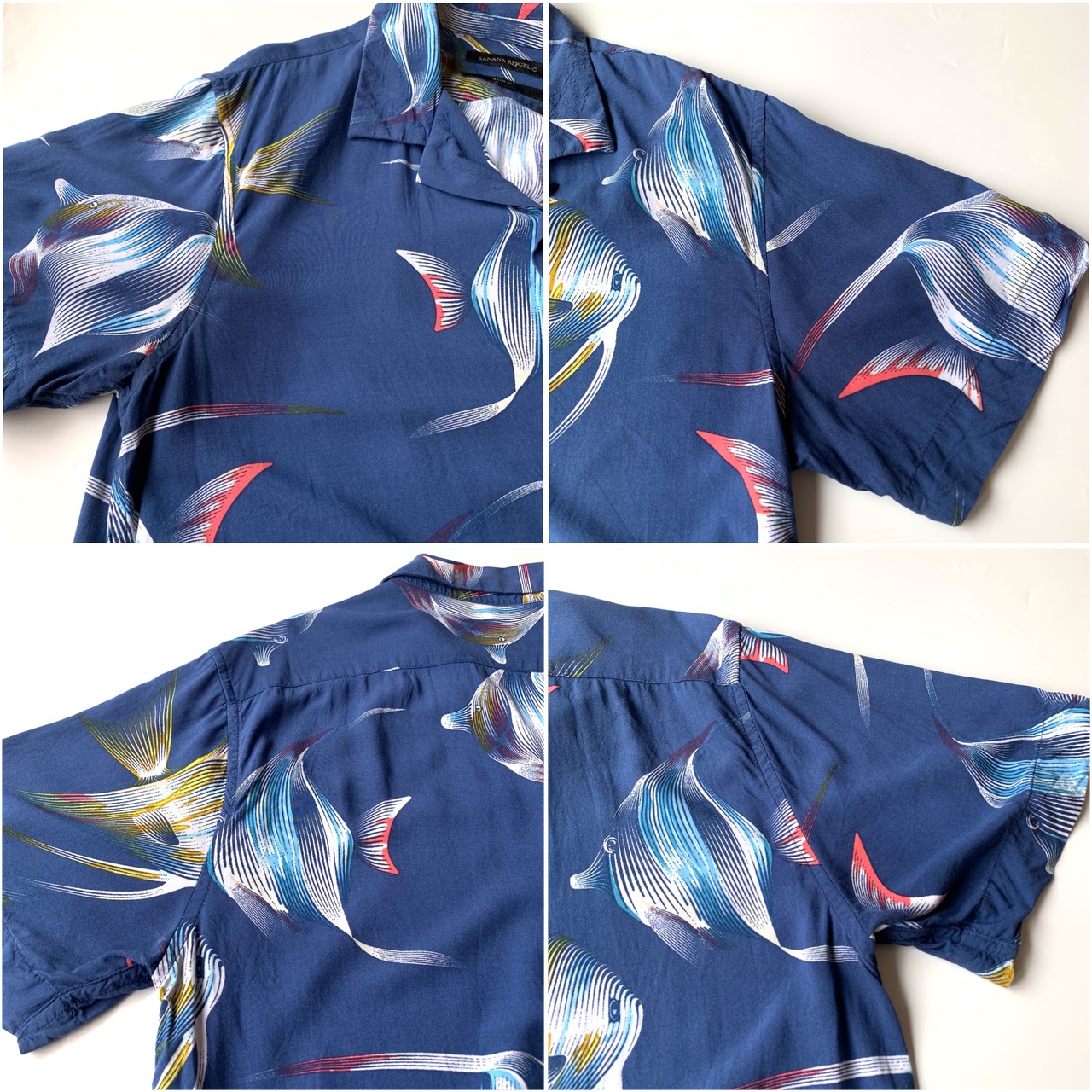 古いものではございませんが、レーヨン素材のオープンカラーでグッドデザインのアロハ。サイズ感も良好。この機会に是非。