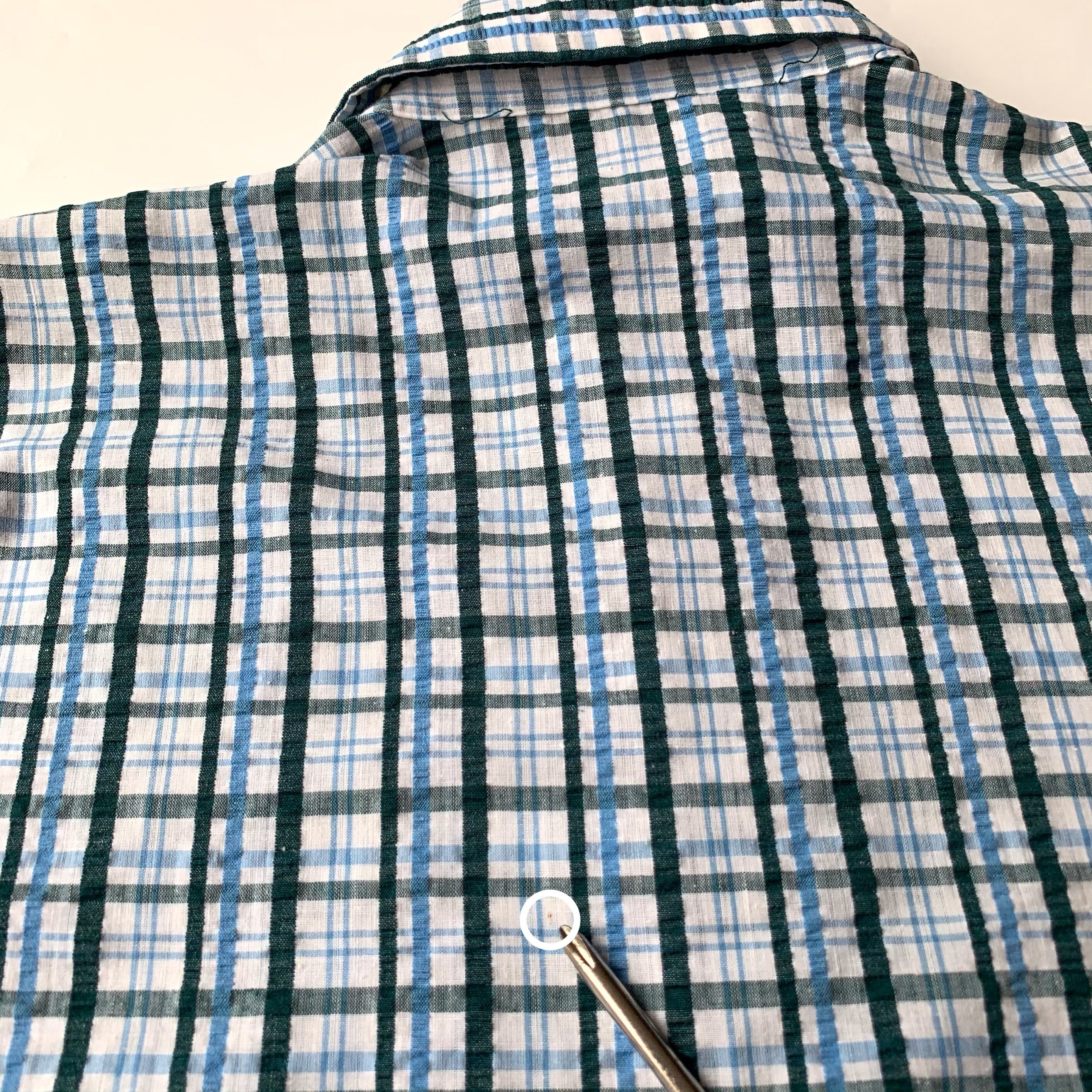 実寸はメンズM-L程度ですので多くの方が着れる良いサイズ感かと思います。この年代のタウンクラフトでポリシャツなどはよく見かけますが、コットンのシアサッカーはあまり見ない気がします。