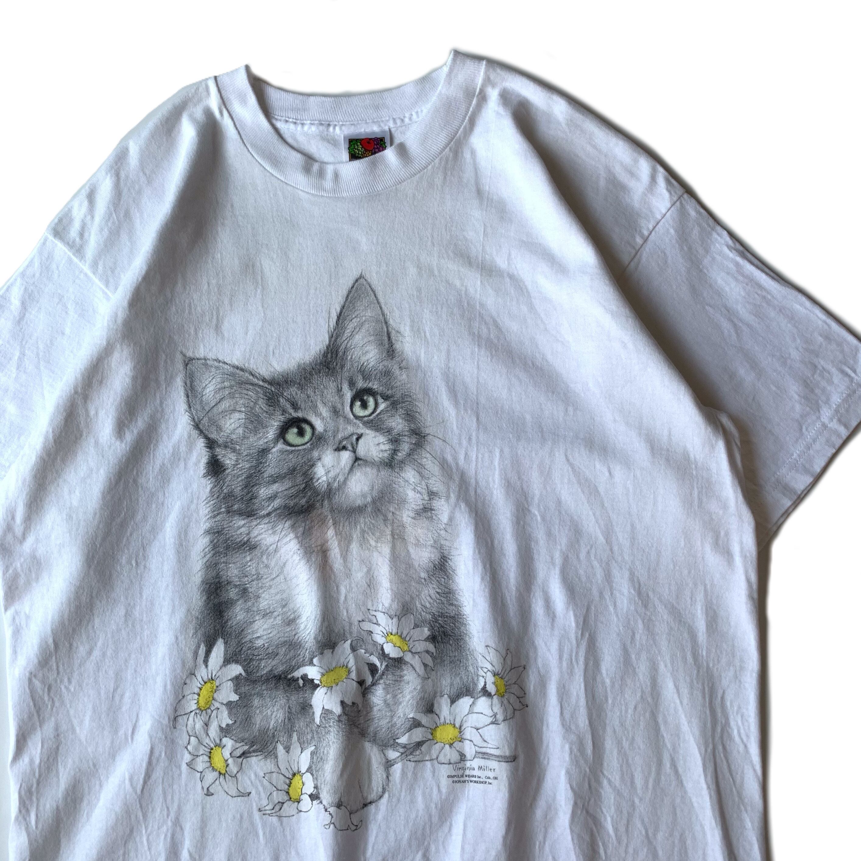 Virginia Millerによる可愛いらしい猫のアートTシャツ。プリント中央部に薄くシミがございますが、着てみればそこまで大きく目立たないかと思います。