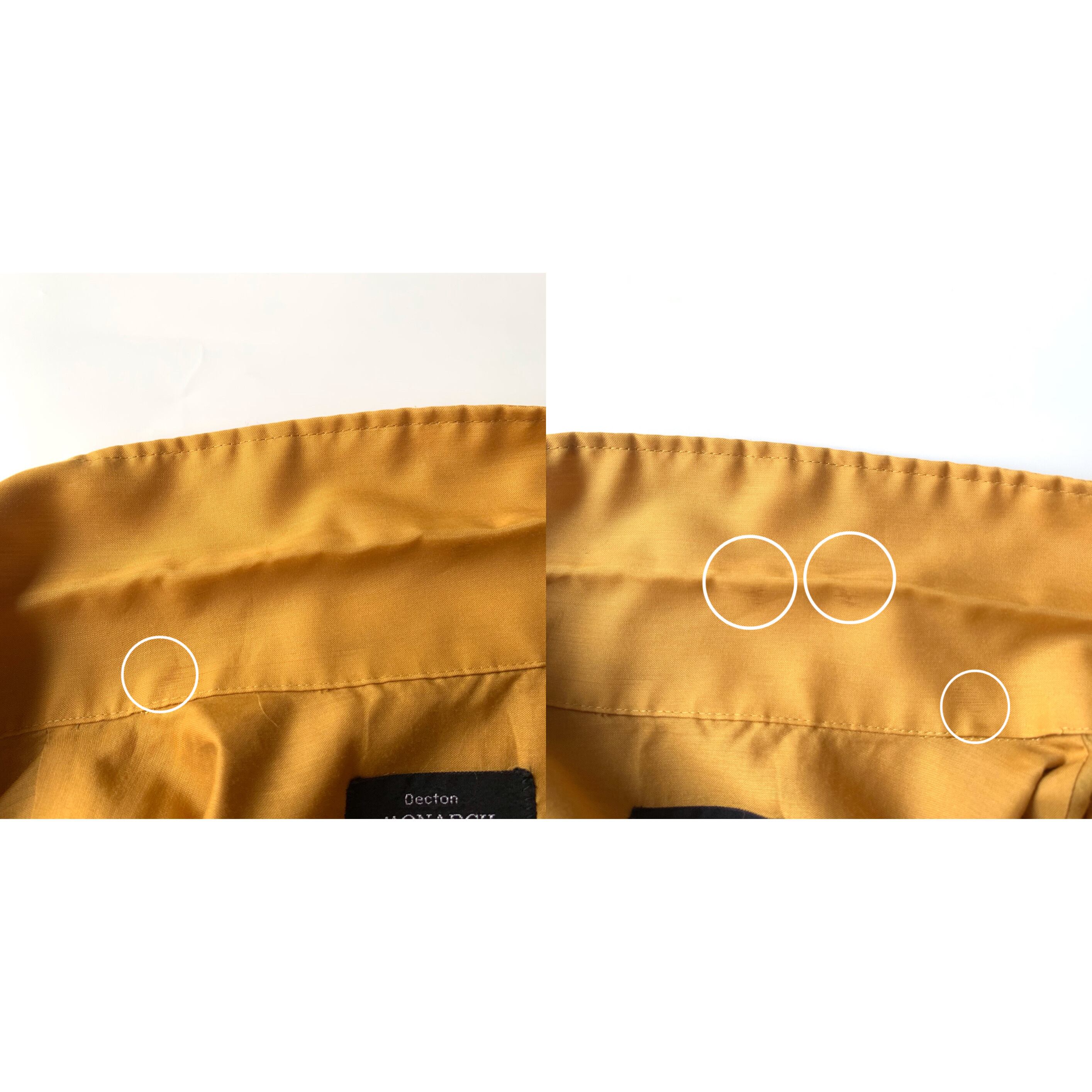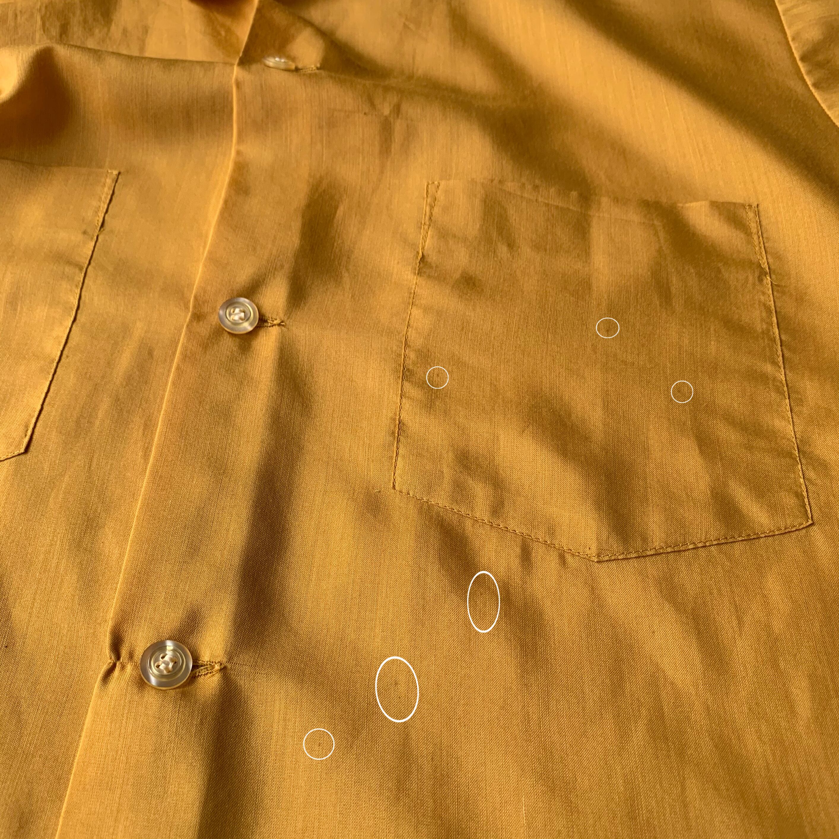 ポリコットンで光沢のある無地マスタードイエローカラー。ループ留めのオープンカラー。ボックス型のシルエット。両胸にはパッチポケットがございます。