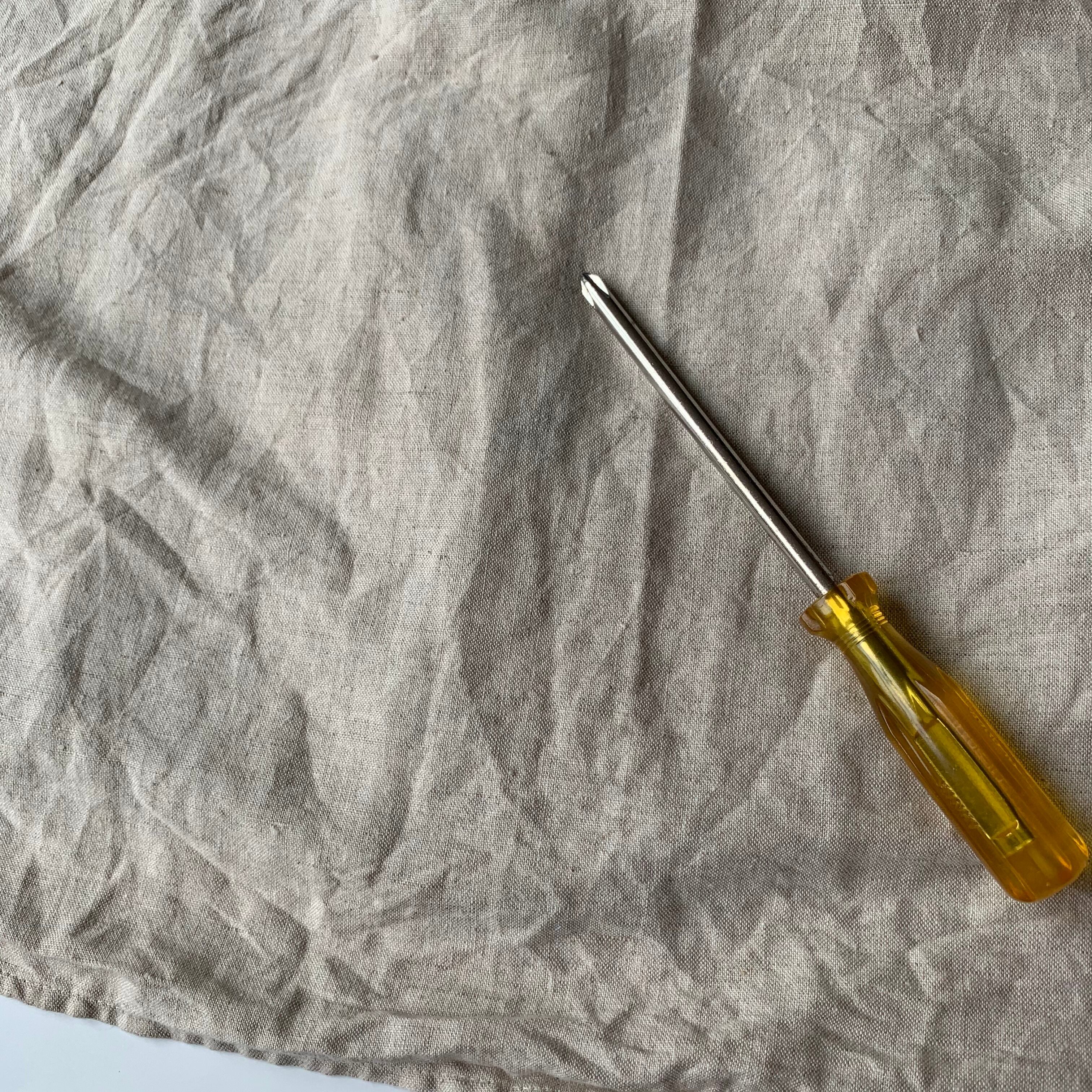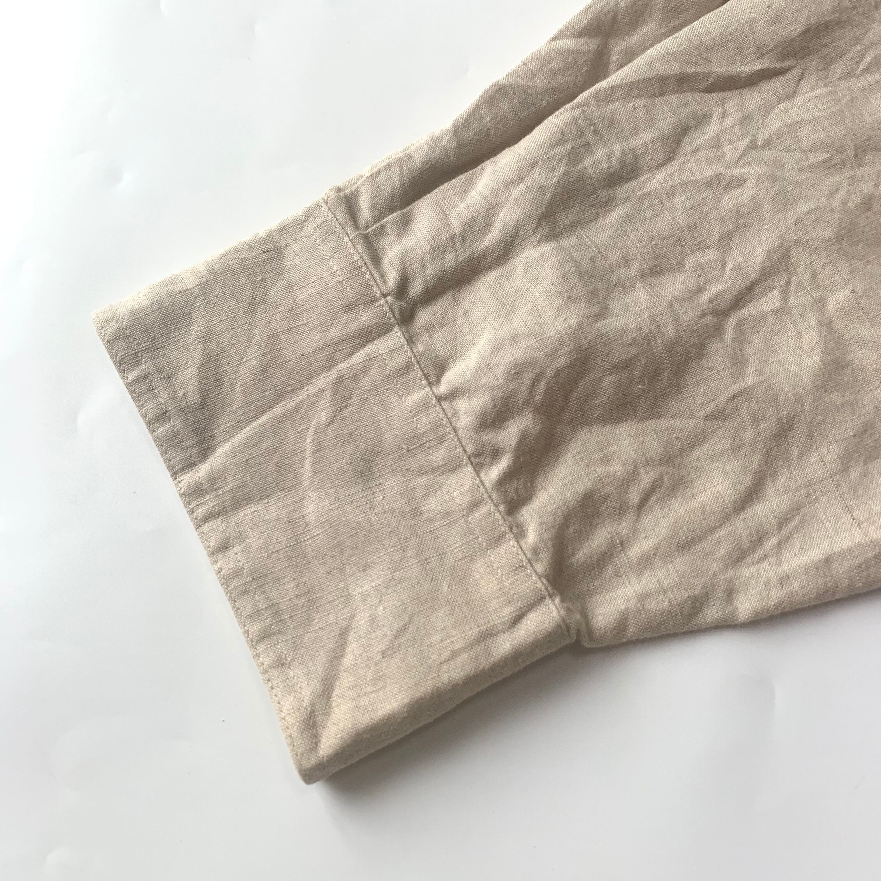 コットン×リネンの肌触りの良い生地感。所々に薄くシミがございますが、くすんだナチュラルカラーボディですので、あまり目立たないかと思います。