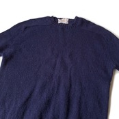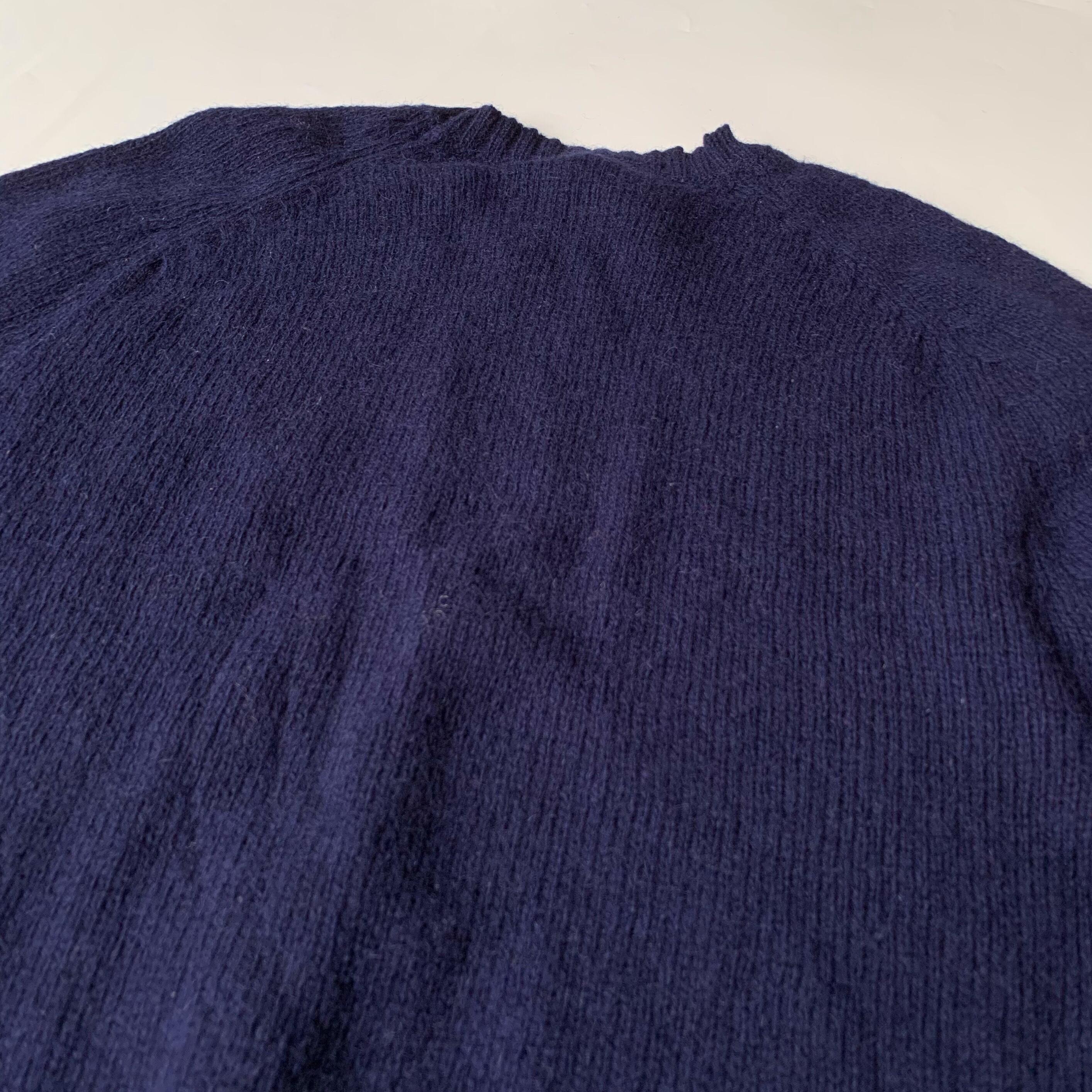 無地のネイビーボディ、シェットランドウールのフワッとした肌触り。過酷な環境で育った羊毛は非常に柔らかく光沢がございます。