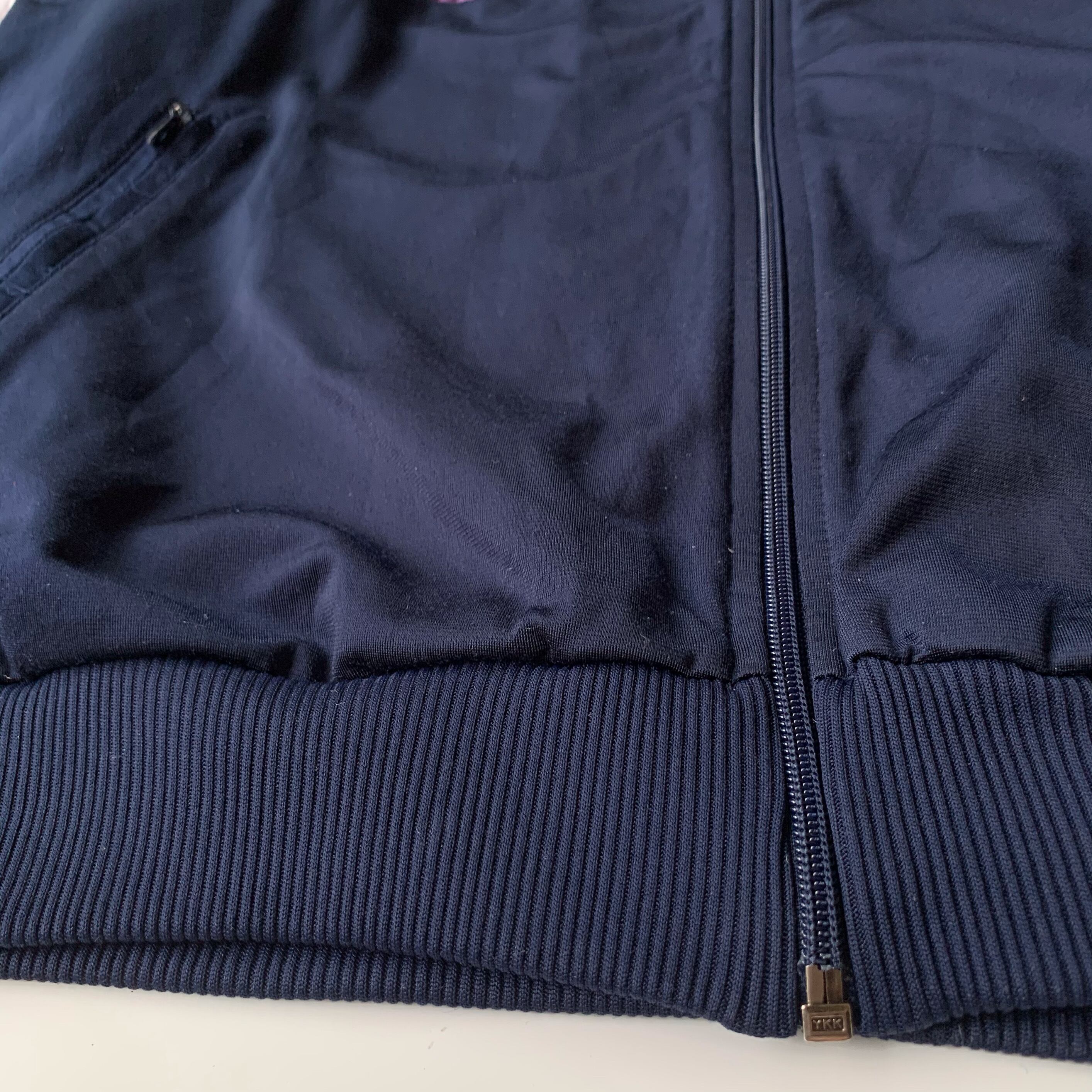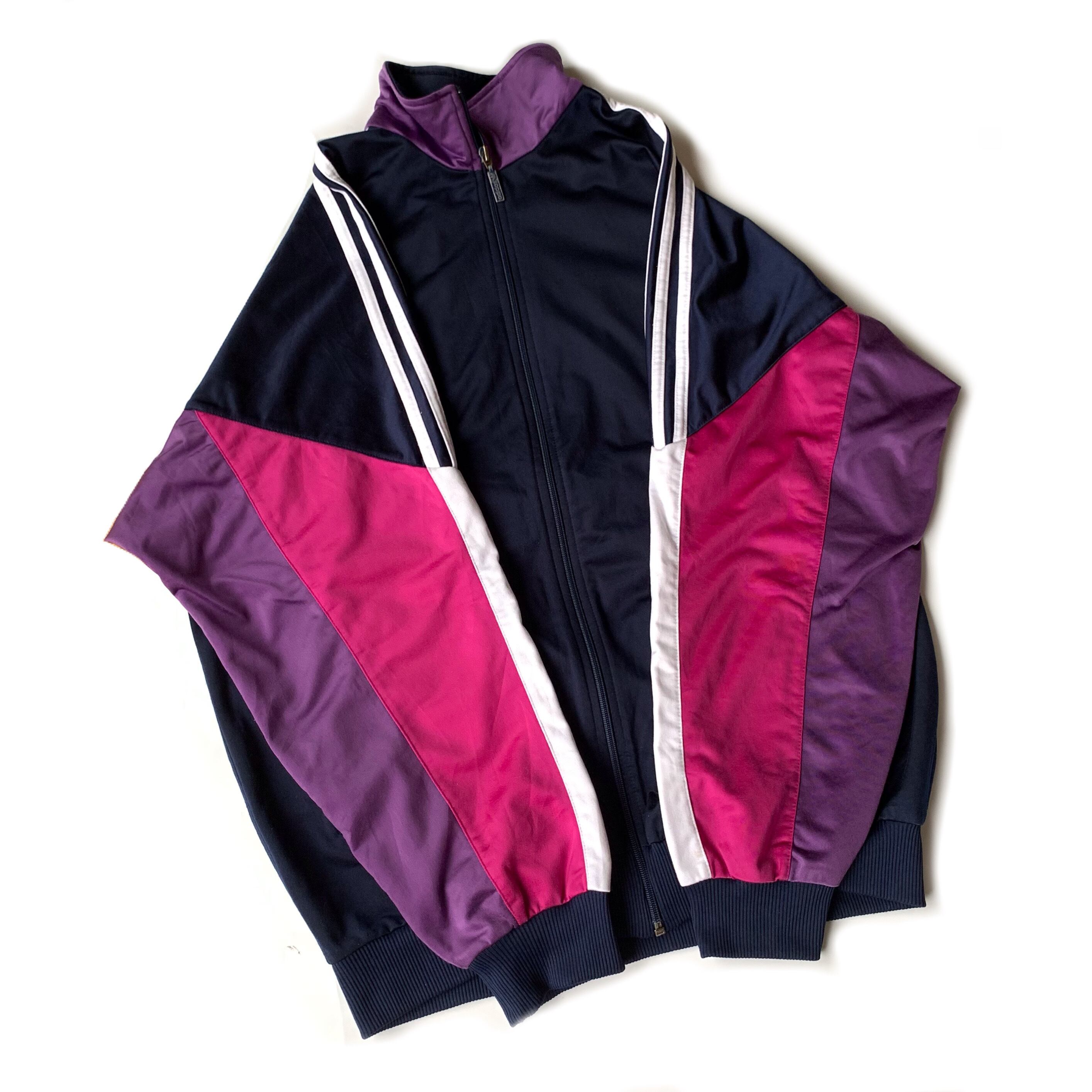 アームホールから袖にかけてのデザインがこの年代のadidasらしいですね。グラデーションの効いたパープルと三本ラインが組み合わさったデザイン。切れ込みの入ったような形をした縫製ポターンも面白いですね。