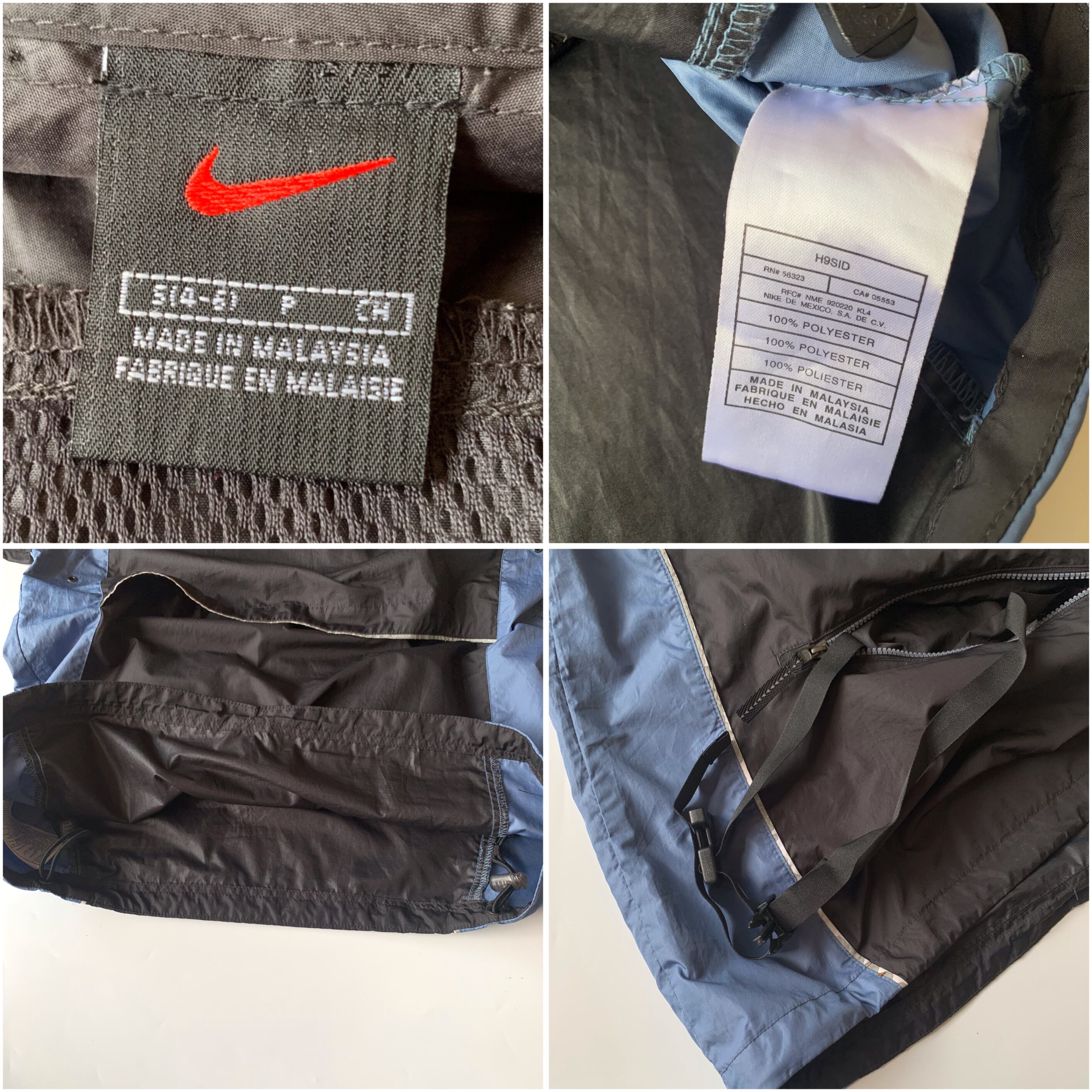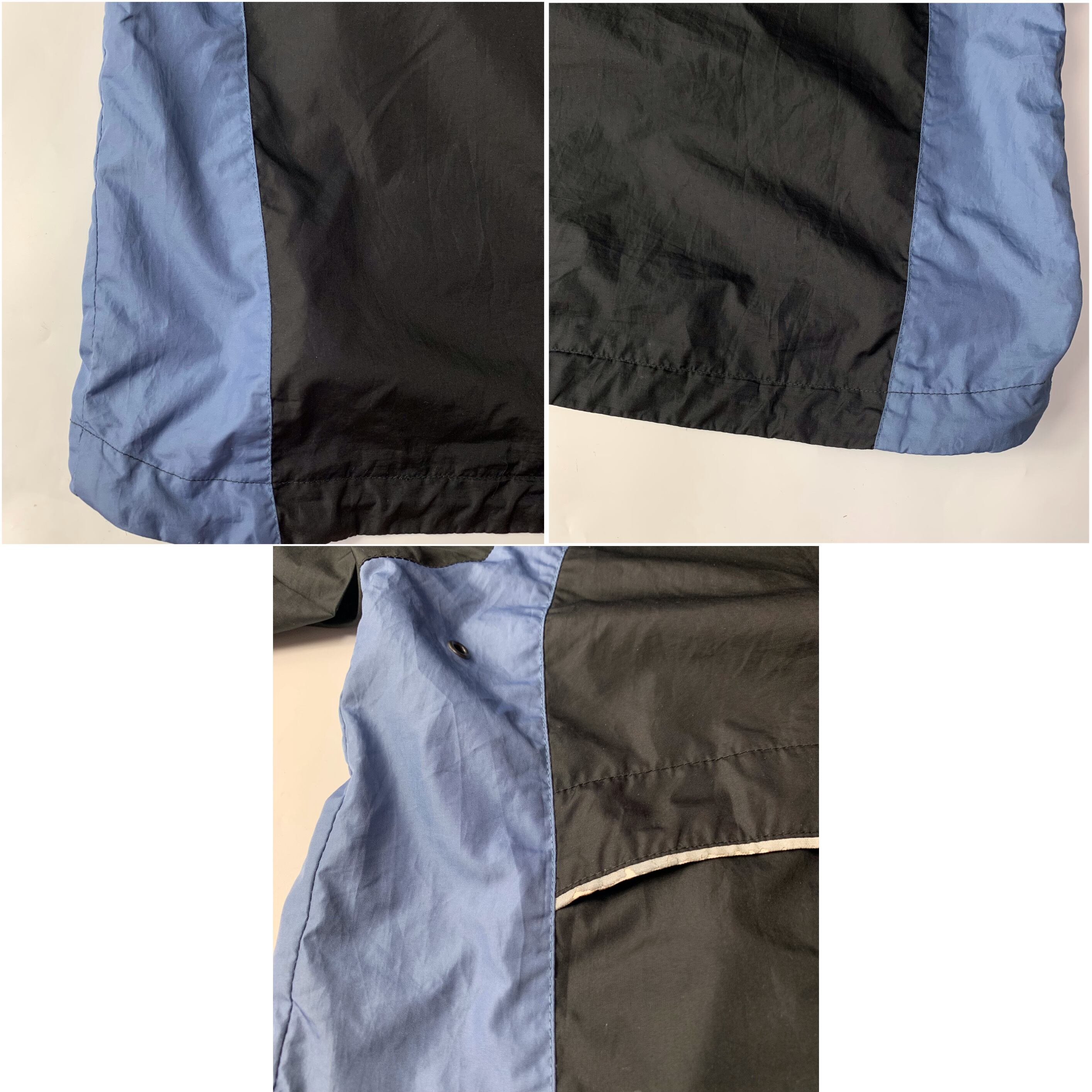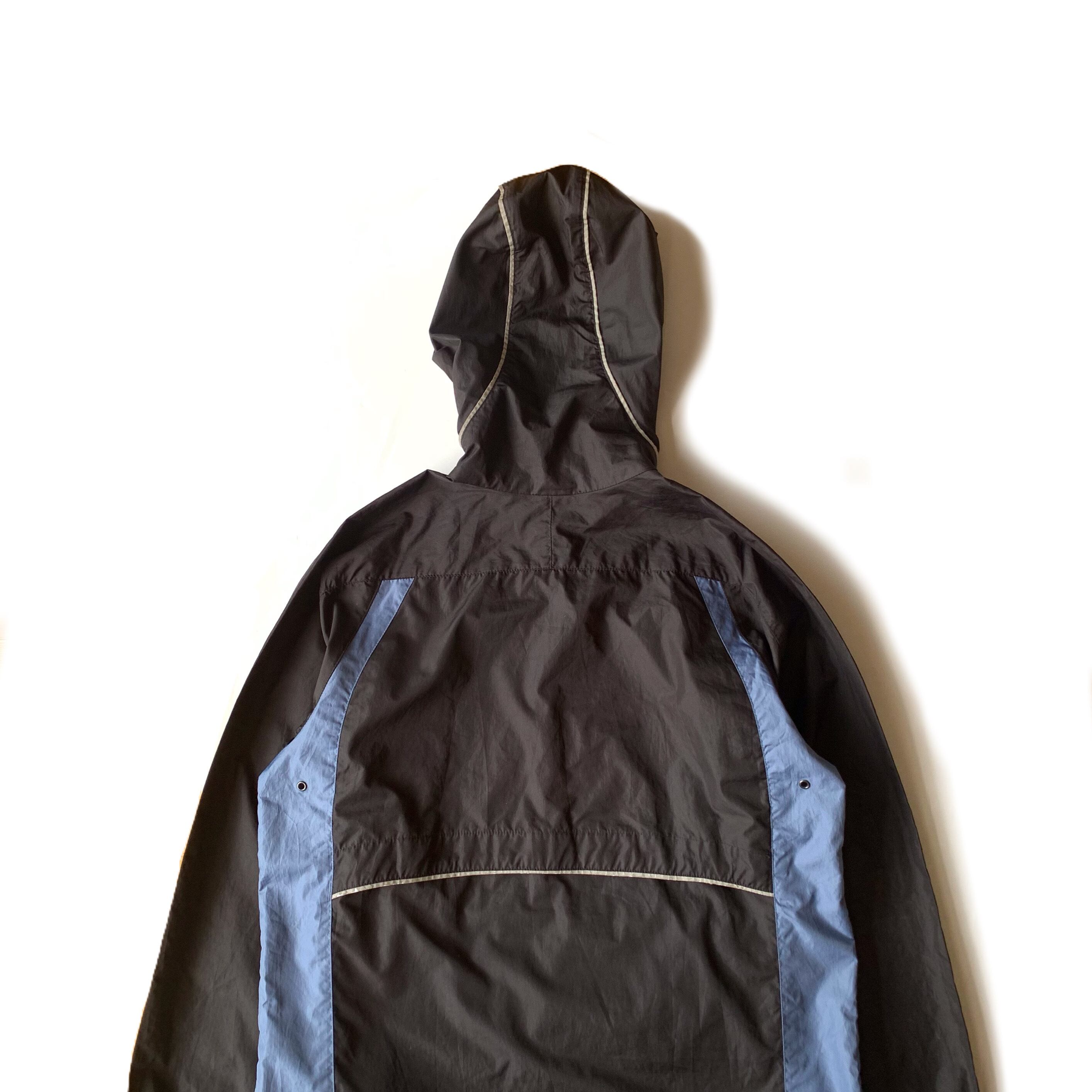 ポリエステル素材で少しテロっとした生地感。フロントポケット内にはサイドリリースバッカルがございます。裾やフードにはドローコード付きです。