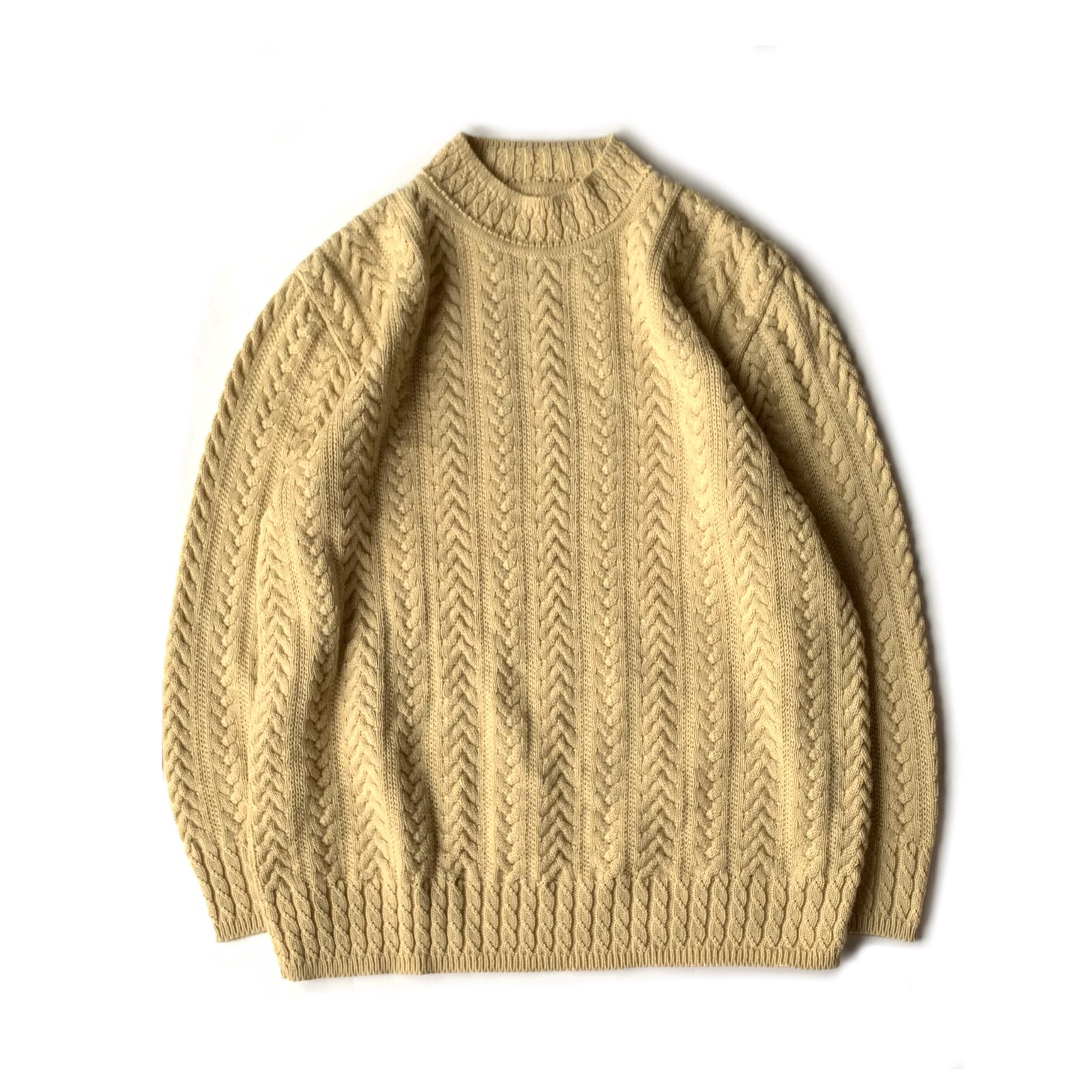 薄く黄色味がかったハイネックタイプのボディ。裾に連なるケーブル編みから上品さ漂います。