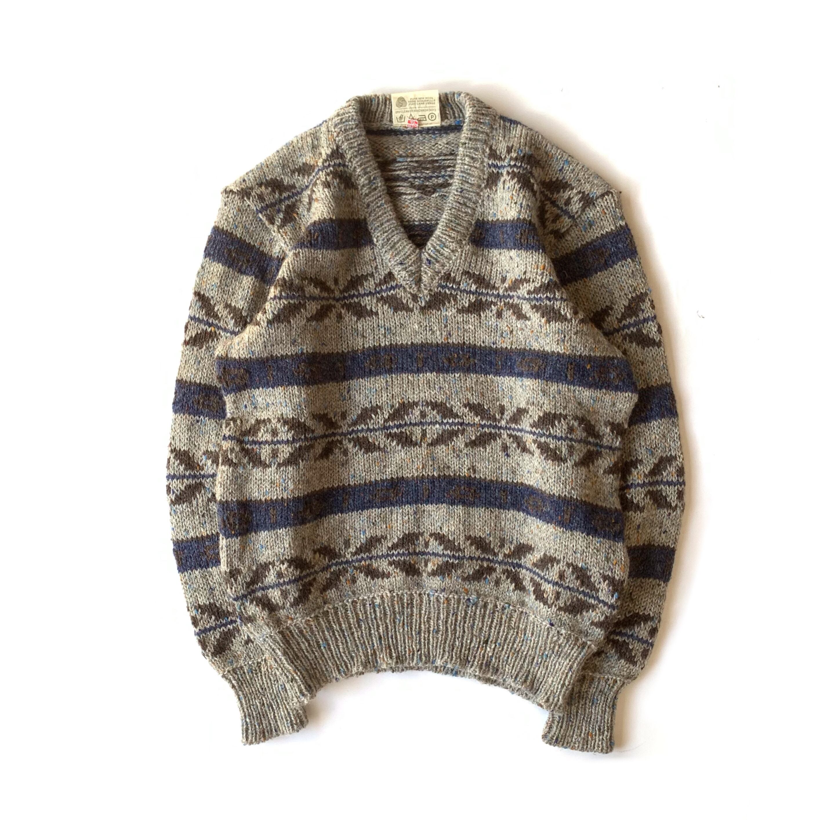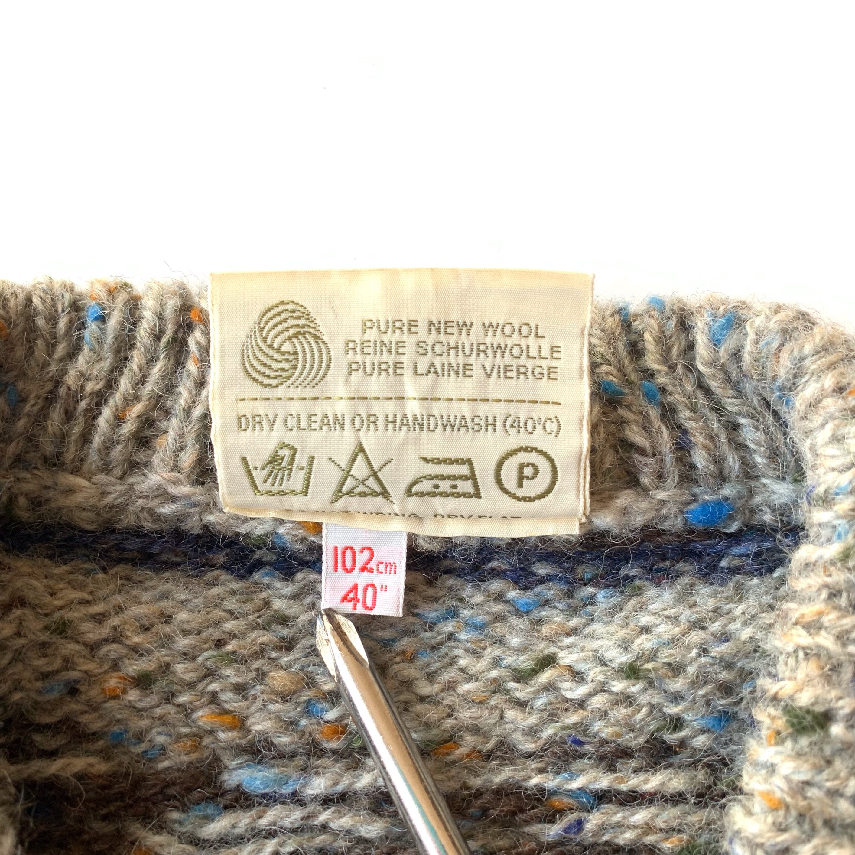 総柄にネップが飛ぶ1着。太めの毛糸で立体感があり、見た目も暖かいですし着用するとさらに暖かみがあります。
