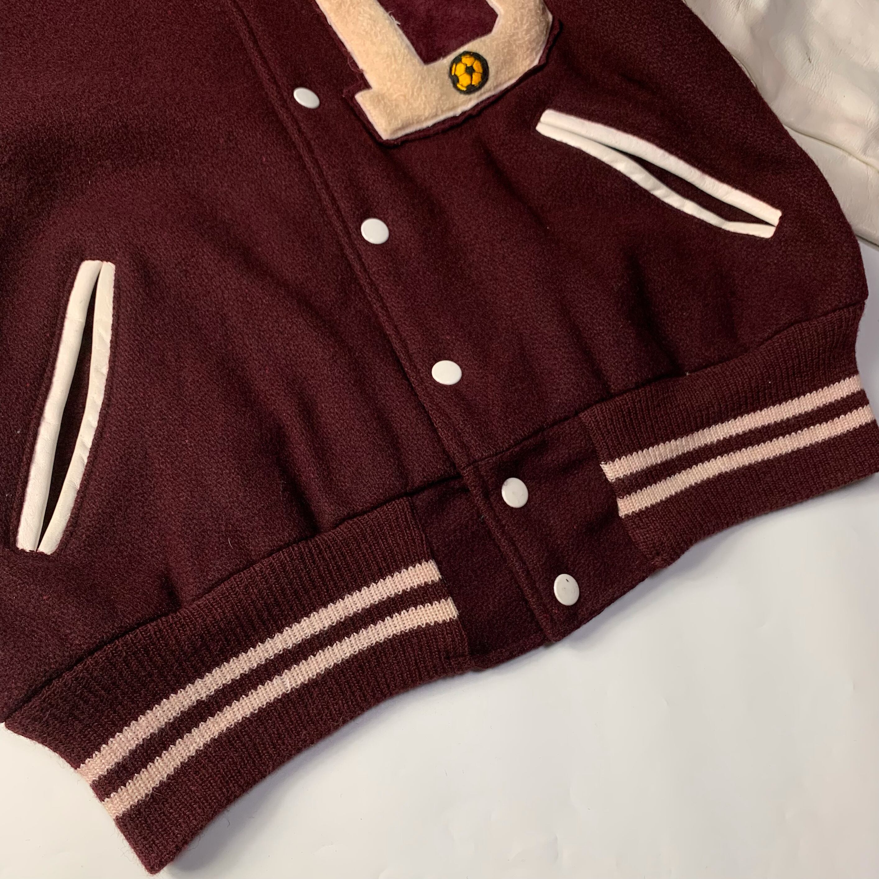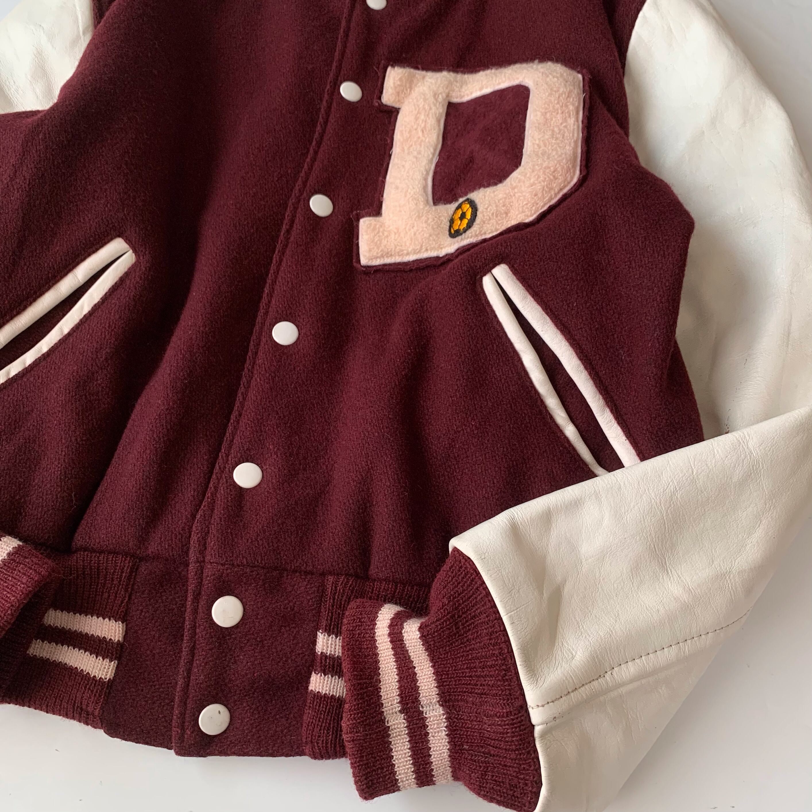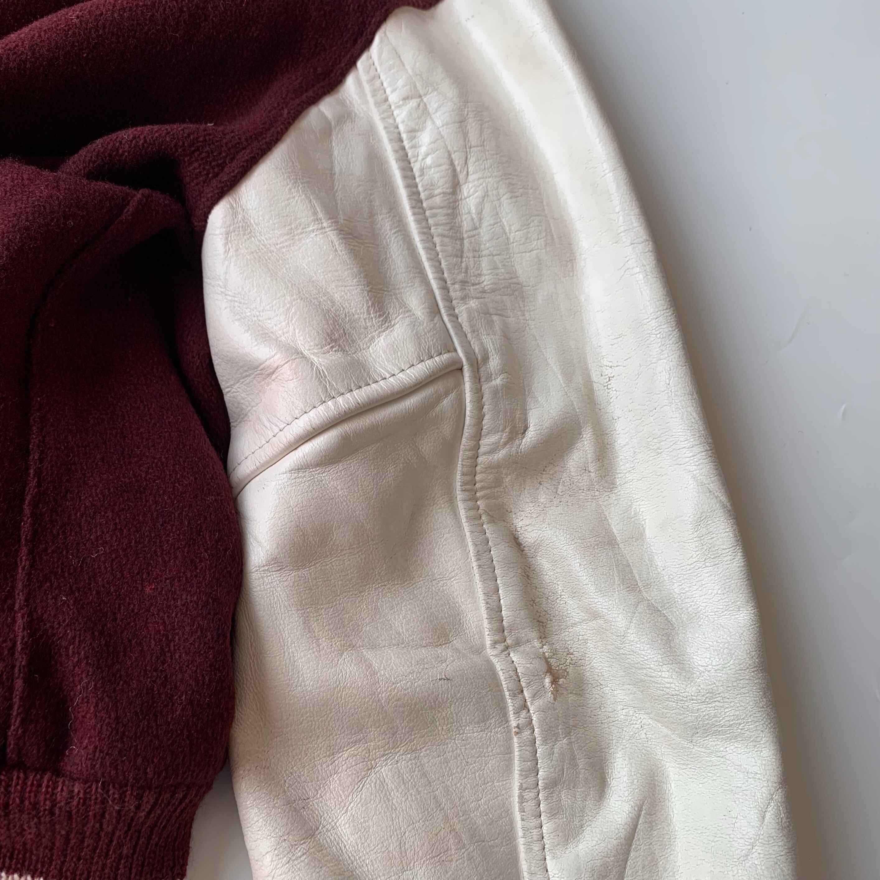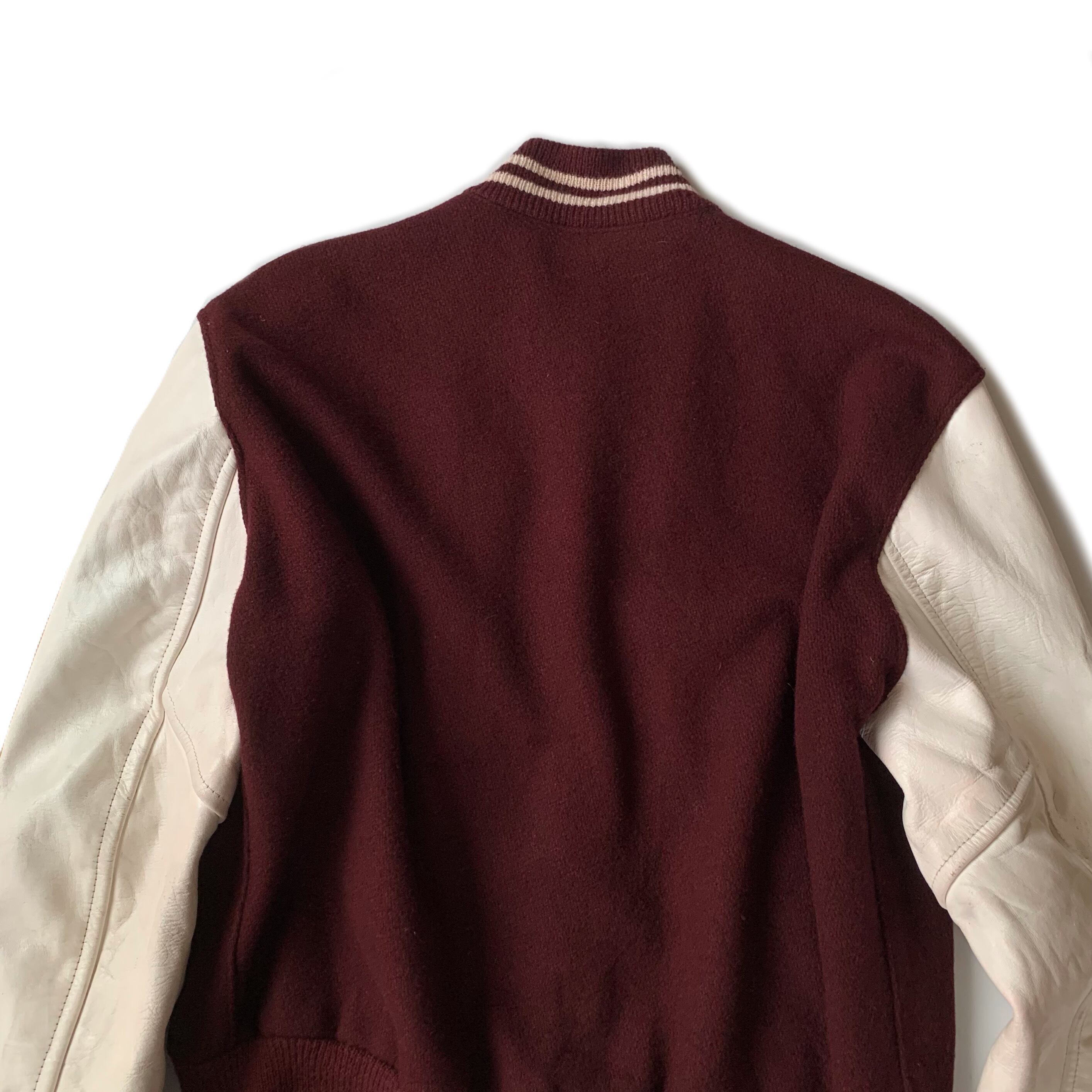 バーガンディ×ホワイトの古着らしい配色。温かみのあるメルトンウール、袖はレザー。