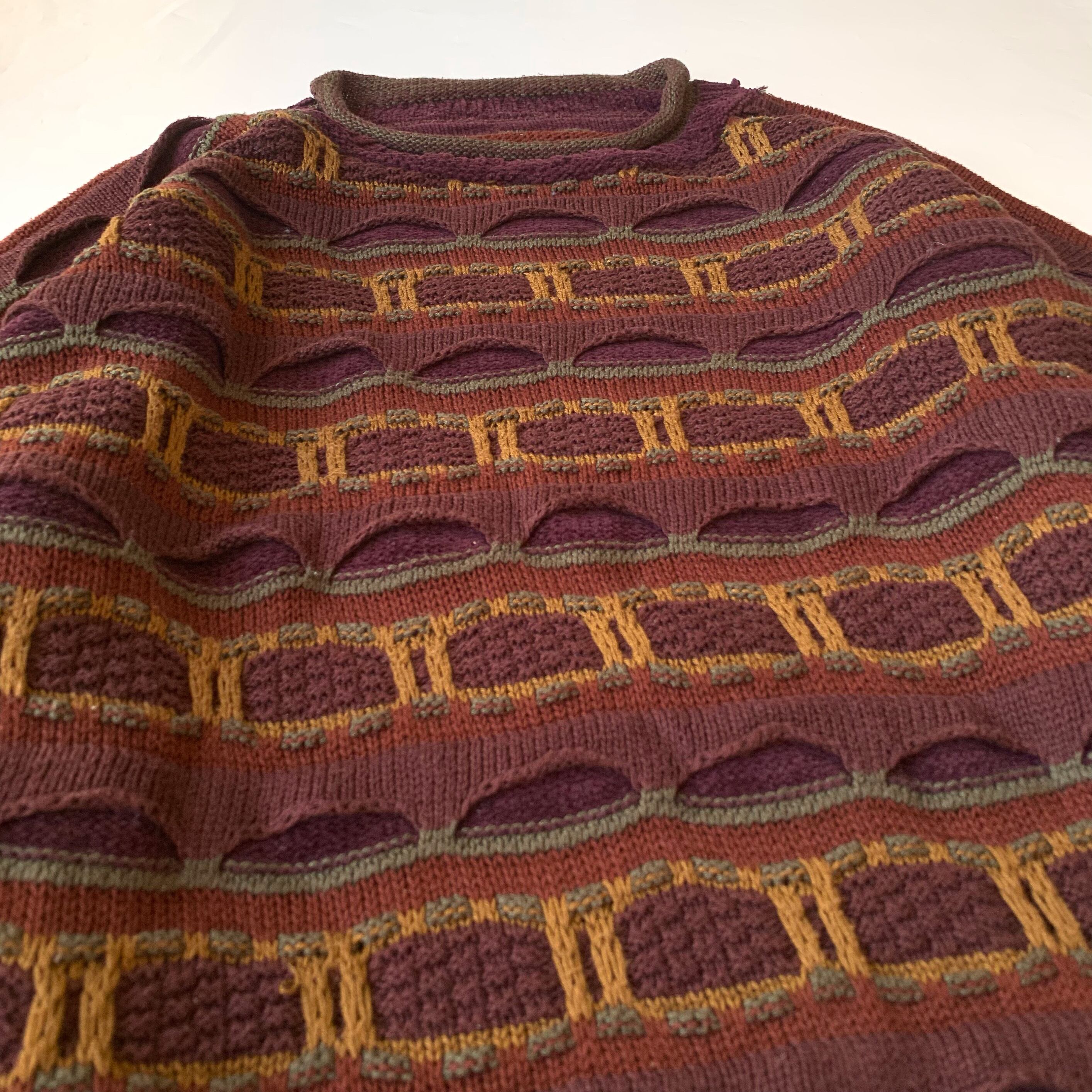 立体的な編地とダークトーンの配色が特徴的な一枚。