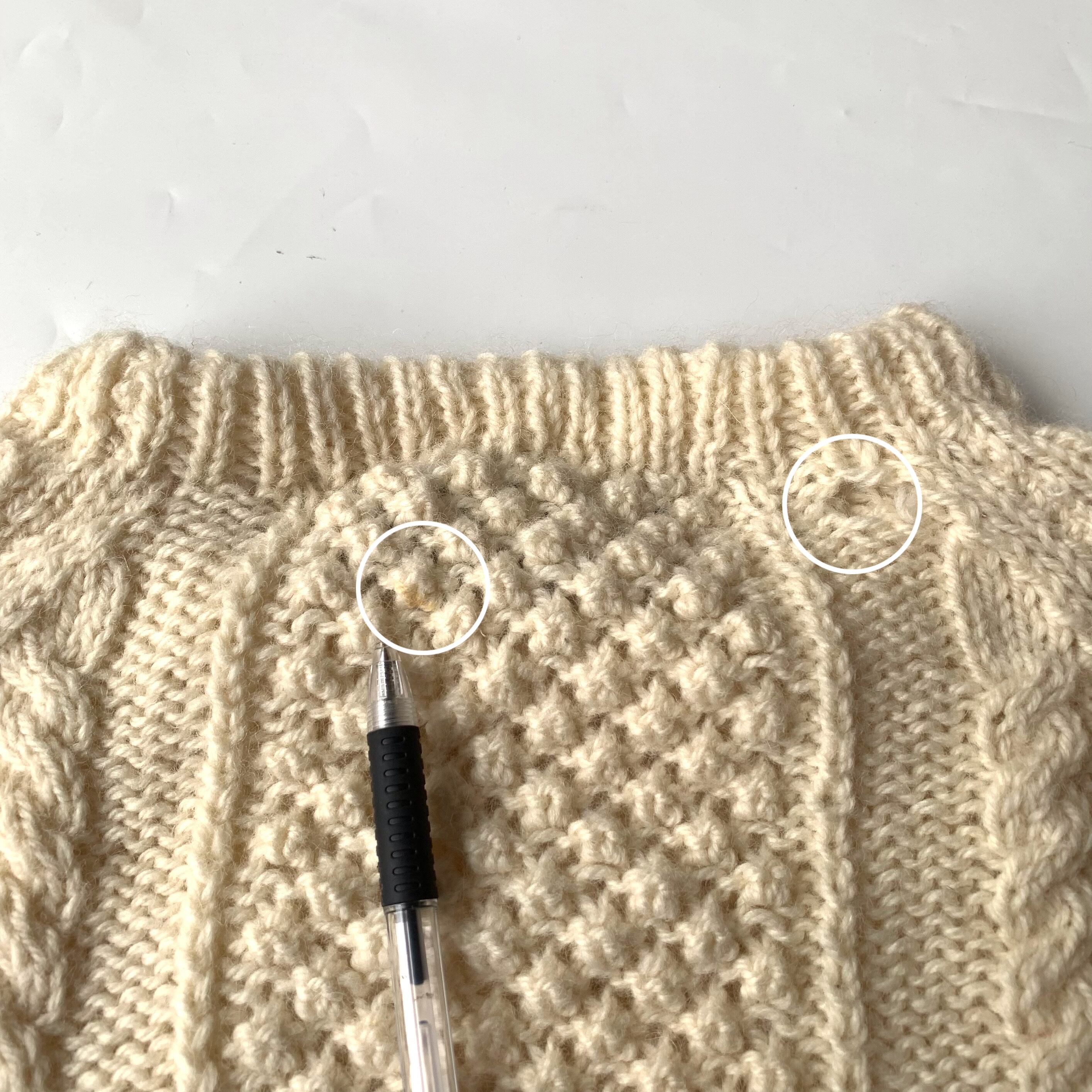裾に連なった編みが特徴的で、着心地はさほど重くなく快適にご着用いただけます。ケーブル編み×ポップコーン編みが組み合わさった丁寧な作り。