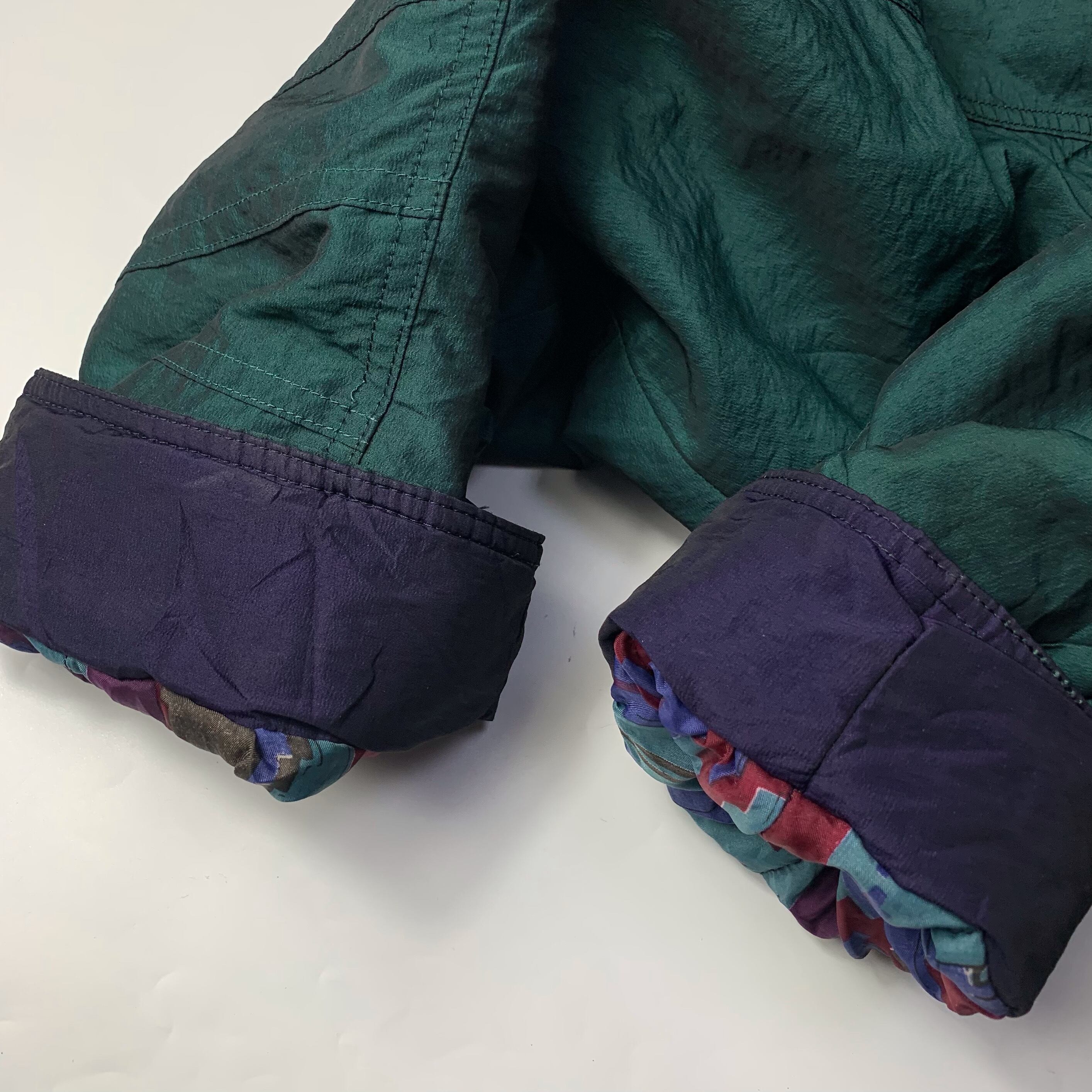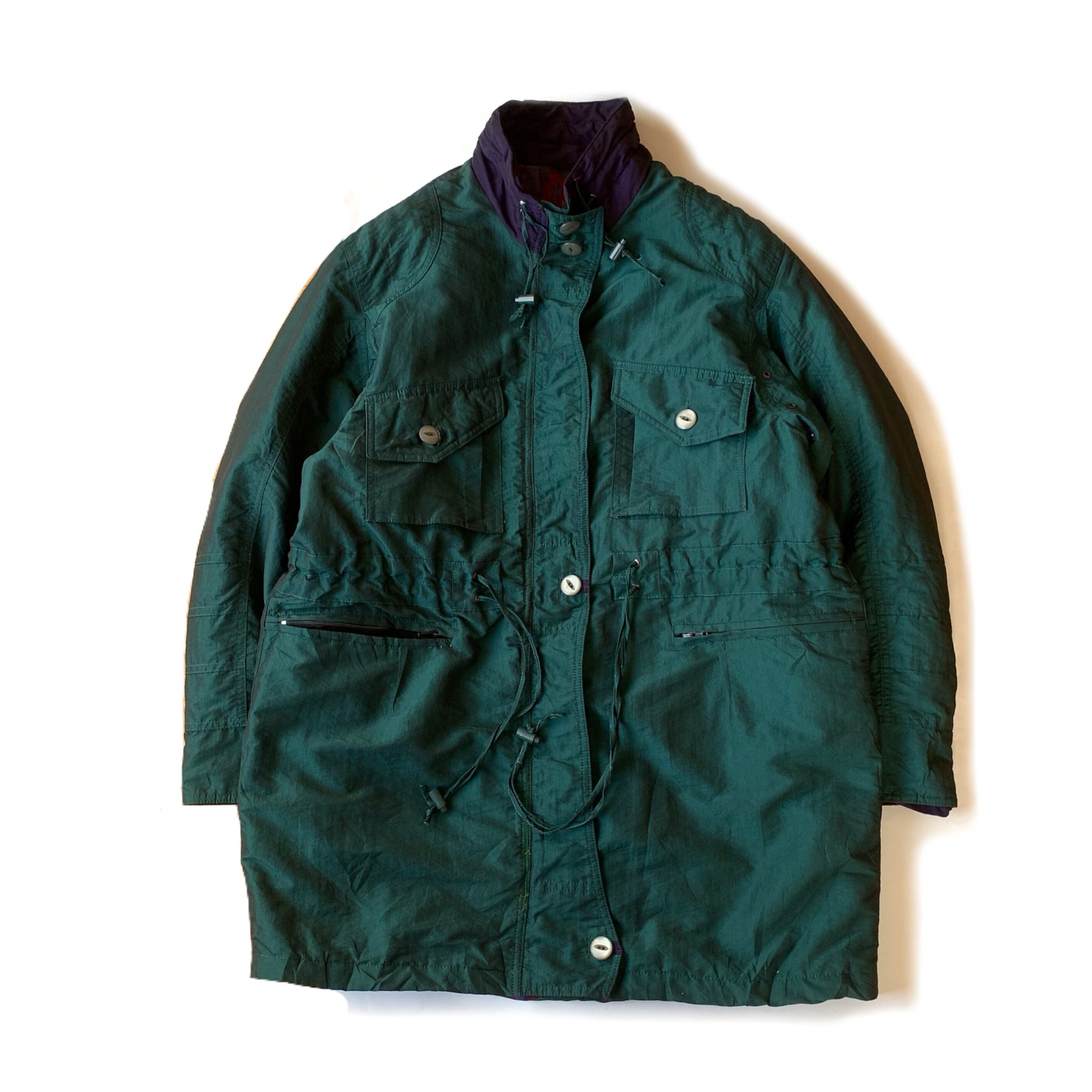 ルーマニア製の中綿ジャケット。光沢のあるグリーンカラーで、襟元や裏地のパープルカラーの切り替えしも目を引きます。