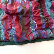 幾何学的なインパクトのある裏地。中からも開けられるように内側にもジッパーがございますので、リバーシブルのように着ても良いかと。