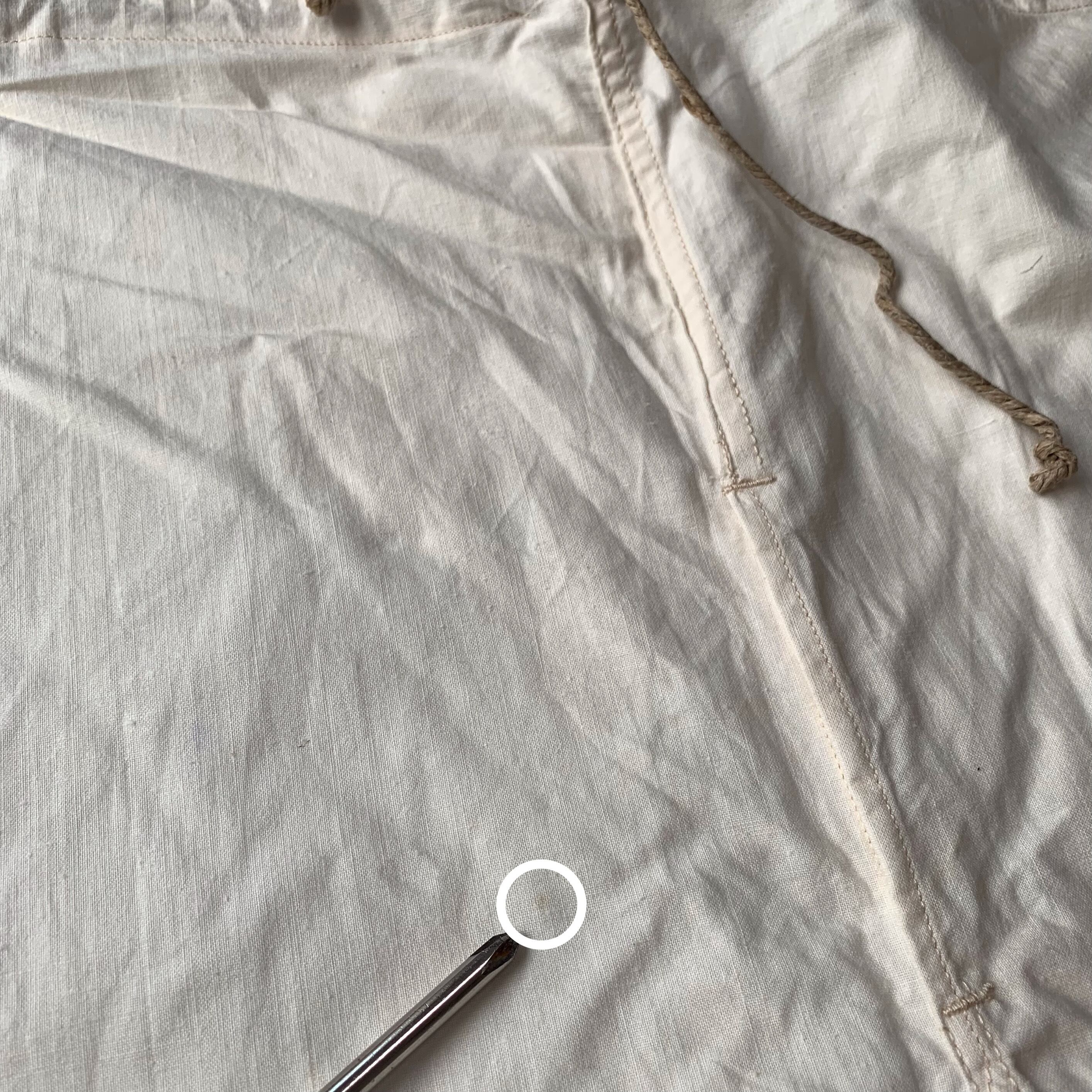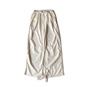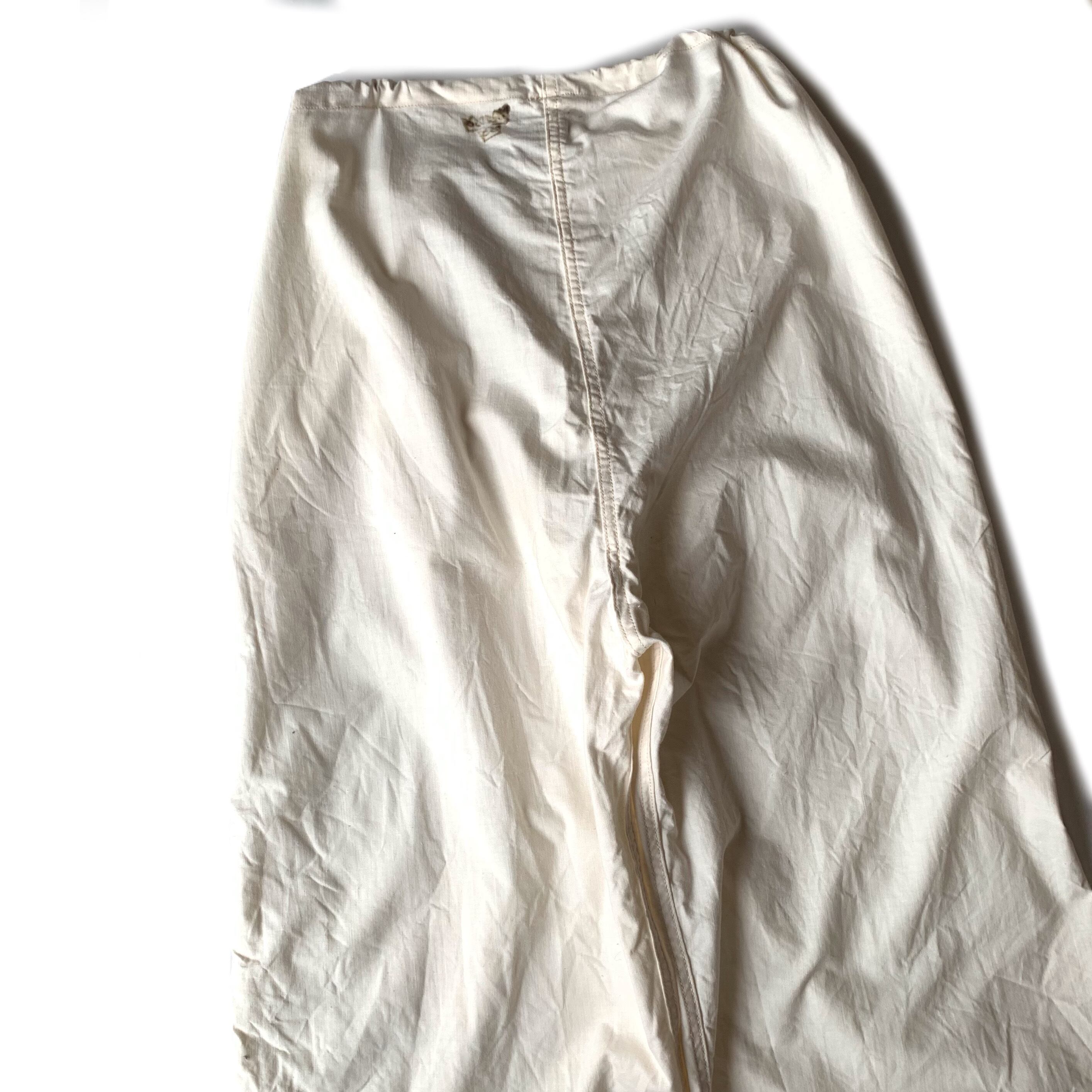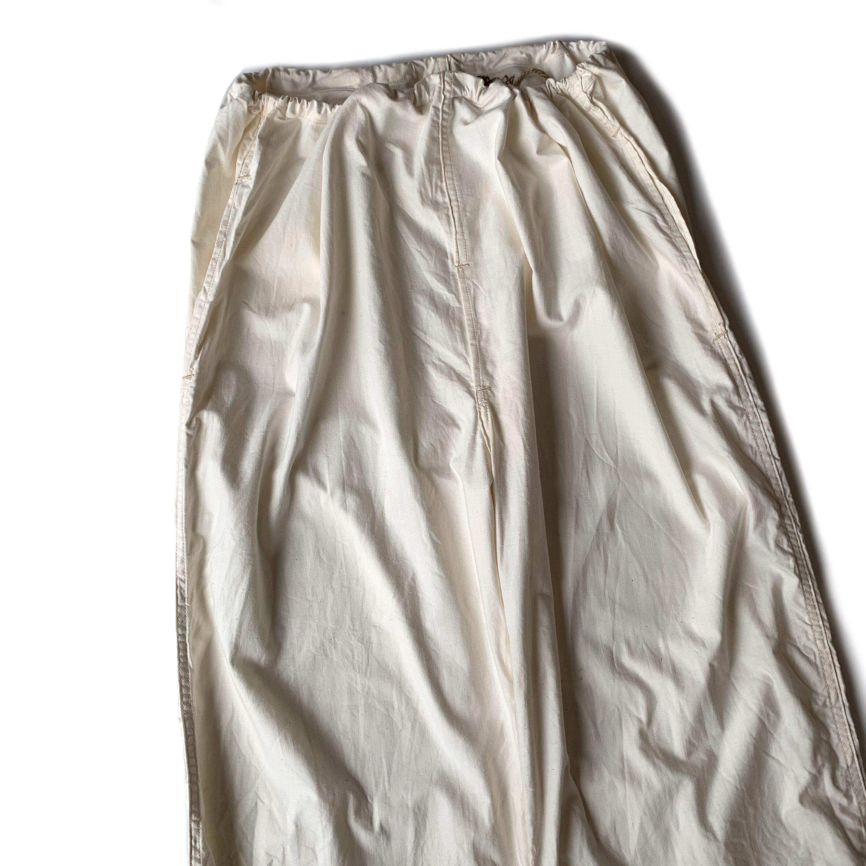 服地はコットンの平織り、軽量かつ薄手。オーバーパンツということで非常にゆとりのあるシルエットですので中にたくさん着込むこともできシーズンを選ばずに着用可能です。