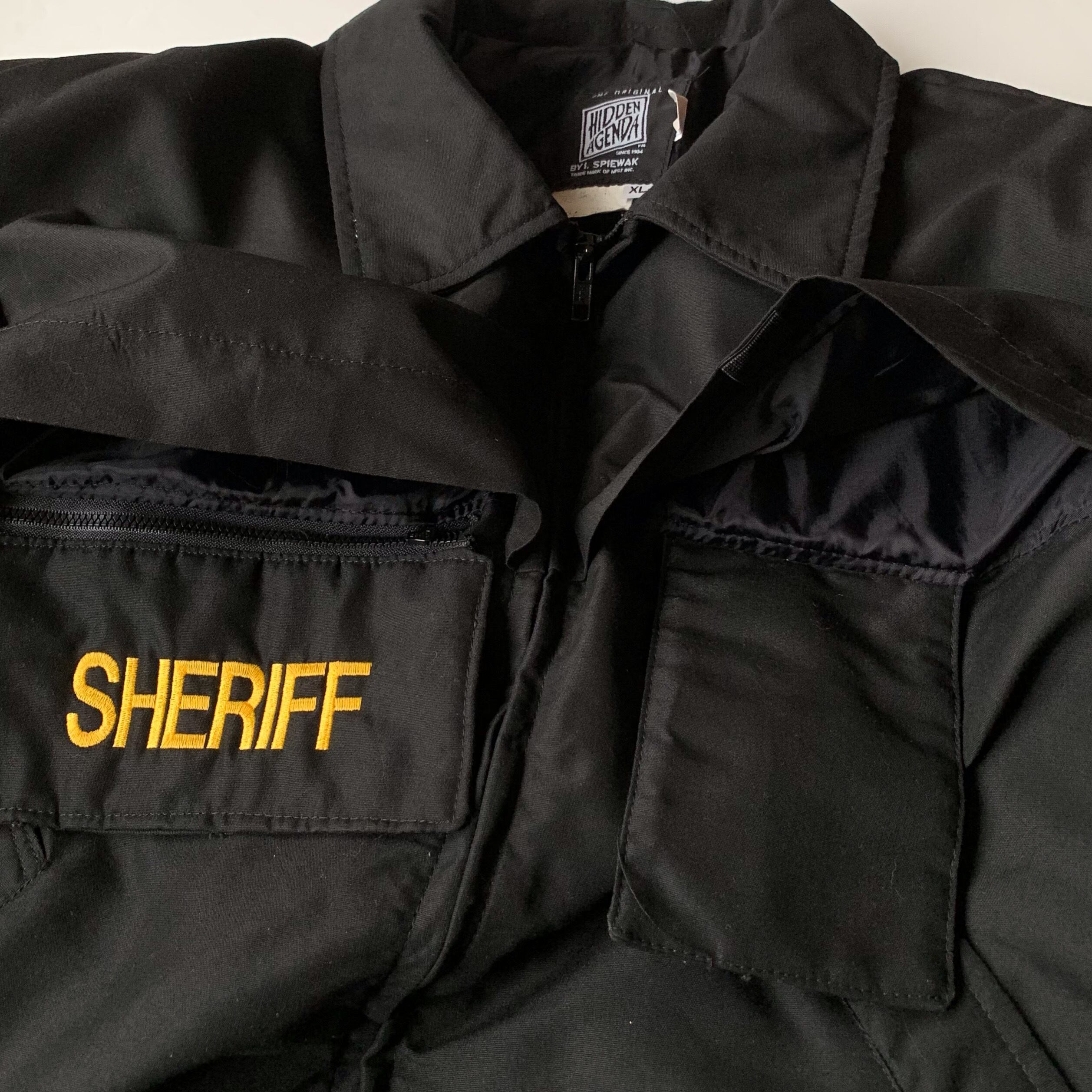フロント、バックともに、ベルクロが隠された比翼仕様です。”SHERIFF(軍保安官)”の刺繍。