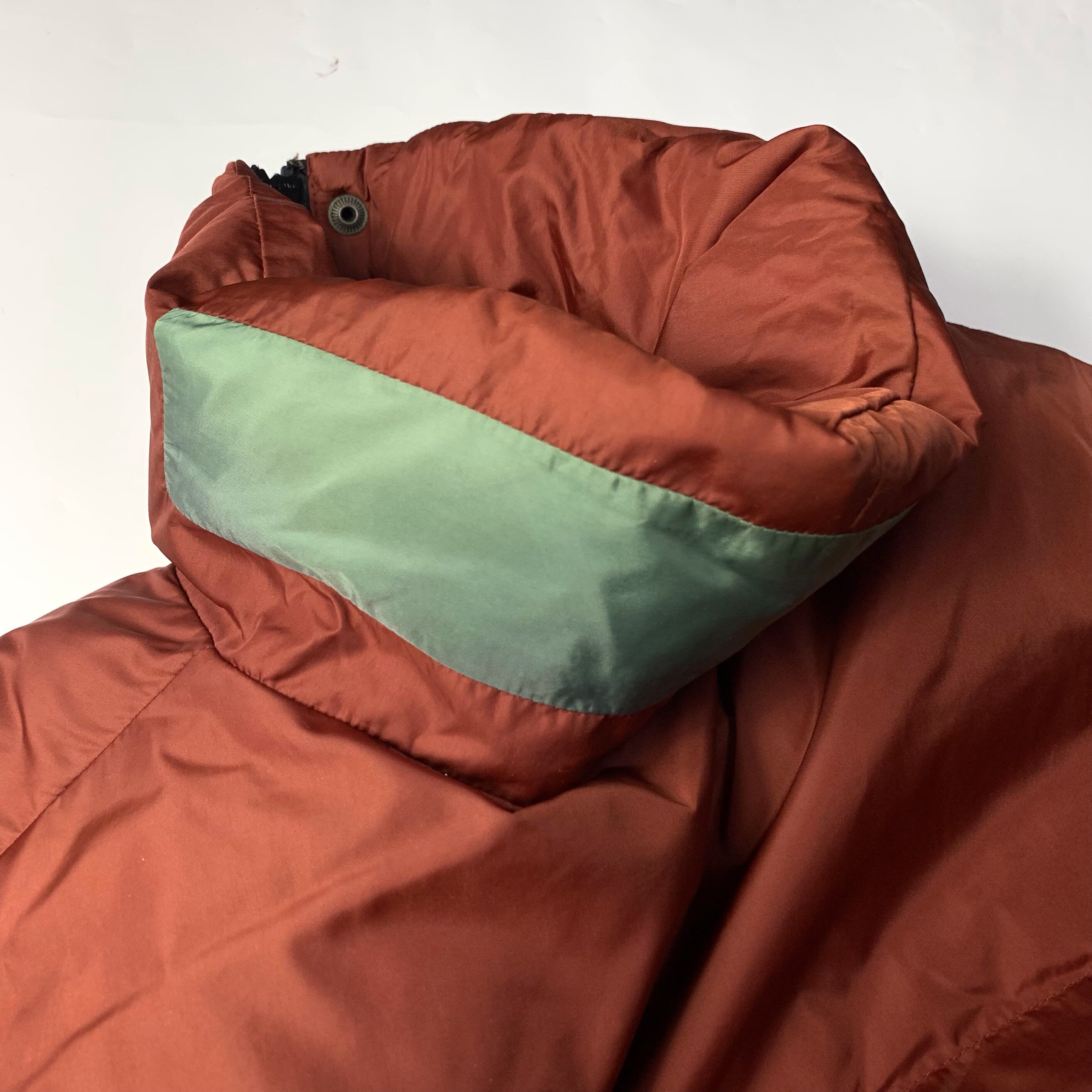 肉厚でフカフカなダウン。ダークオレンジと襟裏グレーのさりげないツートーン。