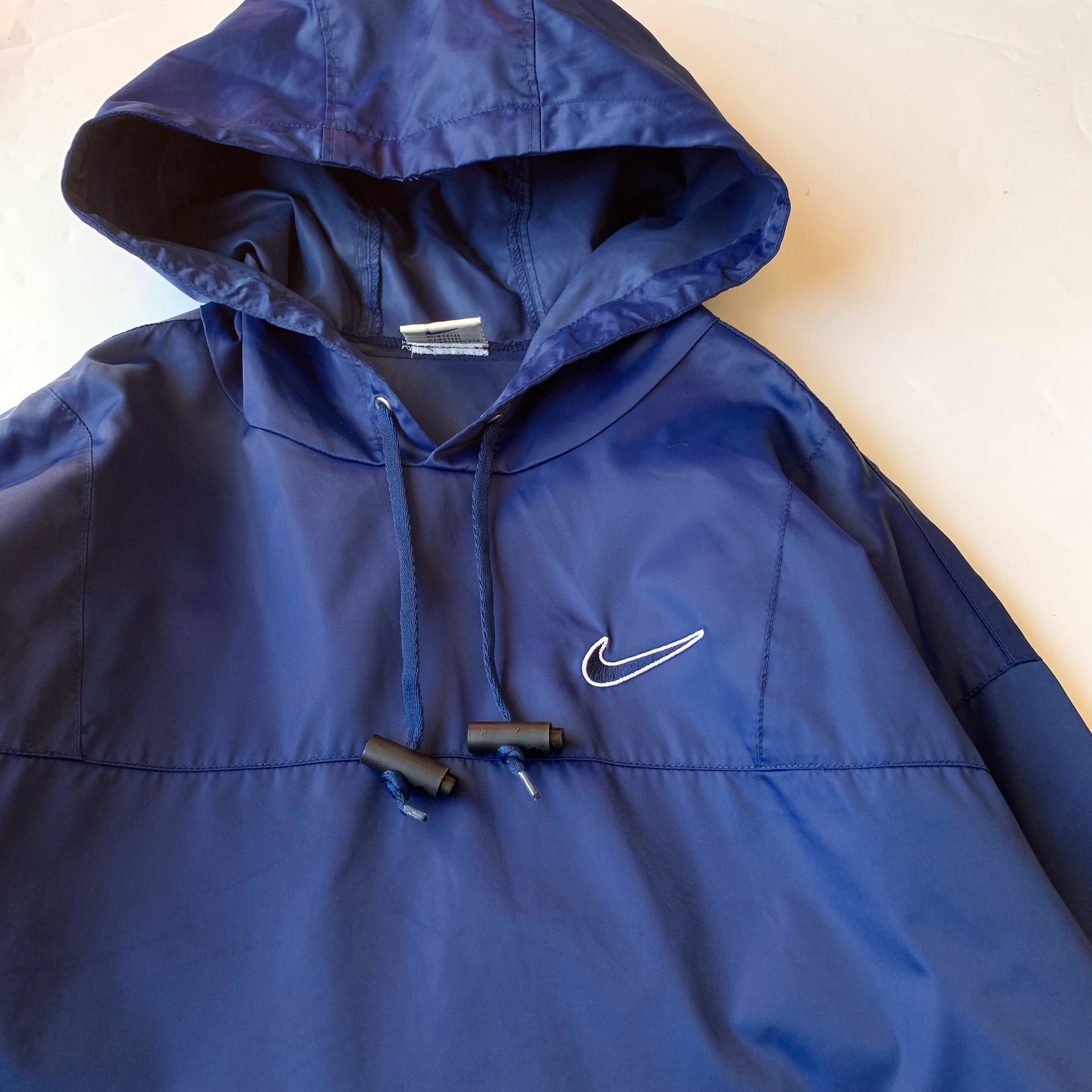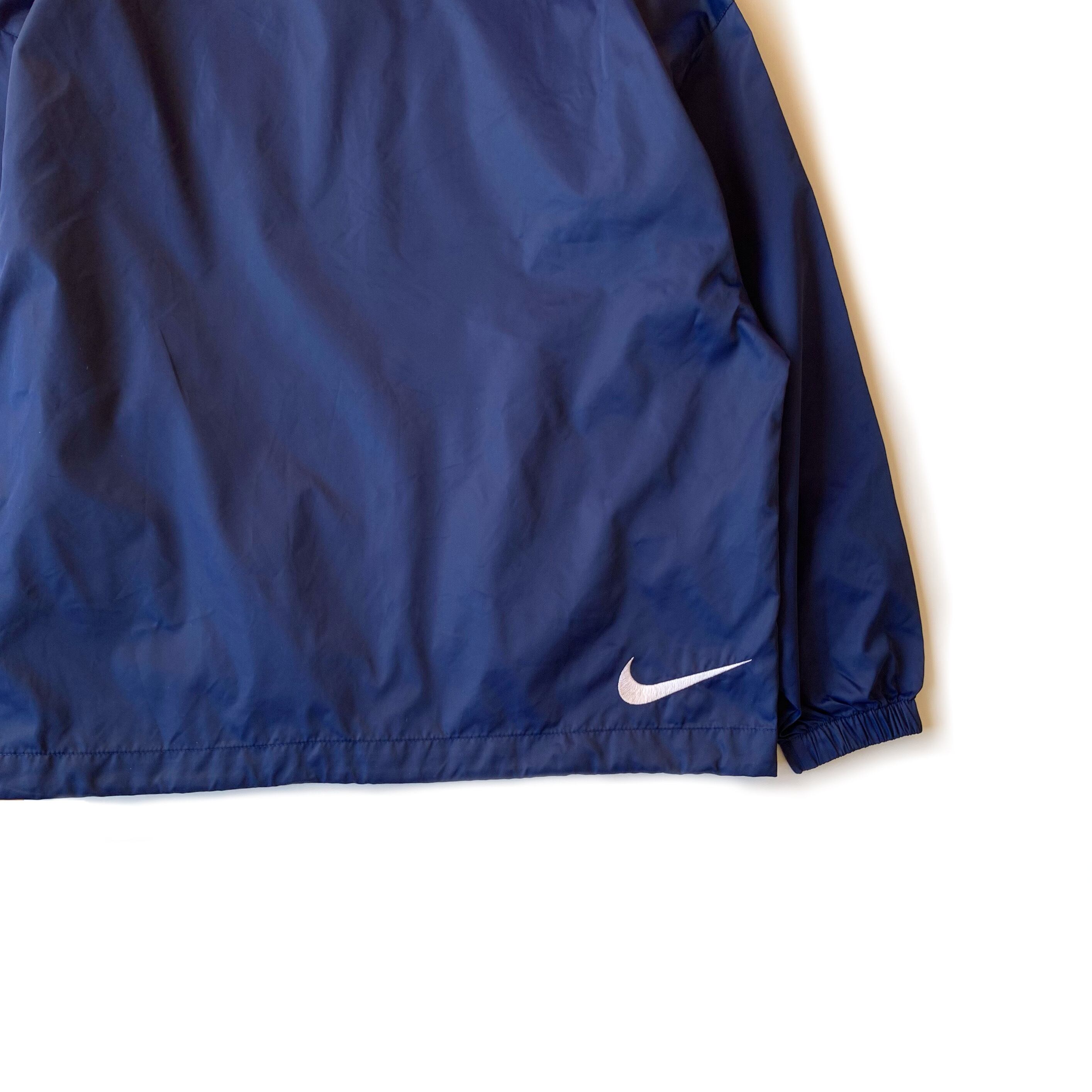 無地のネイビーにスウォッシュが胸元と後身頃 裾上に纏われております。裾上にさりげなく刺繍が施されているのが渋いです。