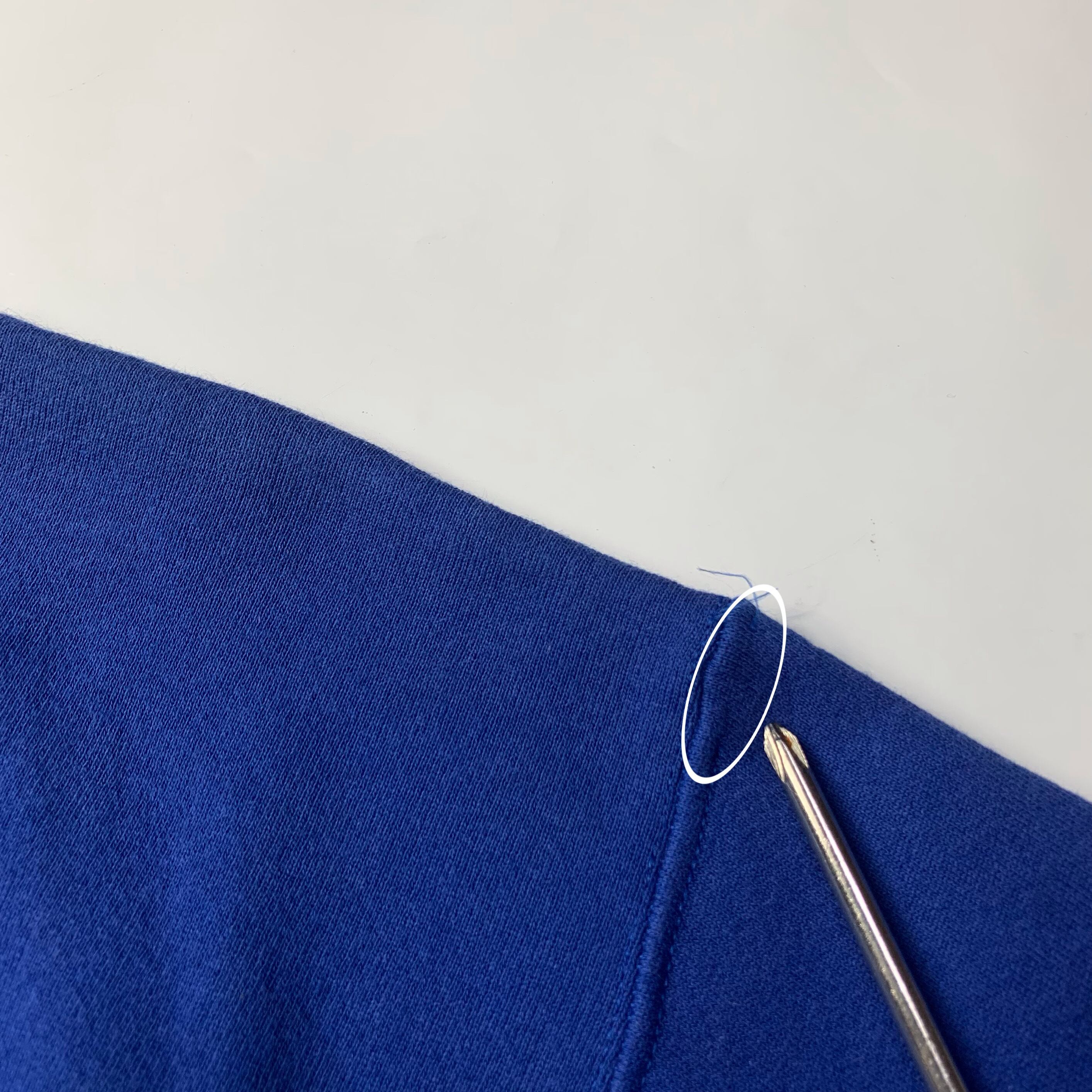 ・左アームホールに1部ステッチ抜けがございます。アームホール部分はダブルステッチとなっておりますので着用に問題はございません。