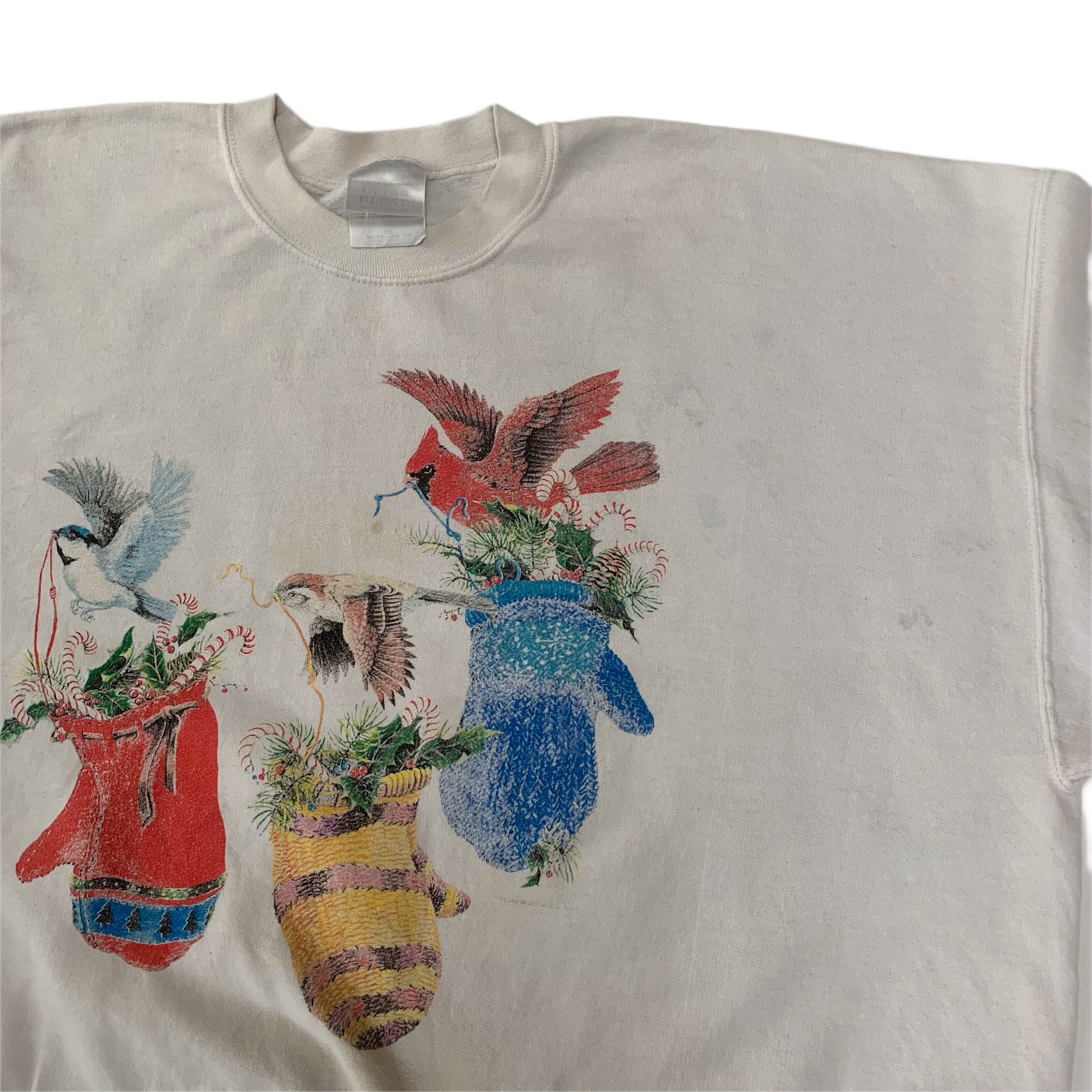 小鳥たちがクリスマスツリーの飾りを手袋に入れて運んでいる様子がプリントされた可愛いらしいデザイン。