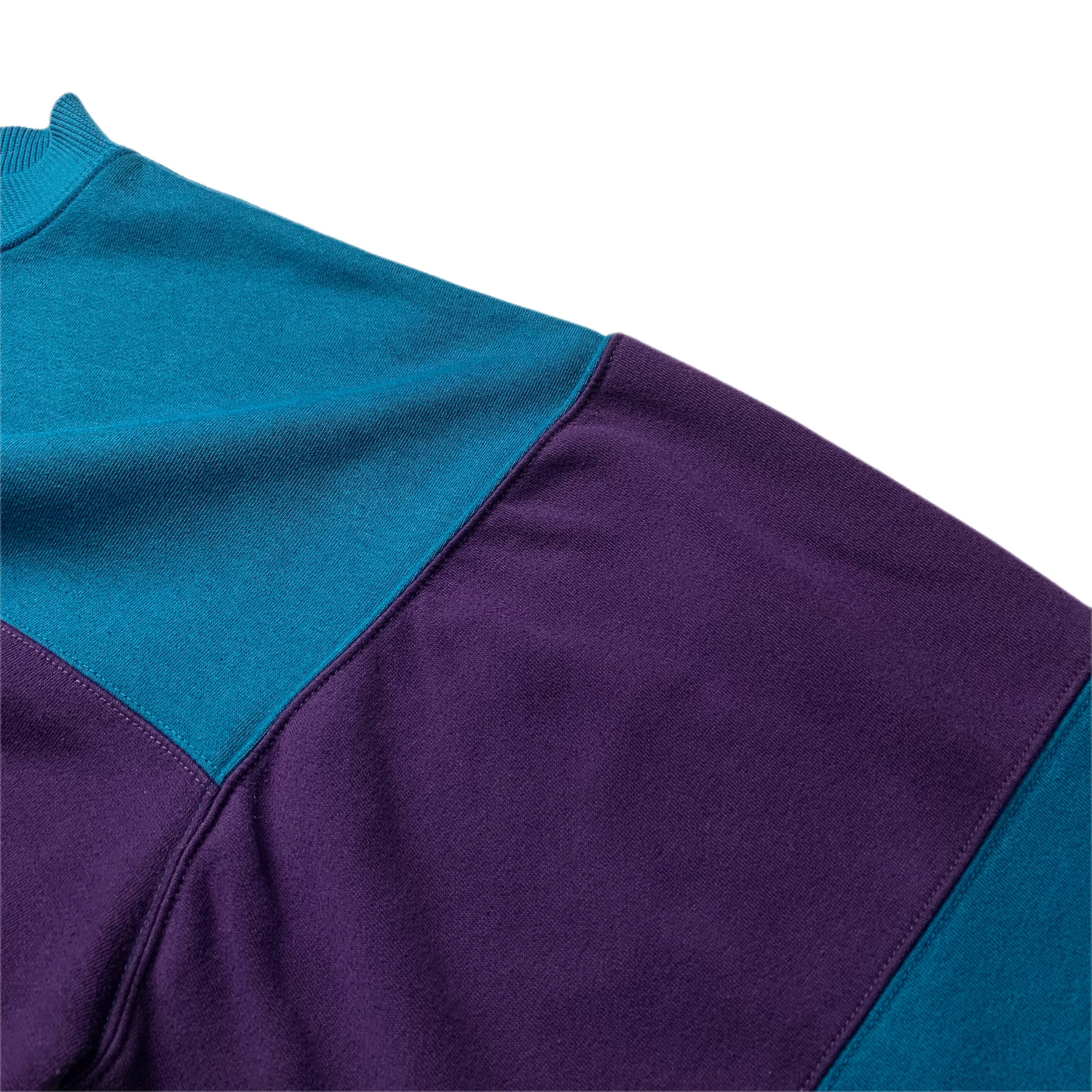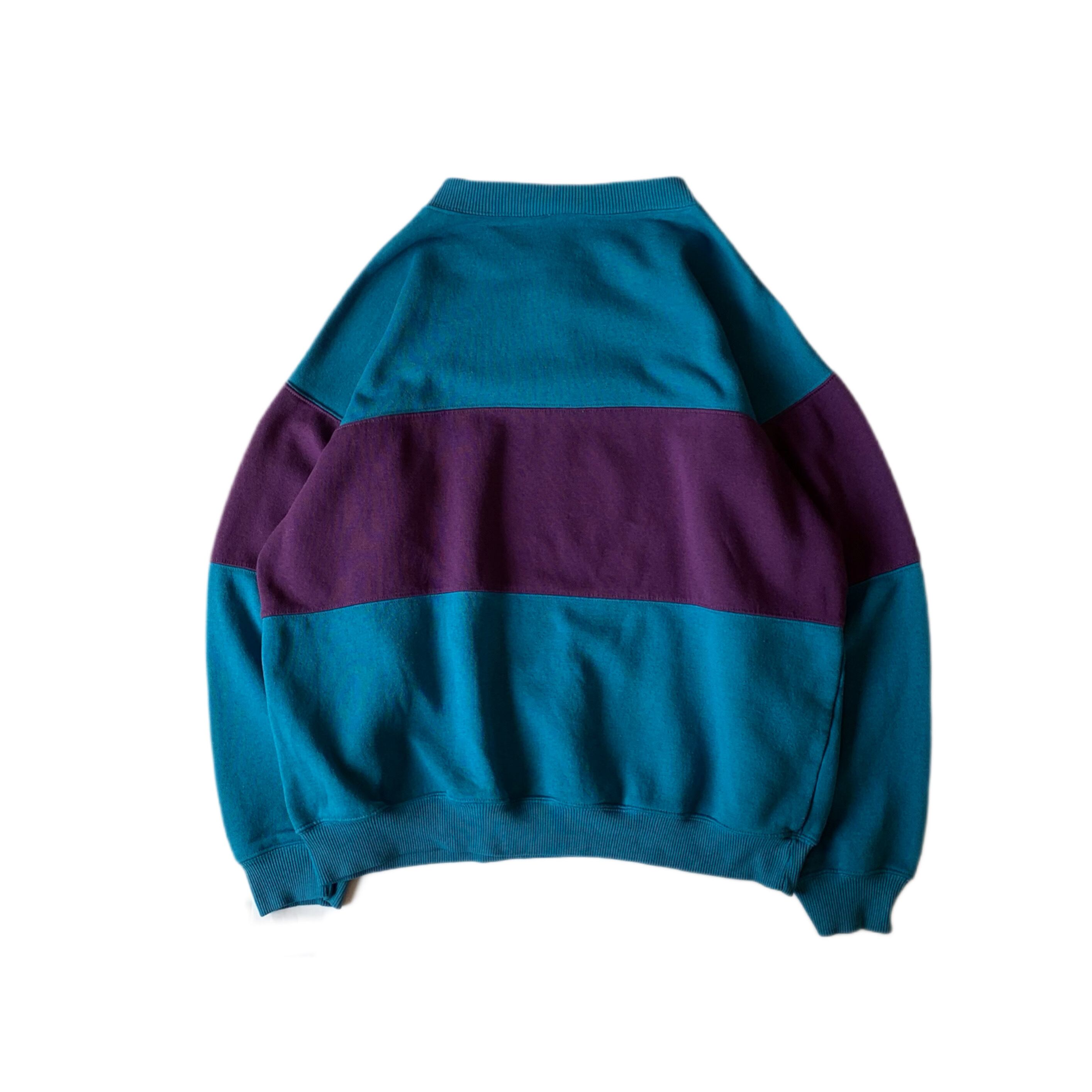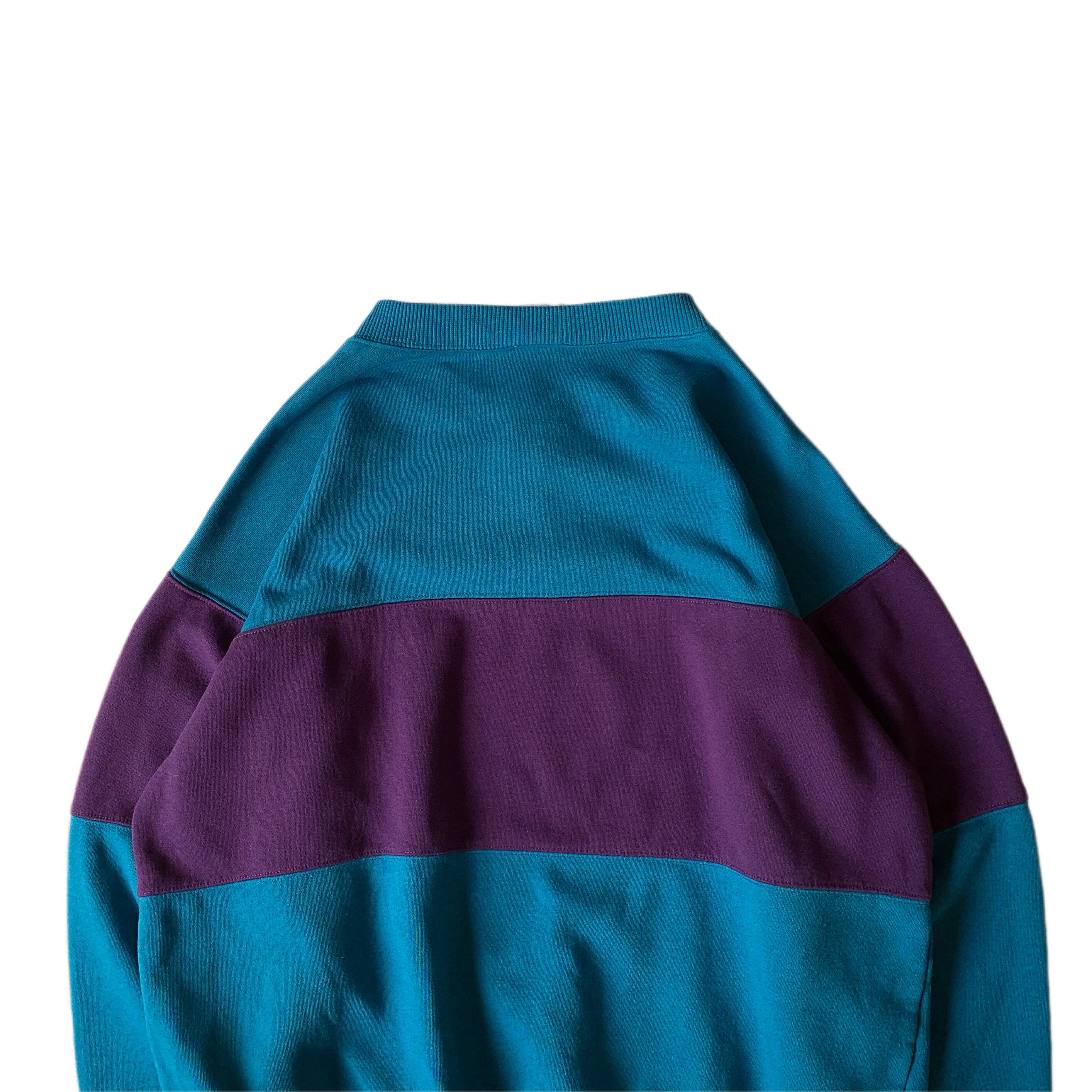 ヘンリーネック。お色はターコイズグリーン×パープルの太ボーダー柄。ふわっとした質感と裏起毛が魅力のコットン×ポリエステル素材の一着。