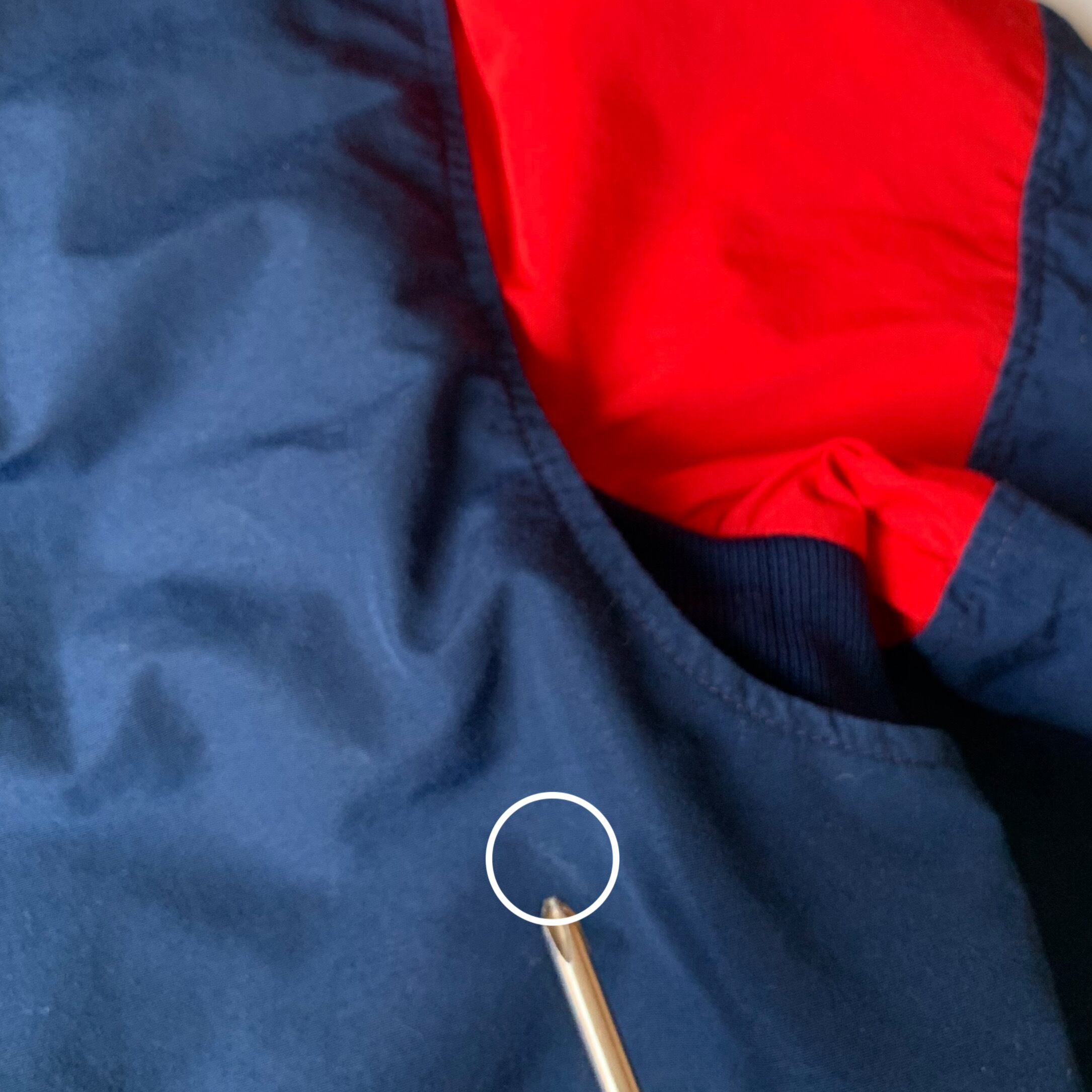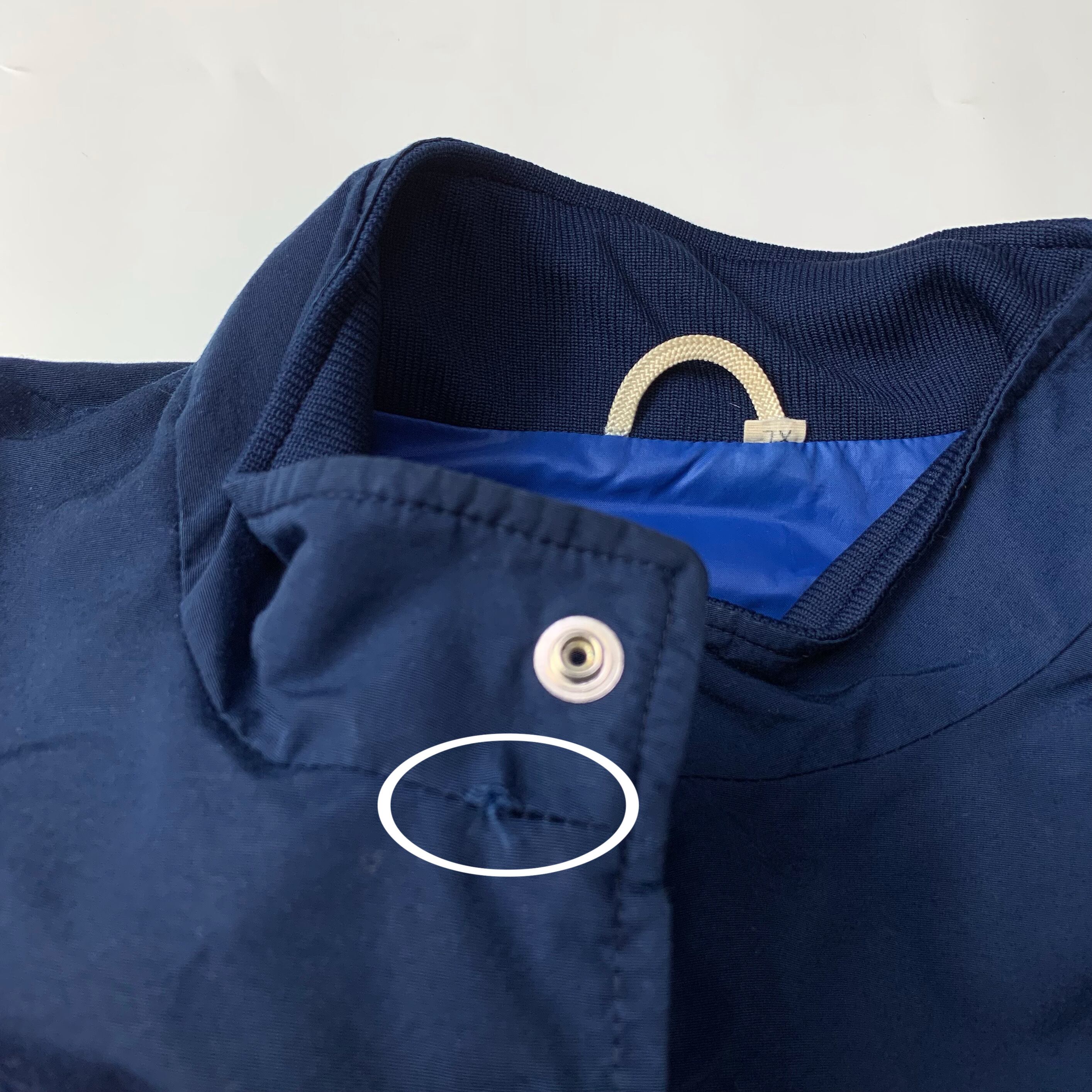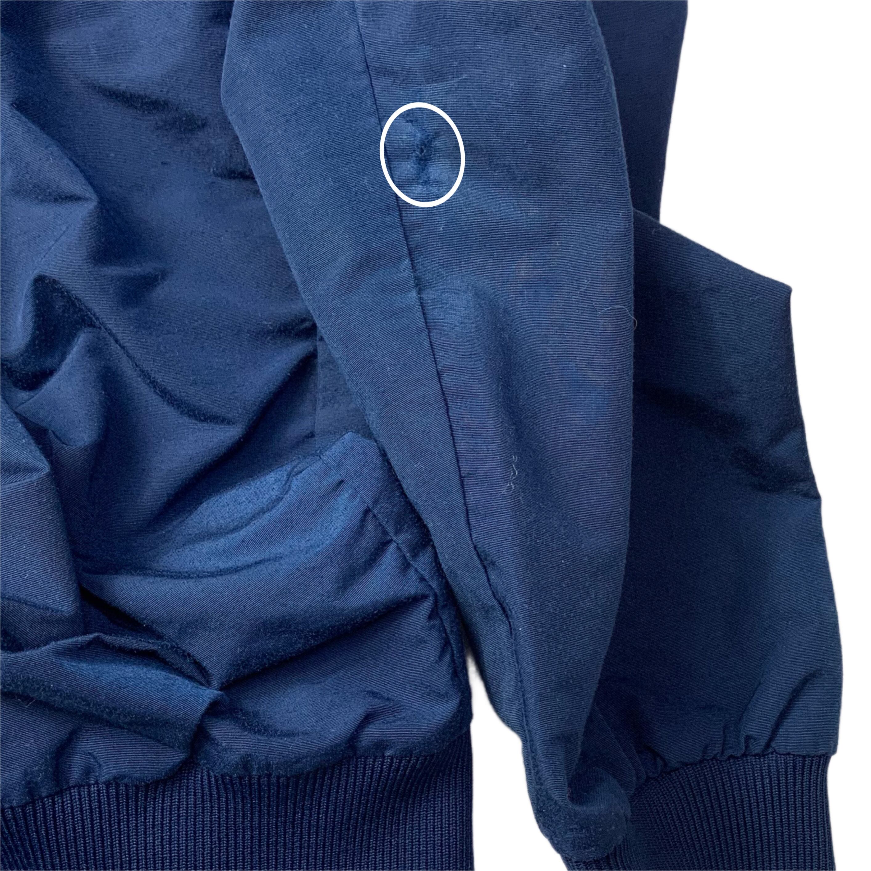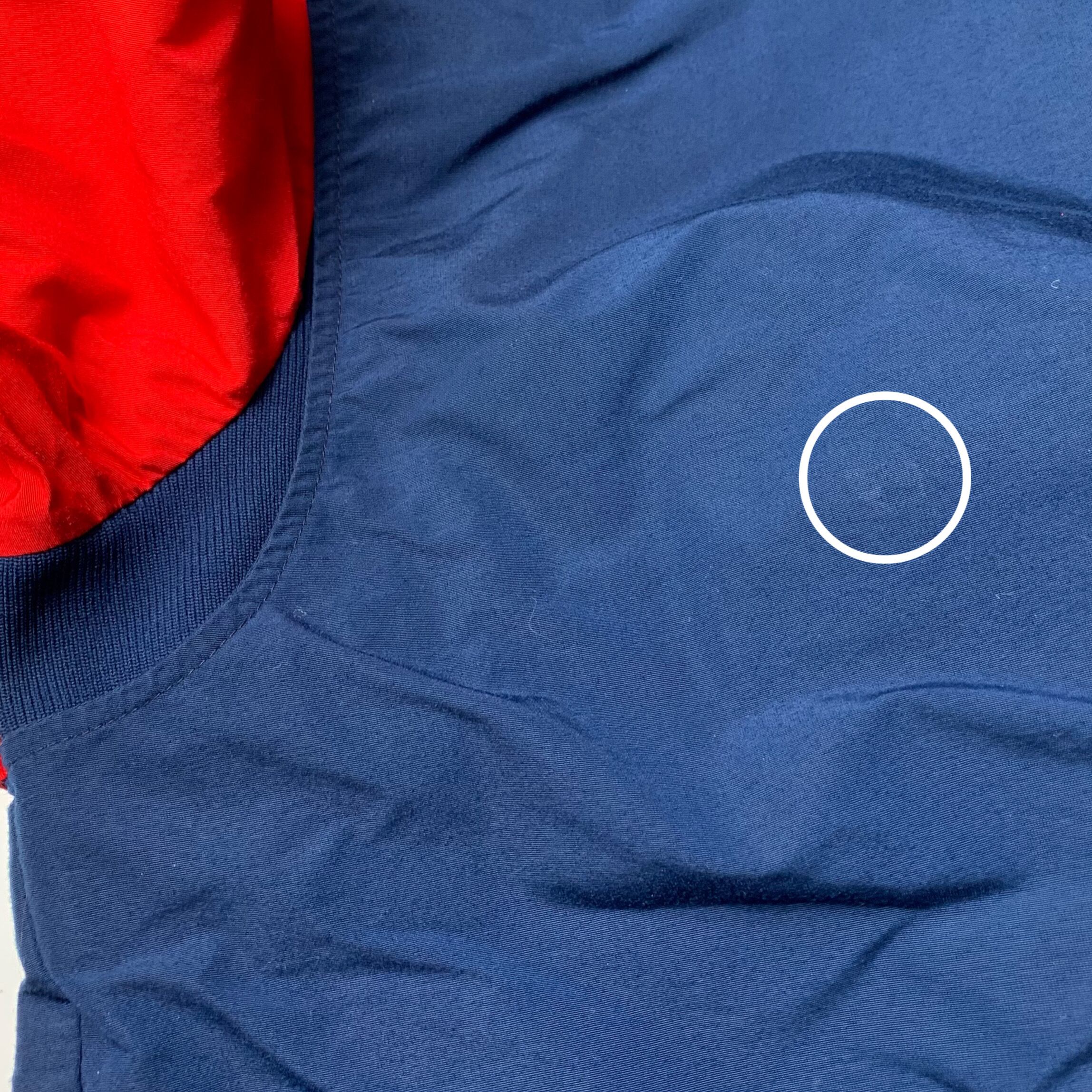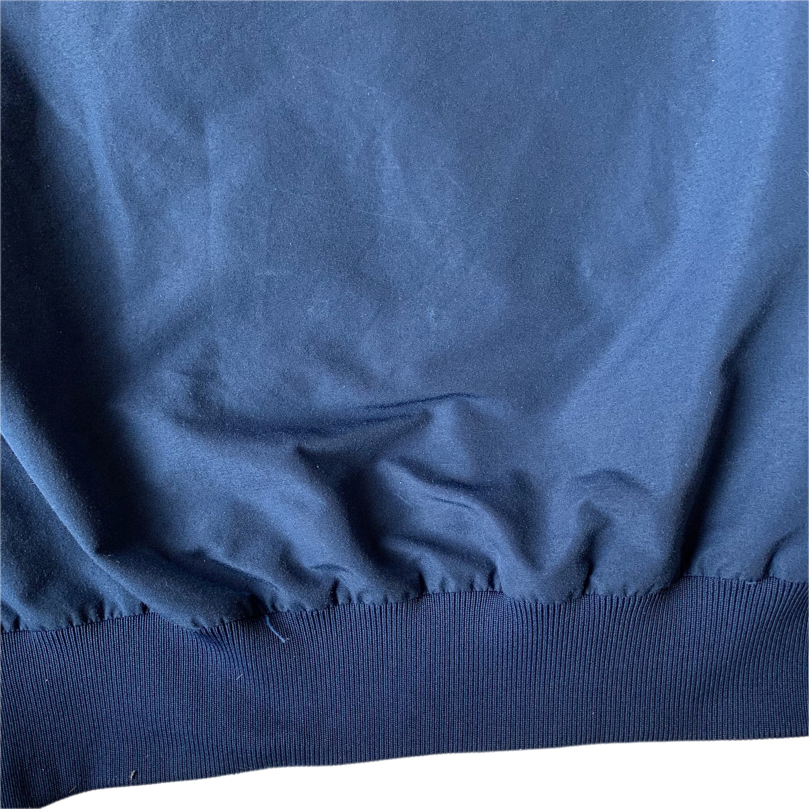 厚手でハリのあるナイロン。ハーフスナップタイプ。ウォームアップポケットは無く、腹部にジッパー開閉ポケットが1つございます。