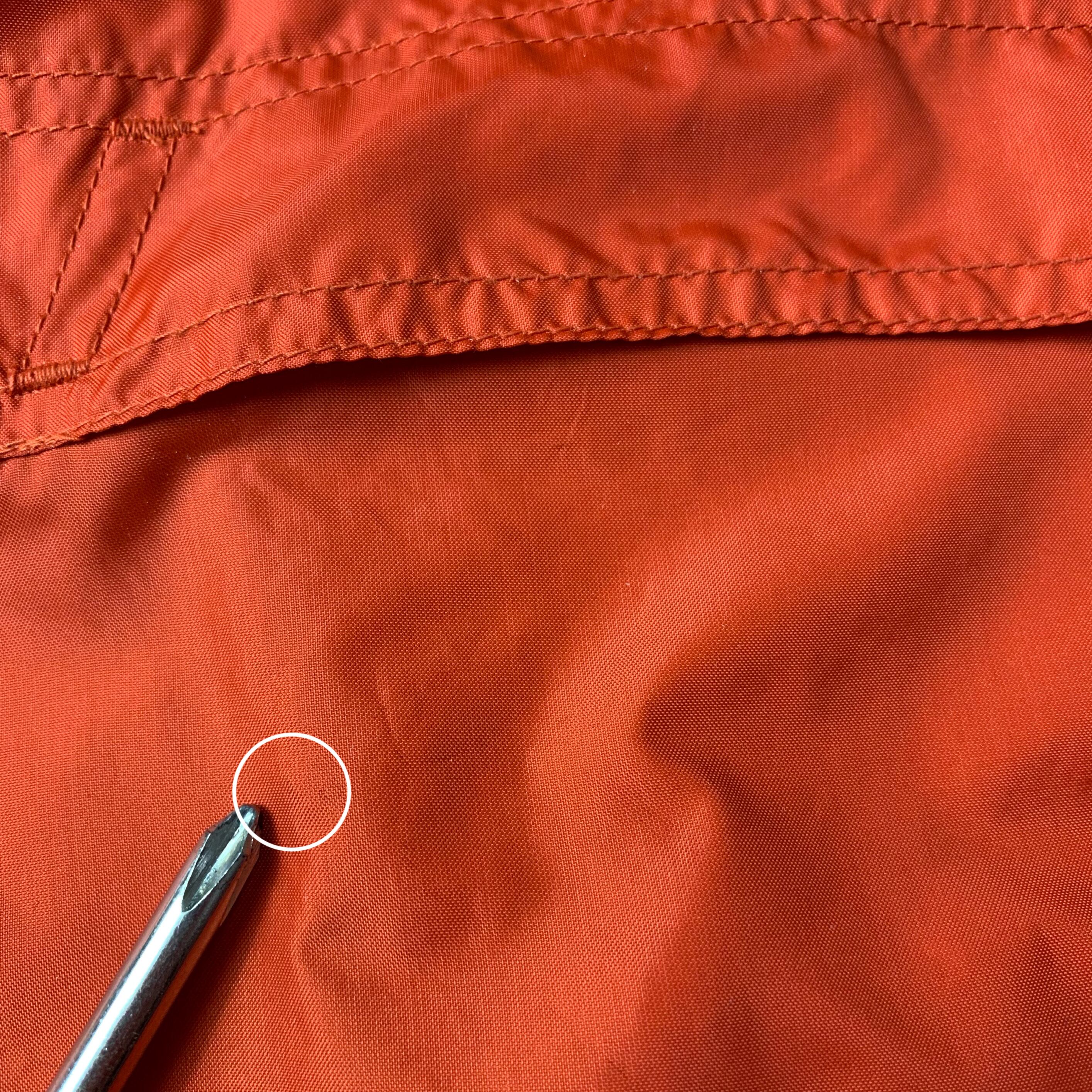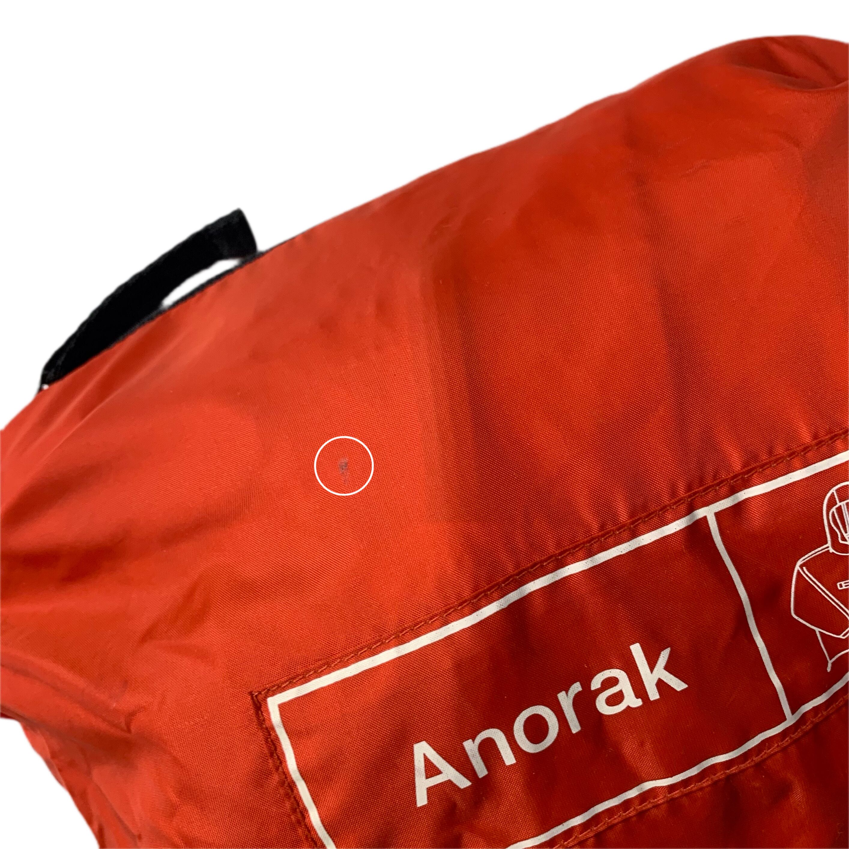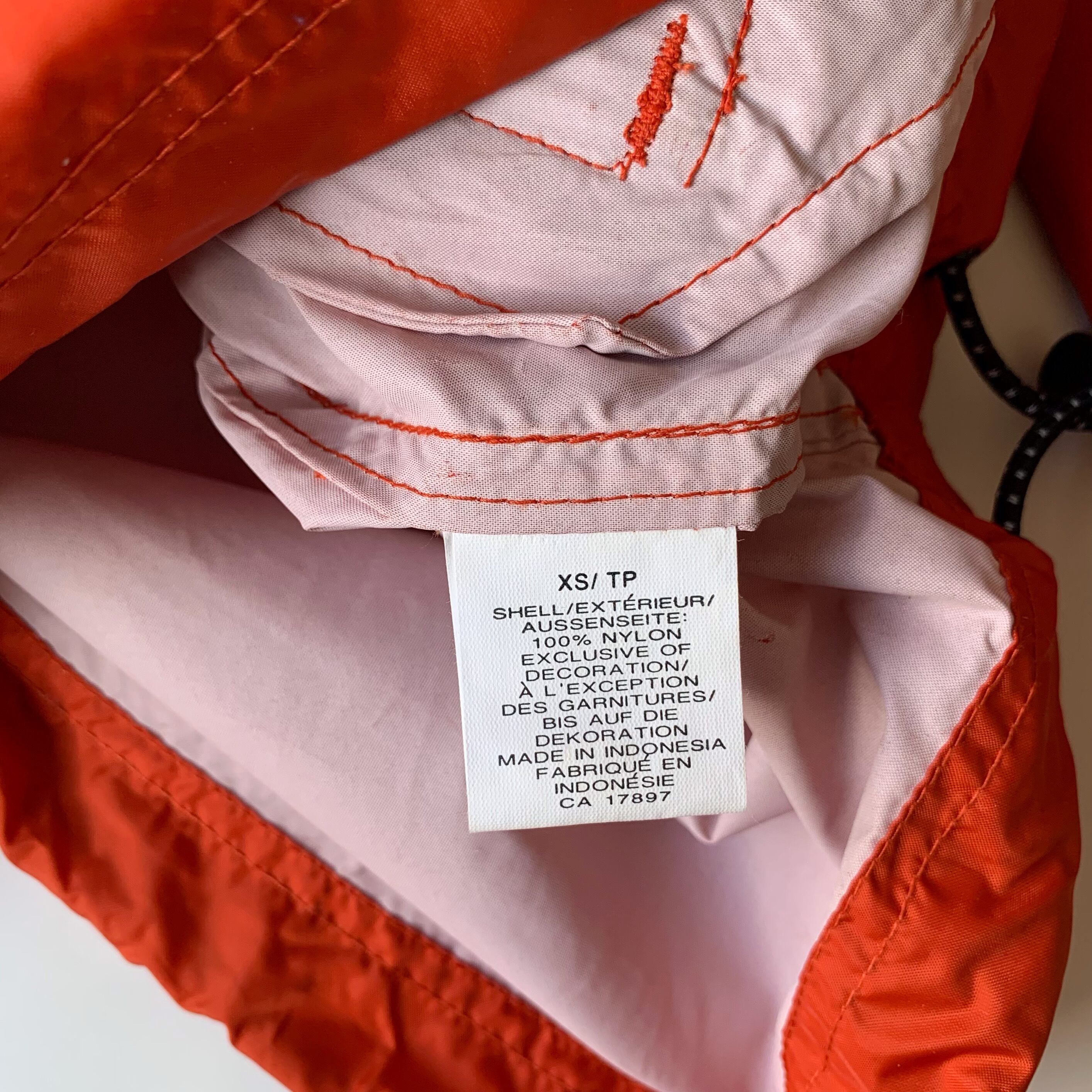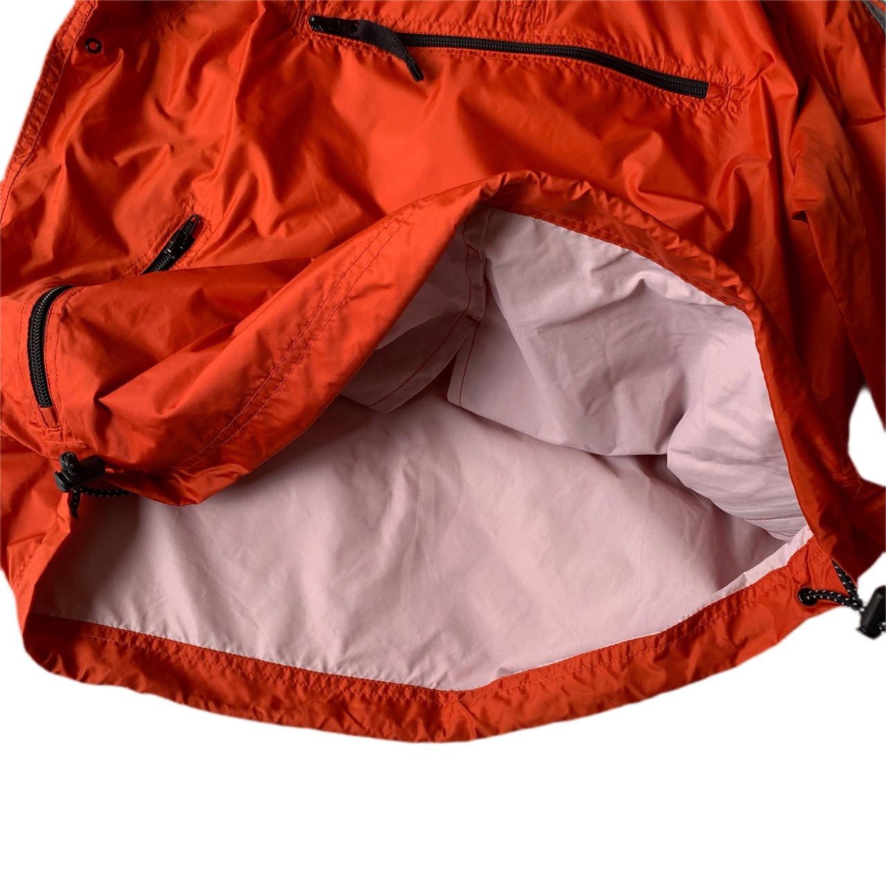 こちらは2000年代頃のナイロンアノラックパーカーです。暗みのあるバーントオレンジカラーで、肩にラインが入ったデザイン。