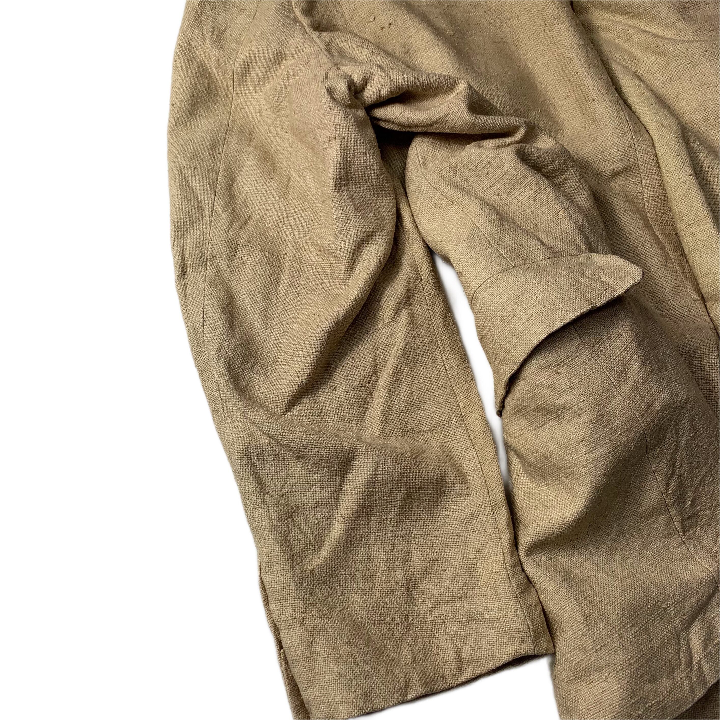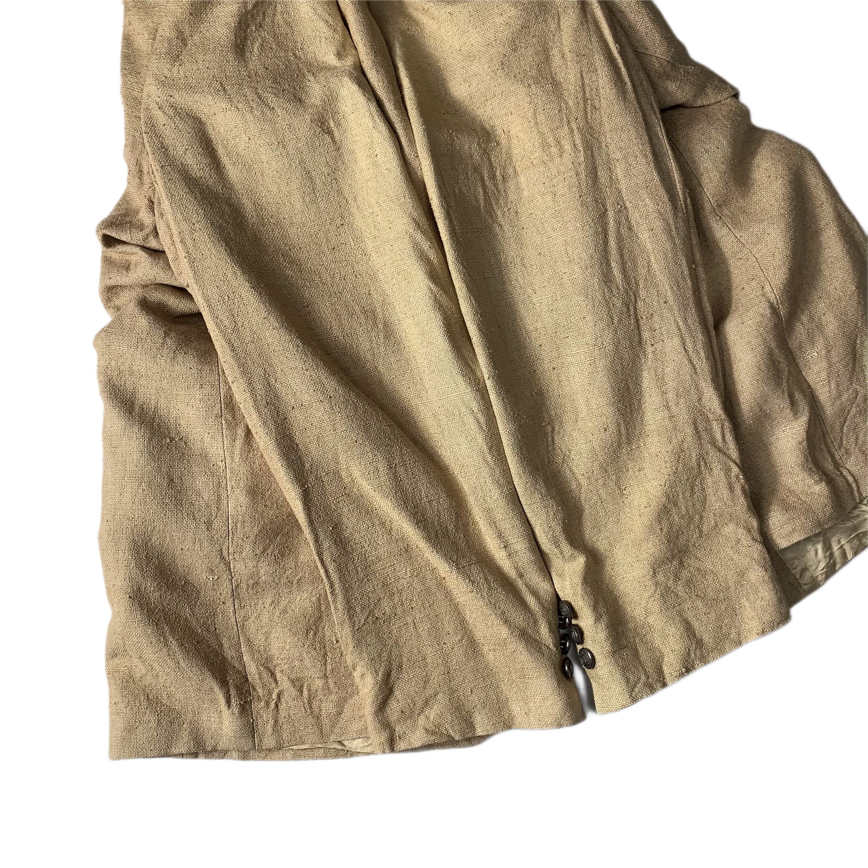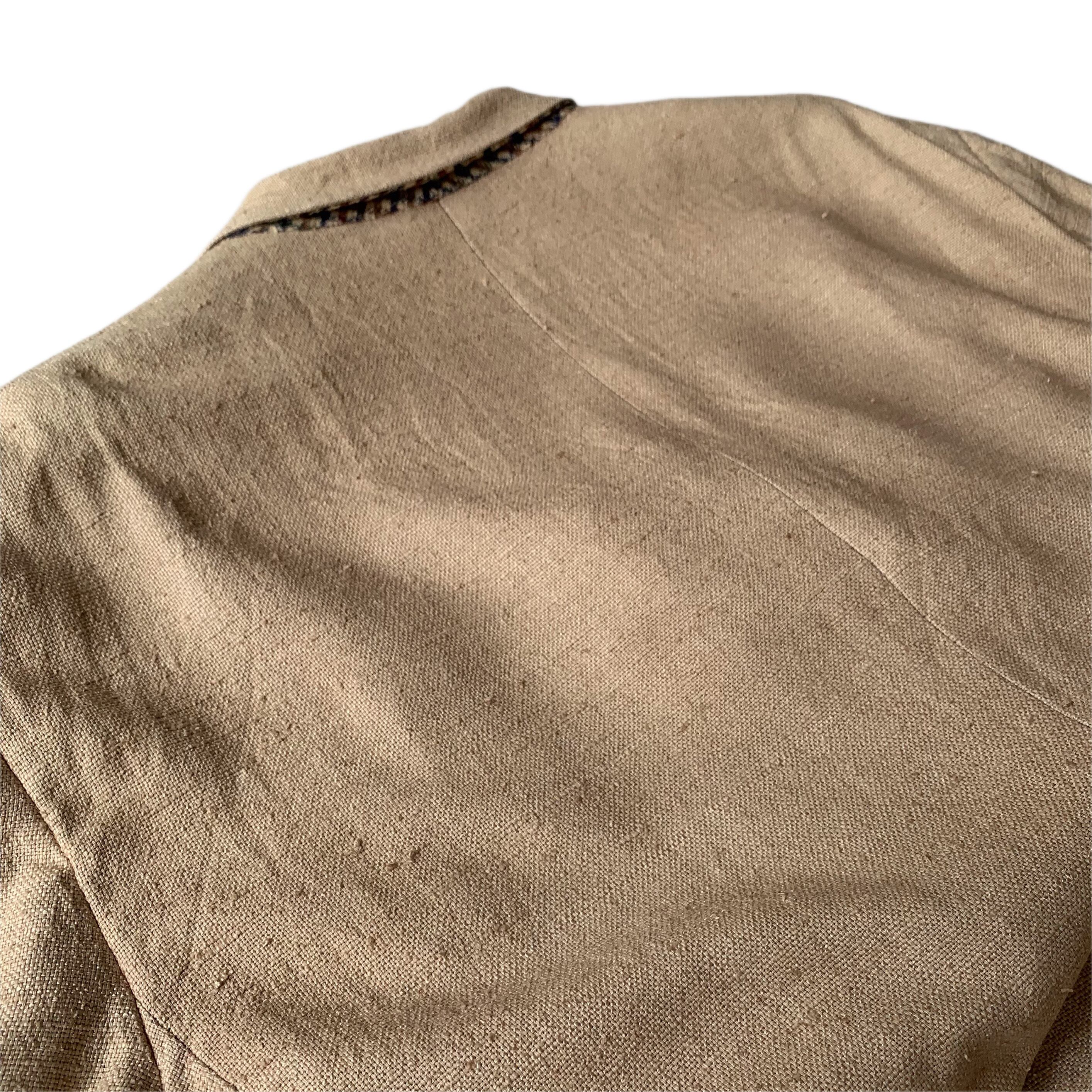 素材表記ございませんがリネン素材で仕立てられた1枚かと思います。袖裏地にはキュプラのような光沢のある素材が貼られております。