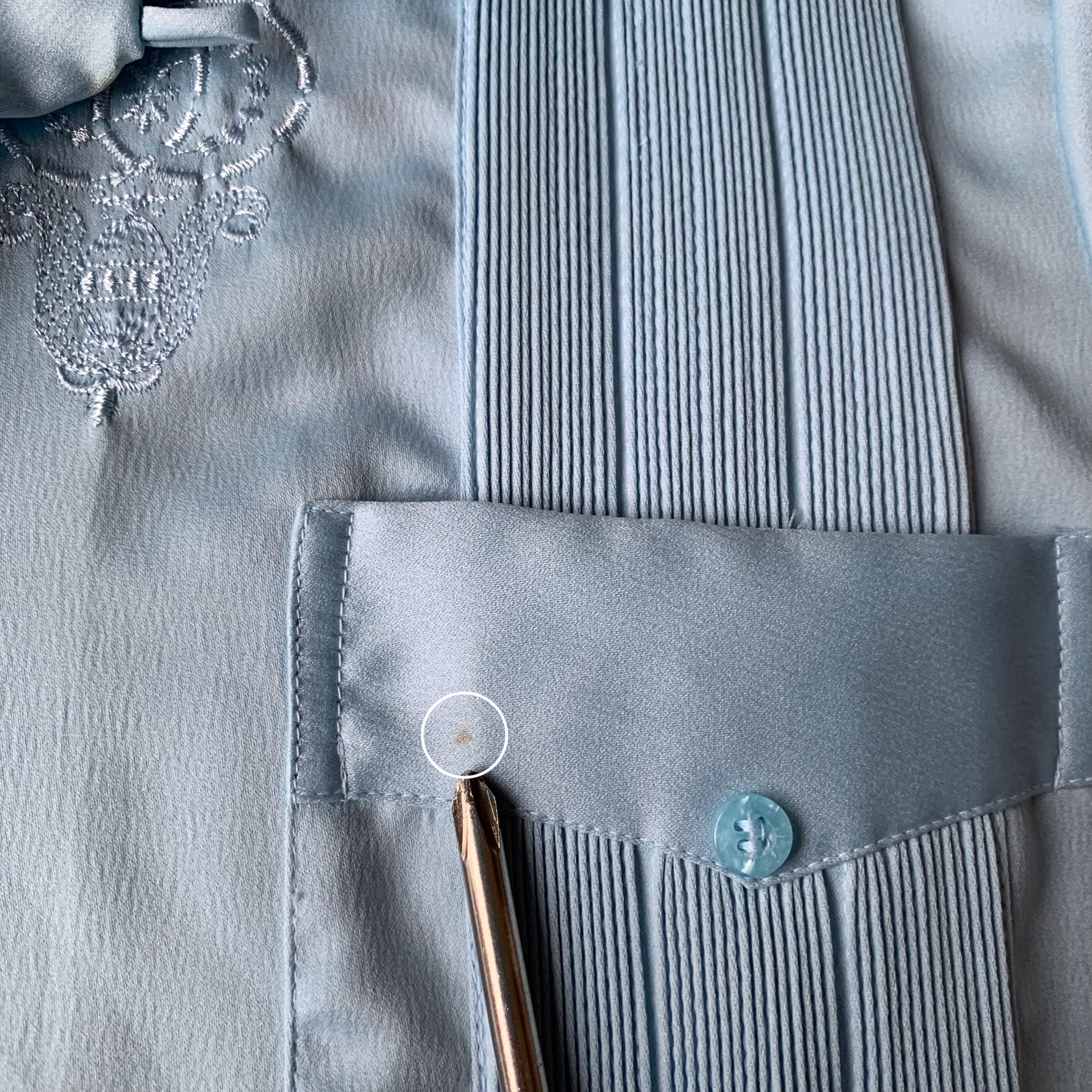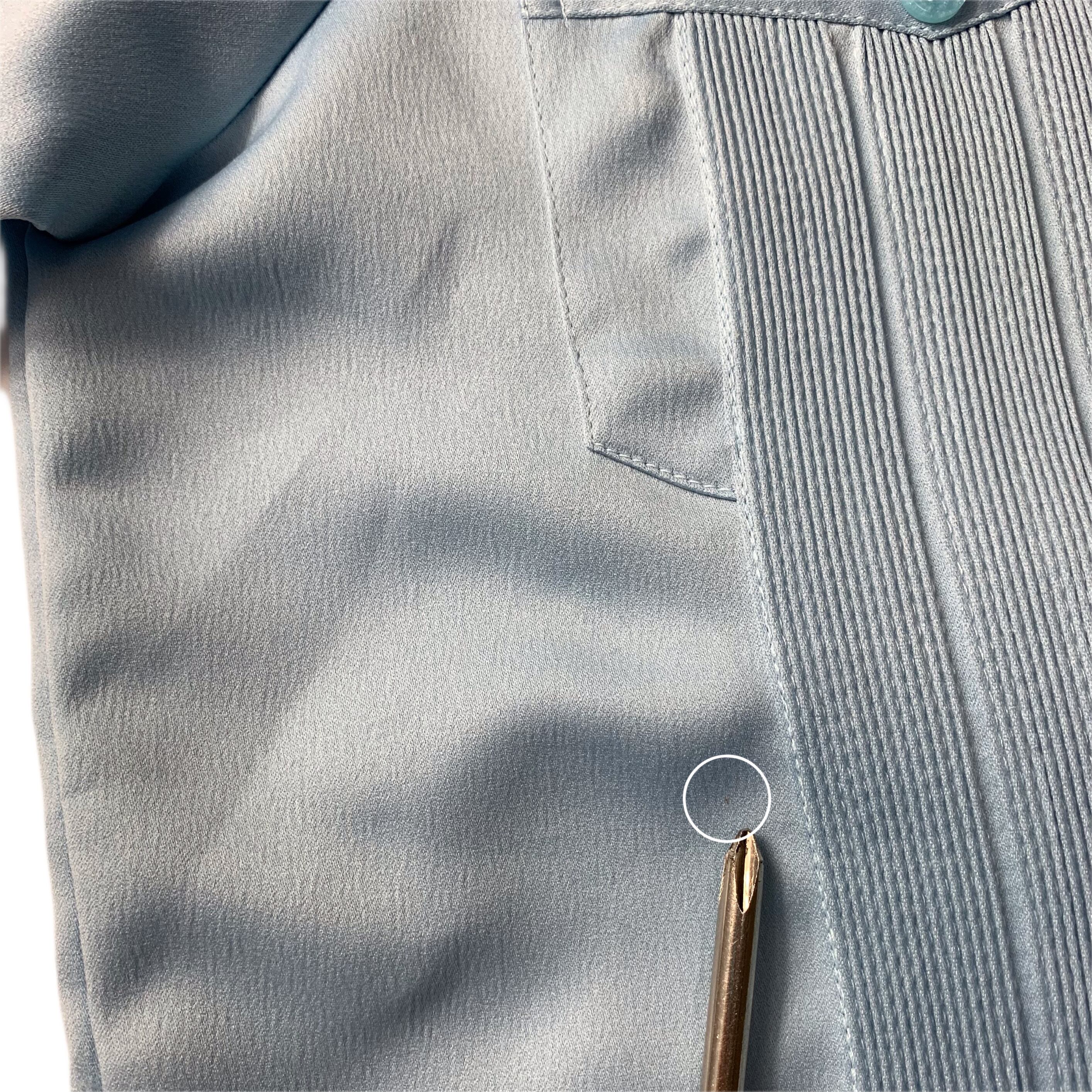 お色はライトブルーで、ループ付きのオープンカラー仕様という点も見逃せません。春夏シーズンに活躍すること間違いなしの一枚ですので、是非この機会にご検討ください。