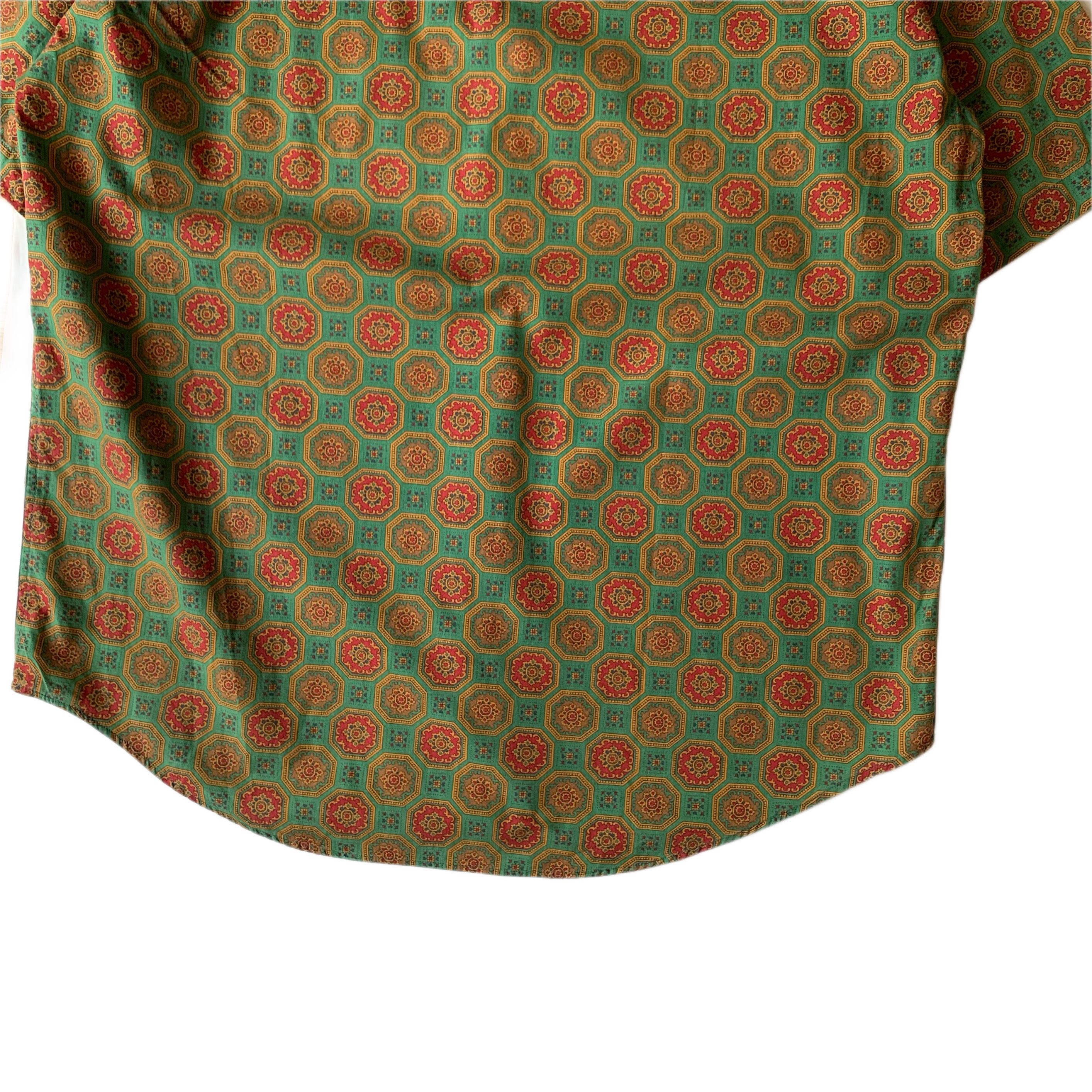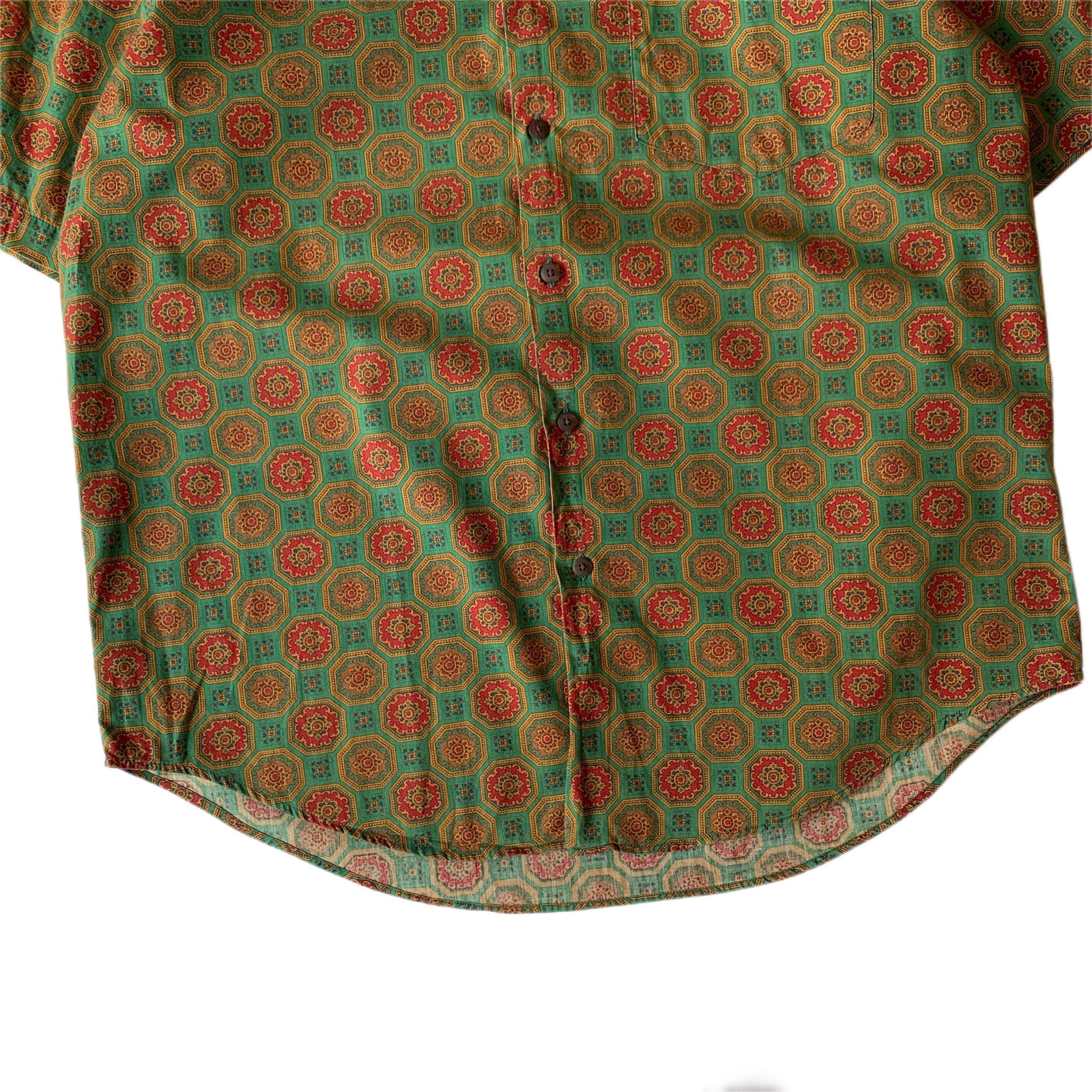 良い意味で古着らしい総柄の半袖シャツ。左胸にはパチポケがございます。ポケットの柄合わせも完璧です。