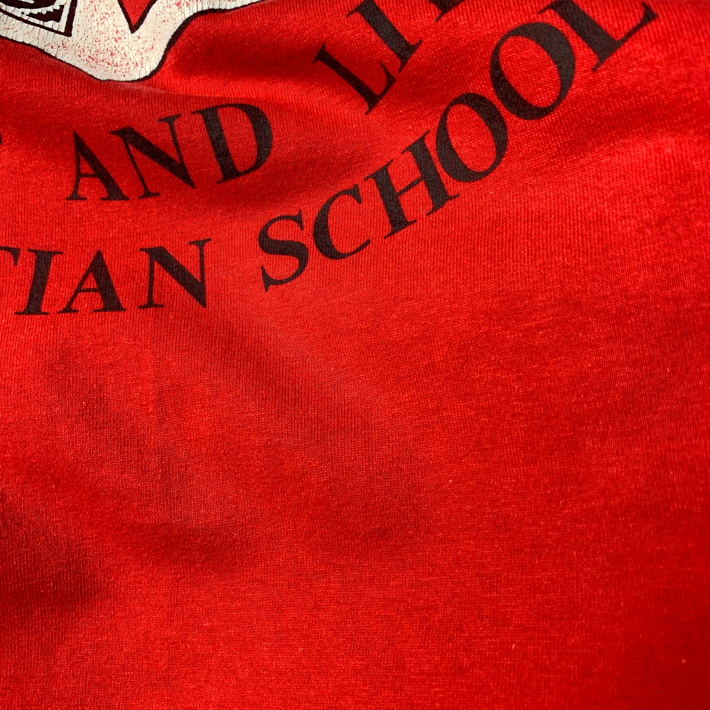 インディアナ州にある”LIGHT AND LIFE CHRISTIAN SCHOOL ”のTシャツ。クリスチャン(キリスト教の信者)なので聖書が描かれたデザインとなっております。