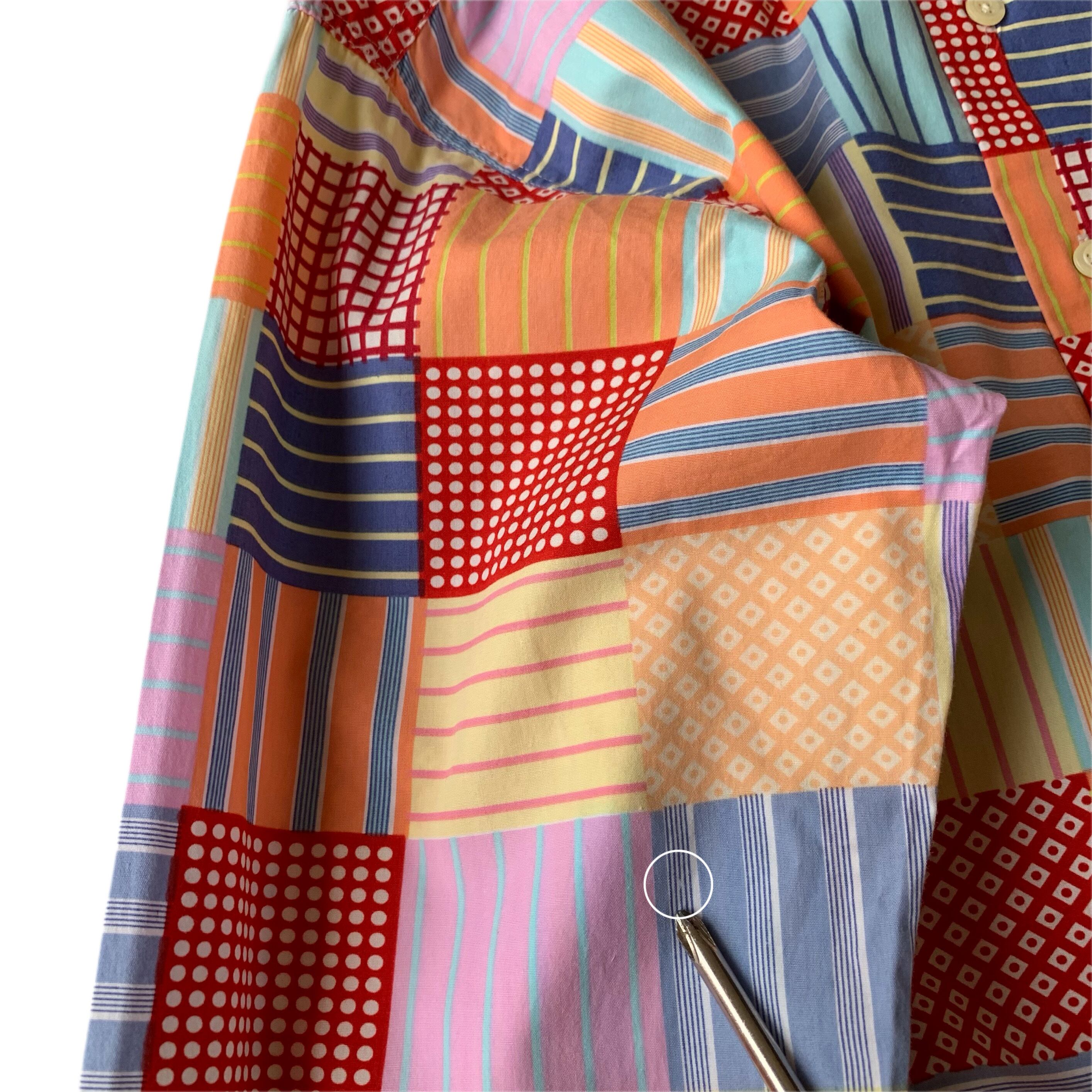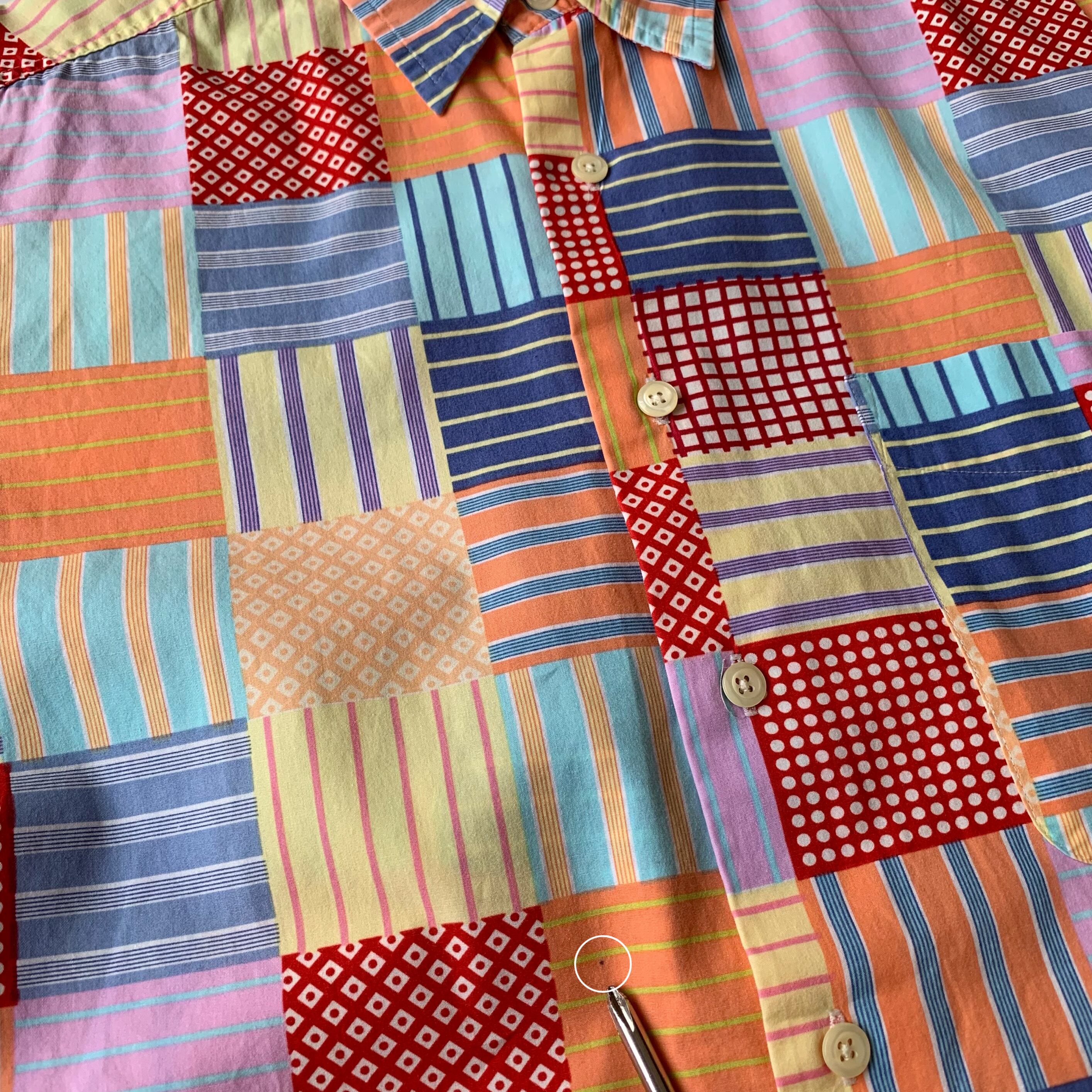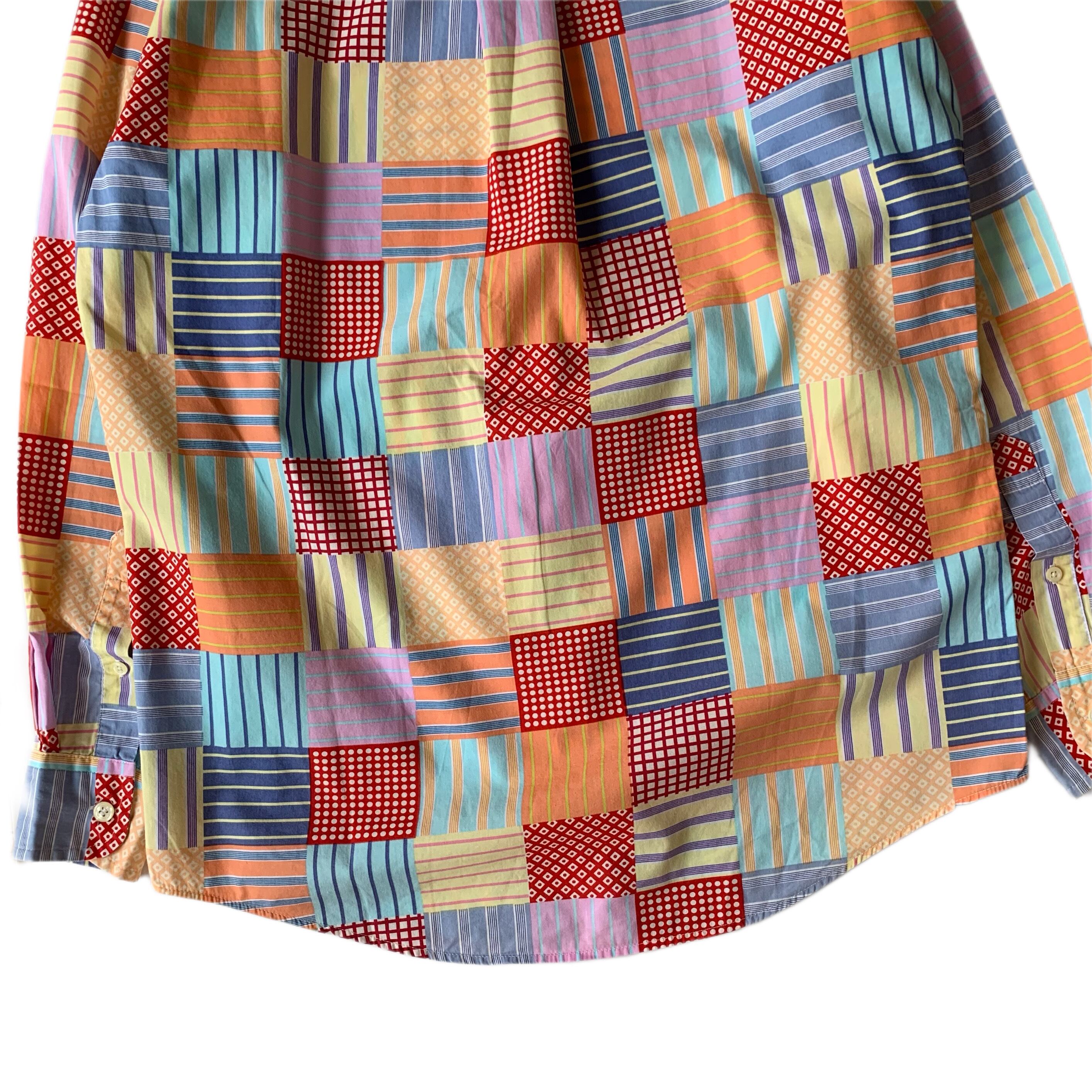 パッチワークデザインのプリントが特徴的な1枚です。左胸にはパッチポケットがございます。