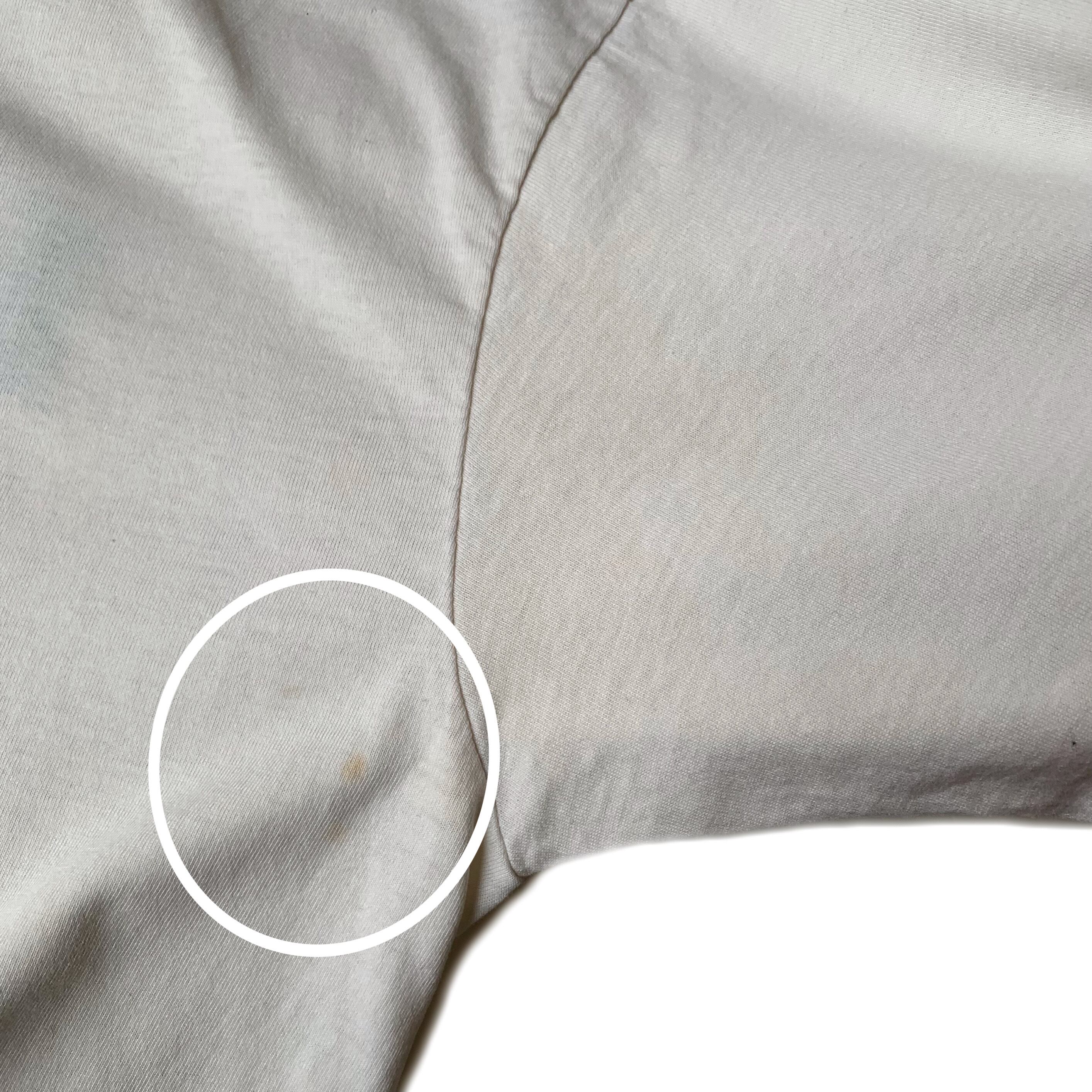 ・左脇下、後身頃 右脇下、プリント付近、首リブ、後身頃中央付近など所々にシミがございます。