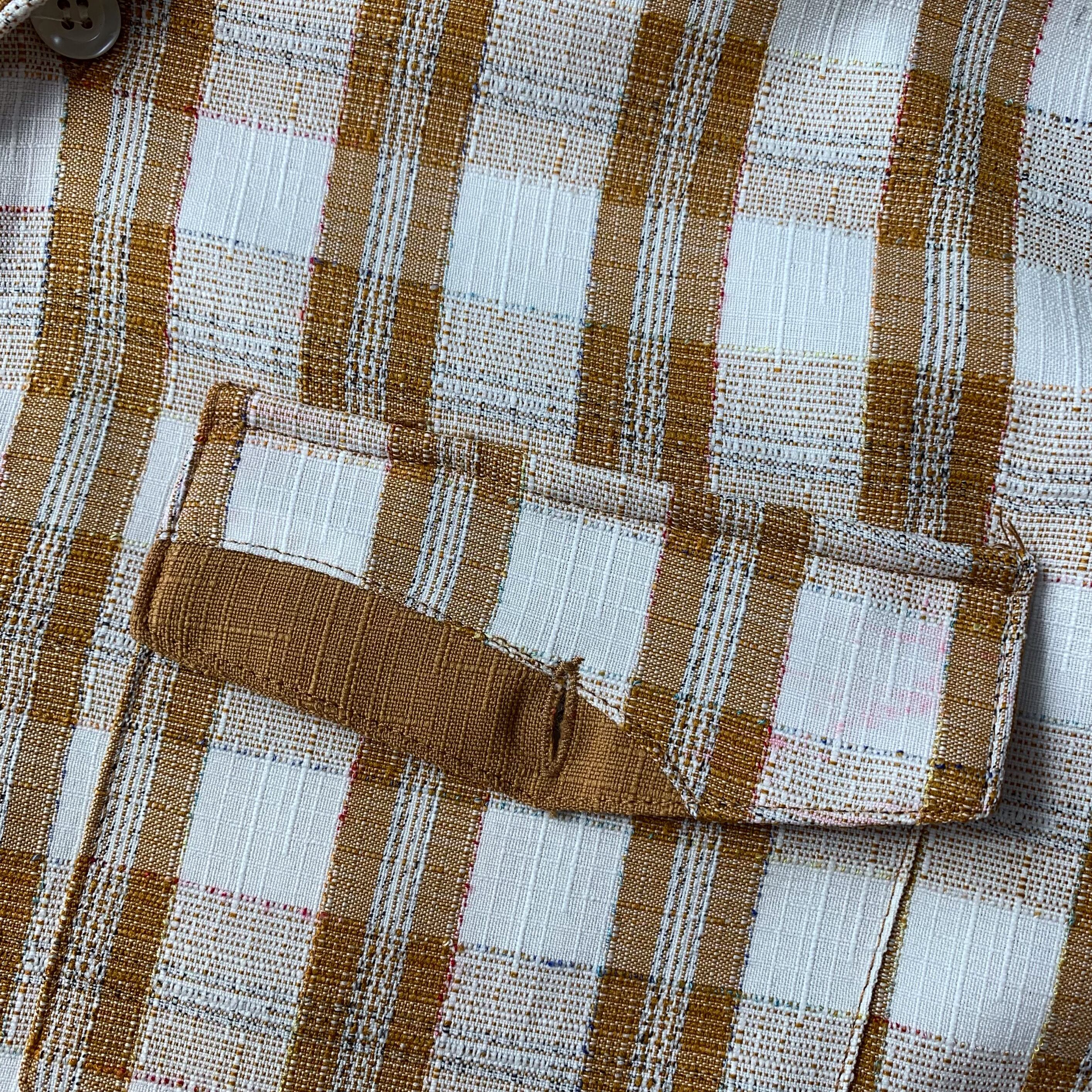 ポリエステル×レーヨンのサラッとした肌触り。1970年代を彷彿とさせる襟の形状や胸ポケットの切り替えデザイン。
