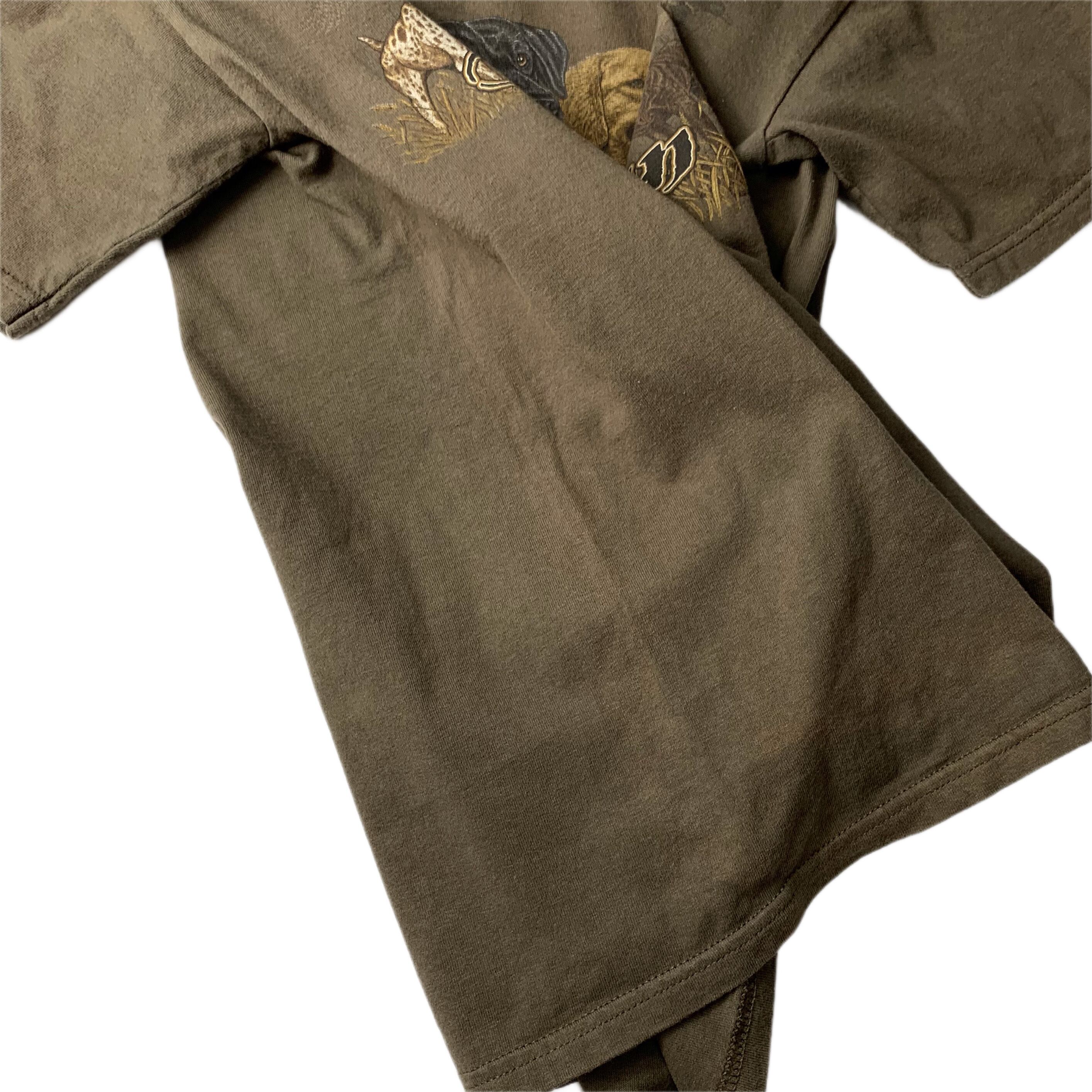 GILDANボティの1枚。レトリバー系の犬と鳥がプリントされたデザイン。