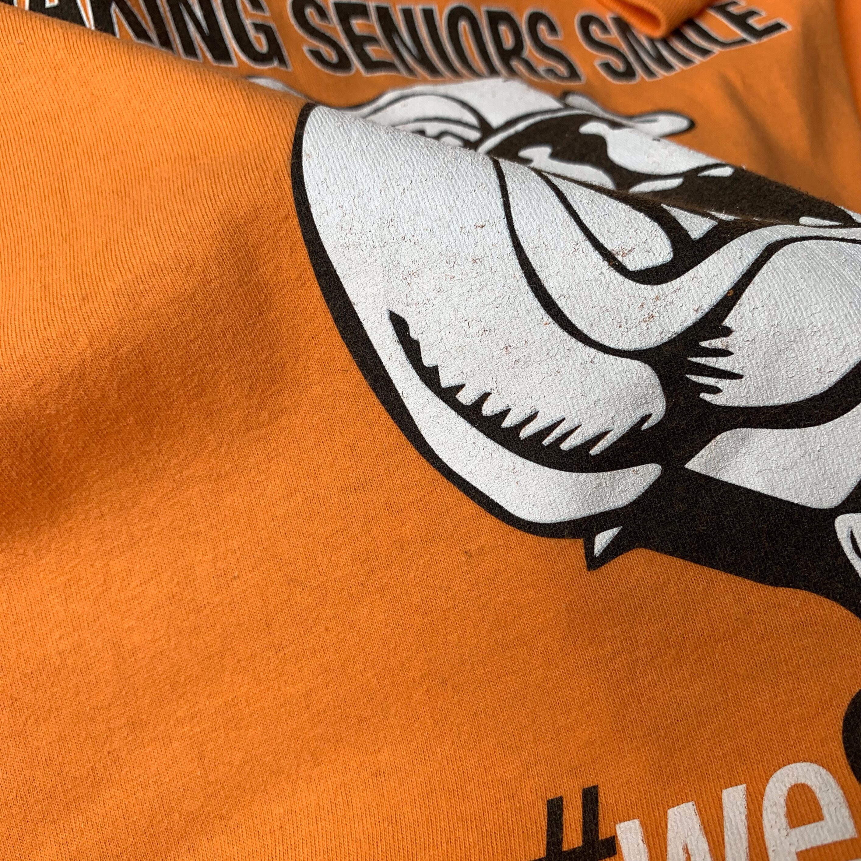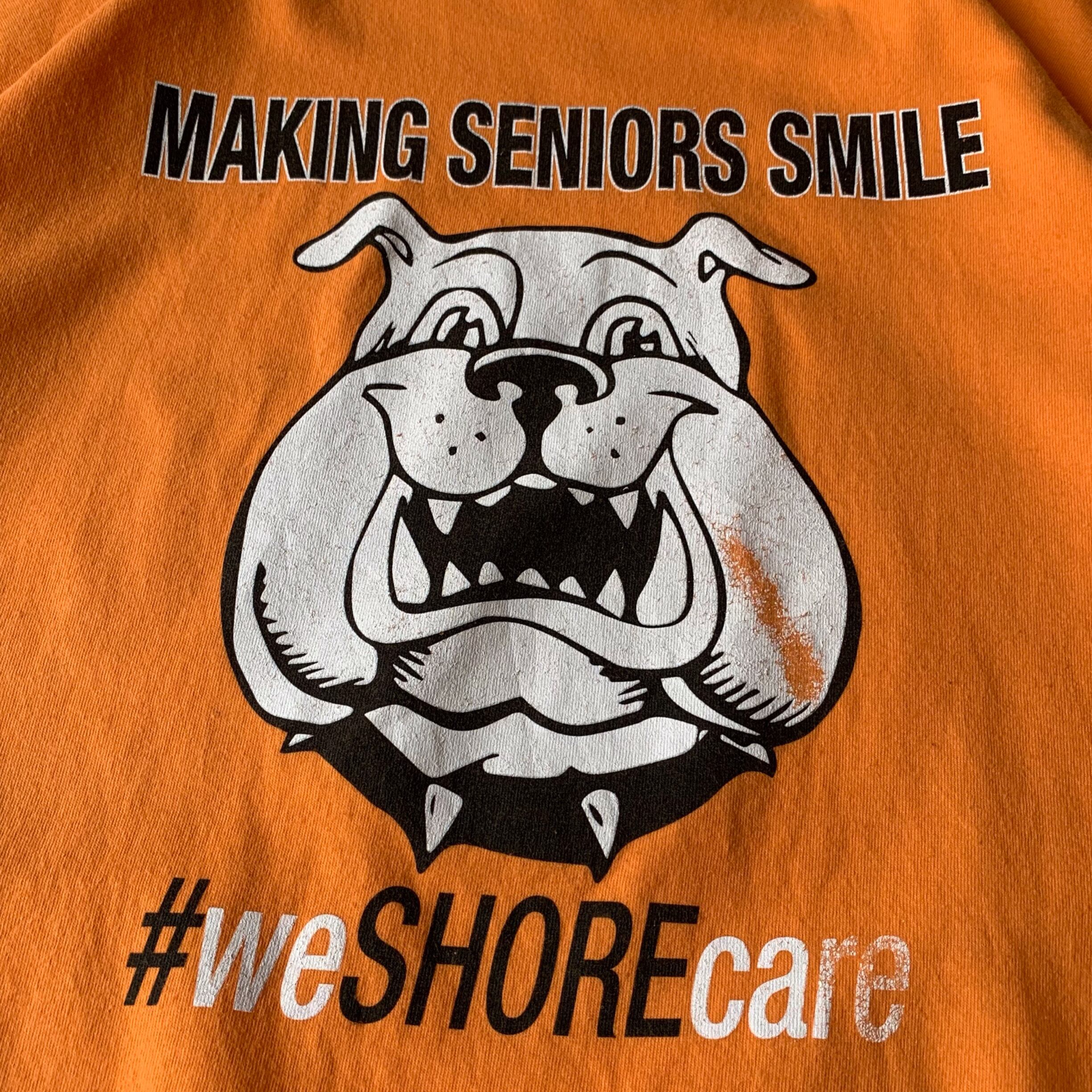 “MAKING SENIORS SMILE”=“お年寄りを笑顔にする”というメッセージとブルドッグのプリントが特徴的なデザイン。