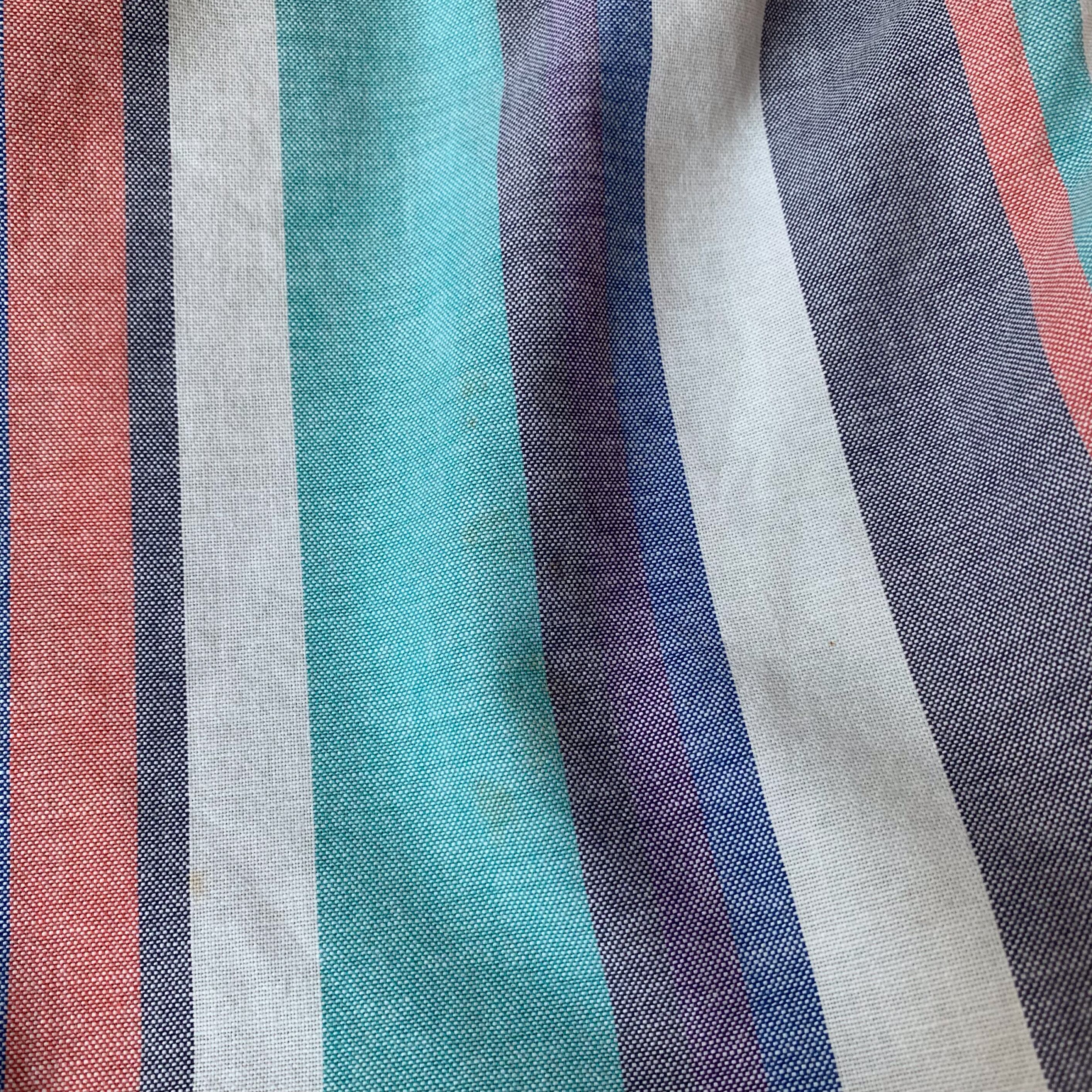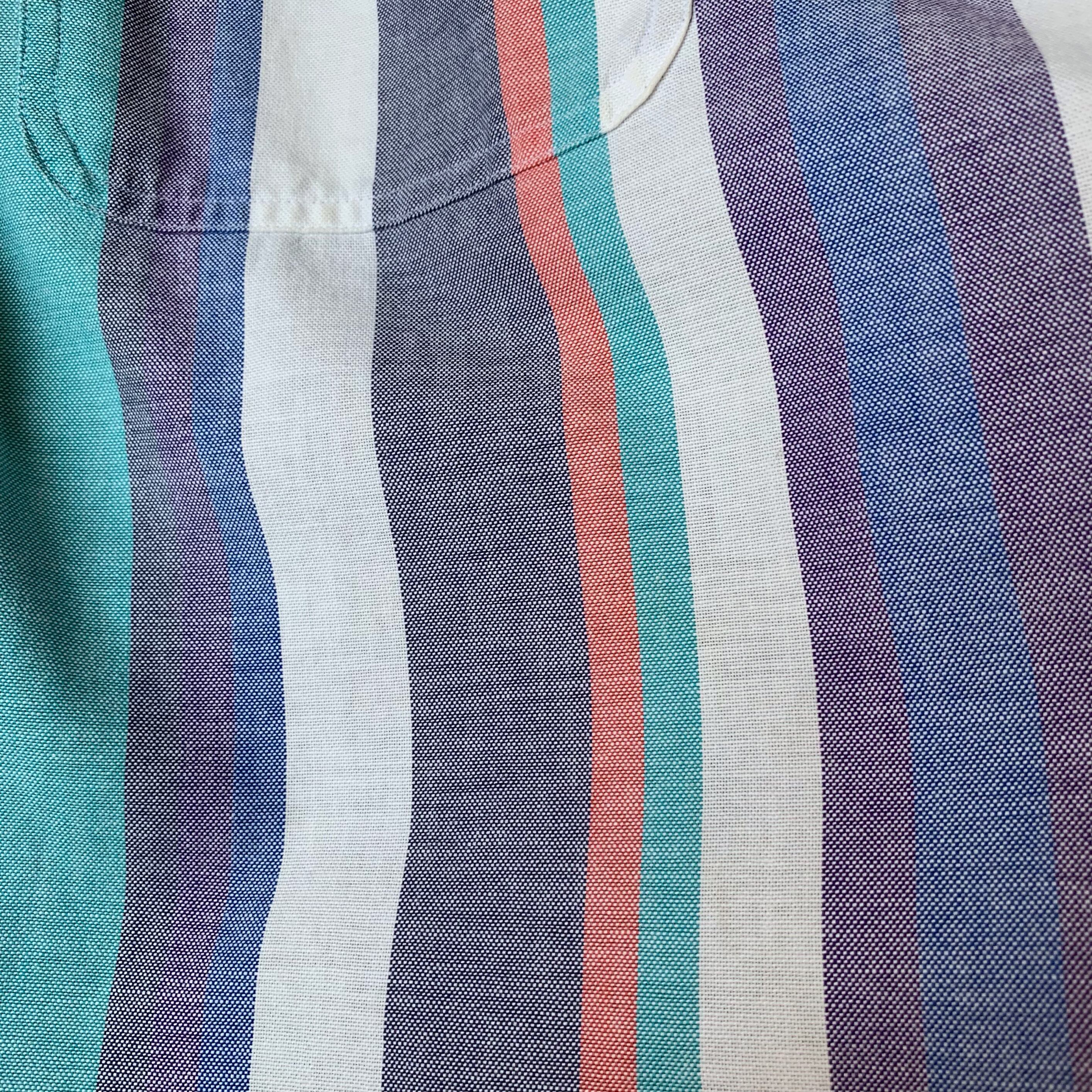 マルチカラーのストライプ柄。バックテール長めのシルエット。左胸にはパチポケ、柄合わせ完璧です。