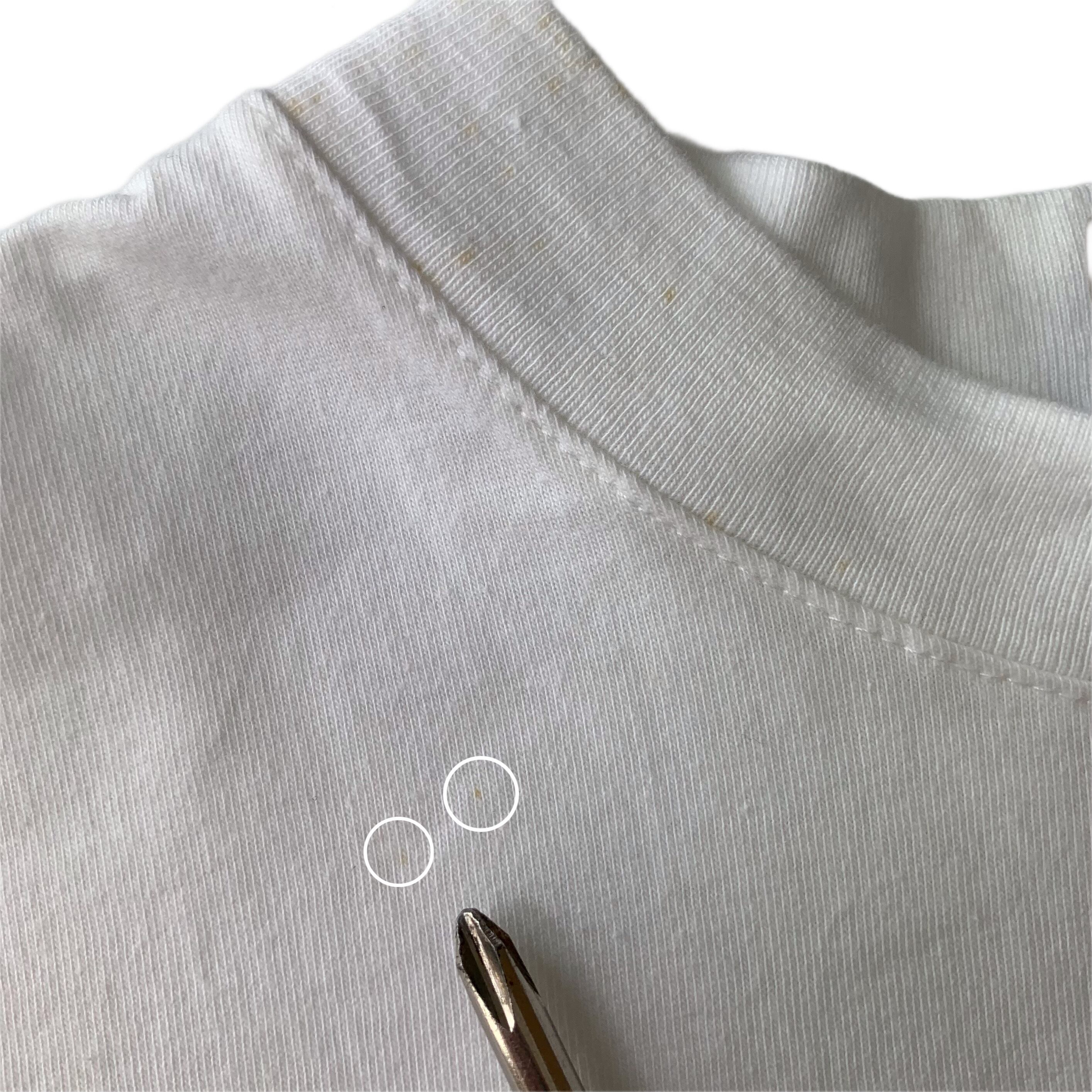 ・写真ですと分かりづらいですが、首リブにシミが数点ございます。