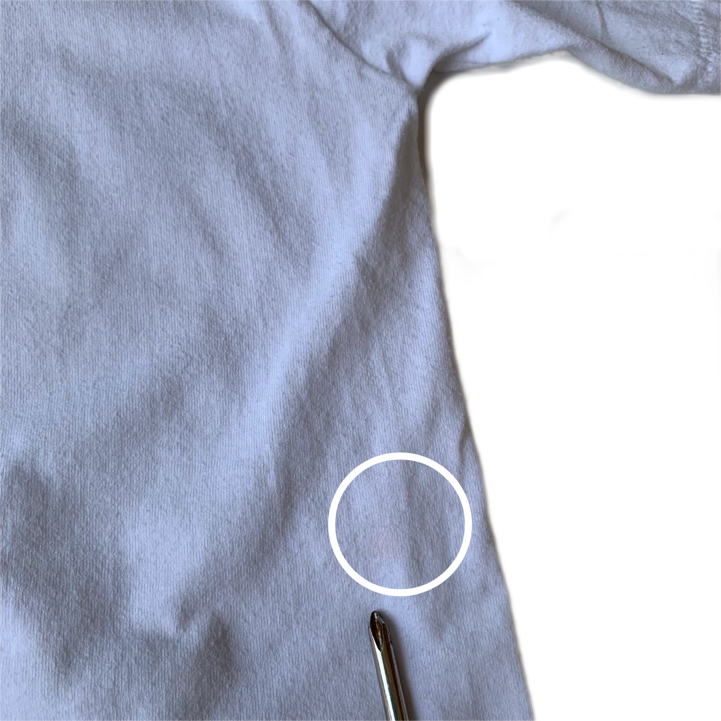 ・前身頃 裾上、プリント付近、前身頃 右袖、後身頃 裾上、後身頃 左袖先など所々にシミがございます。