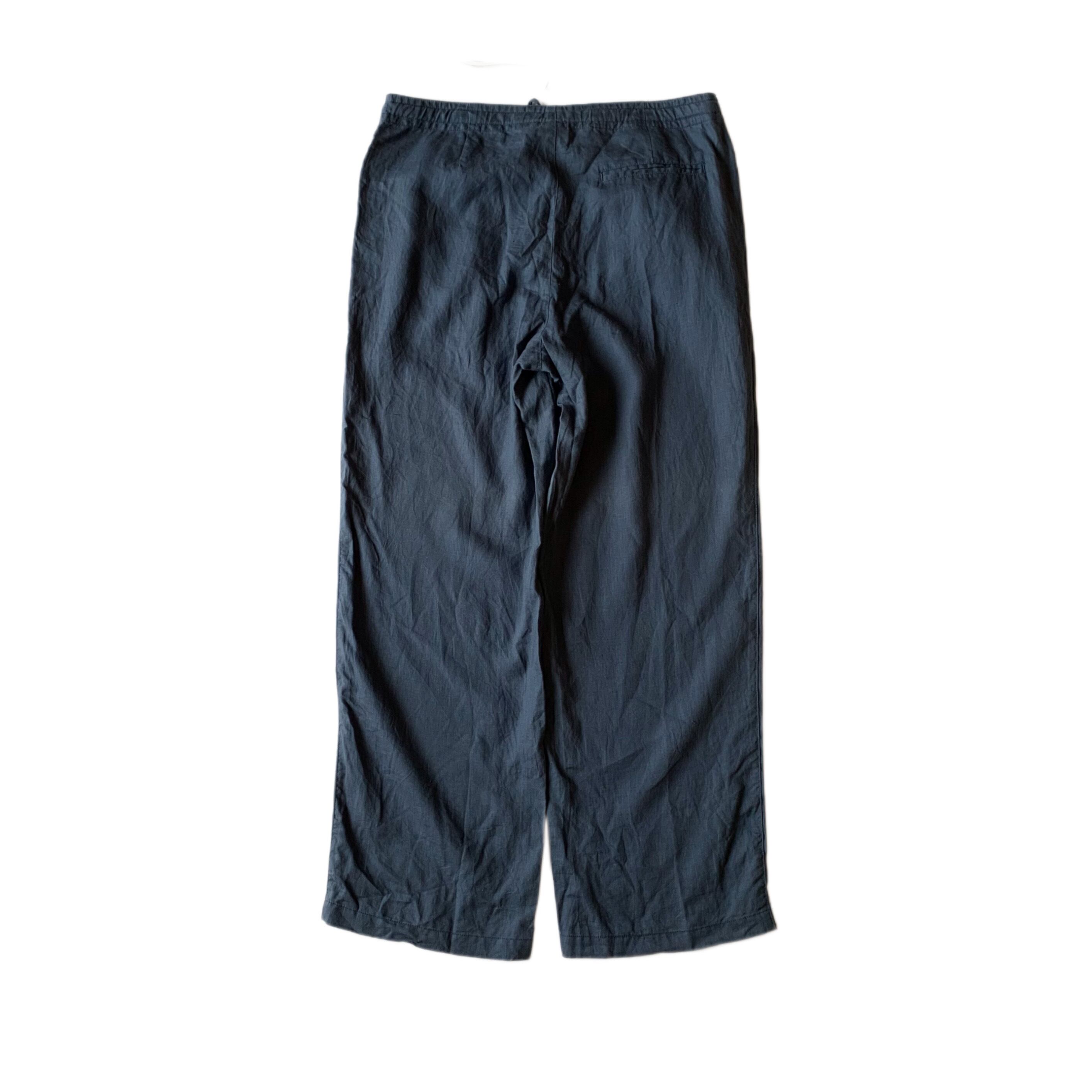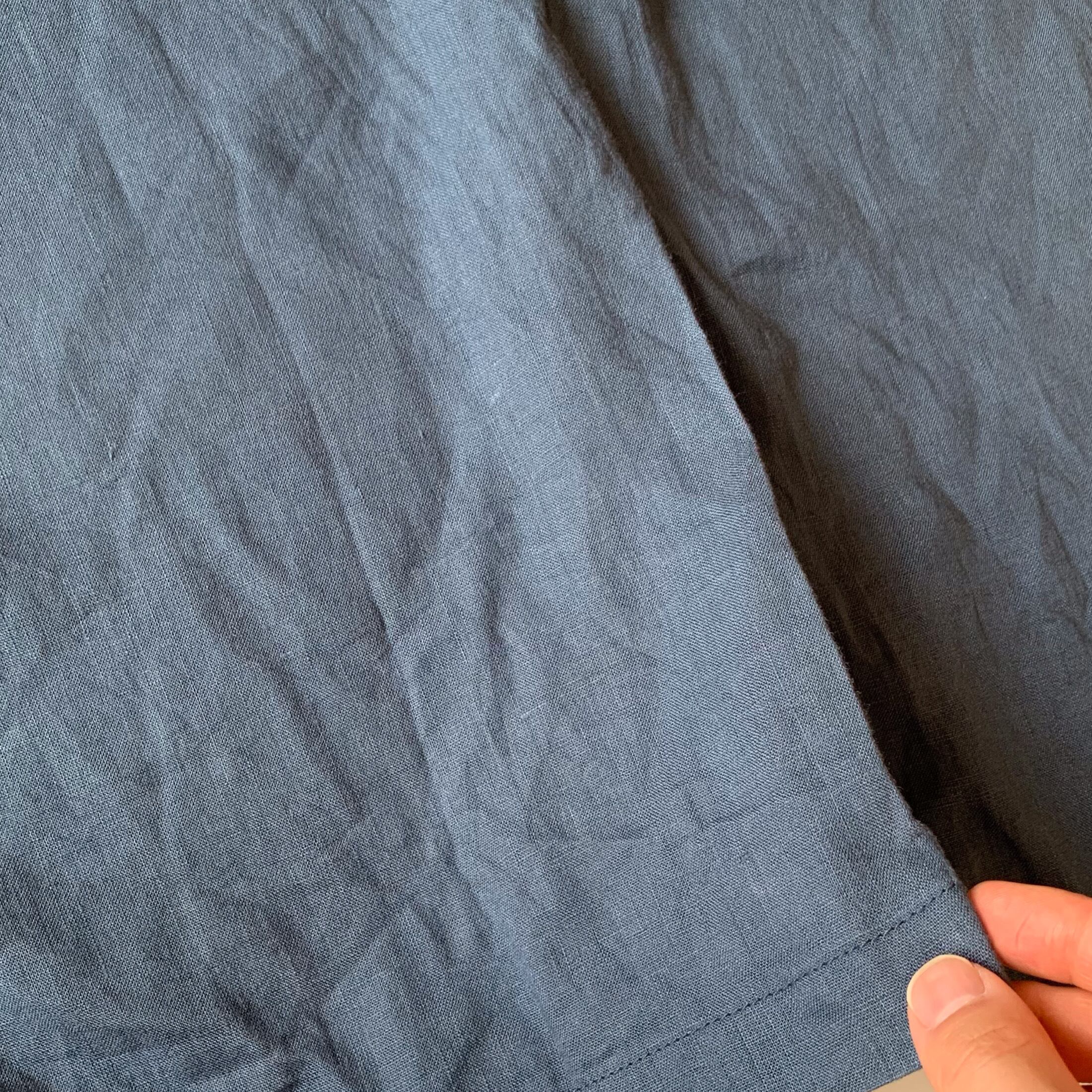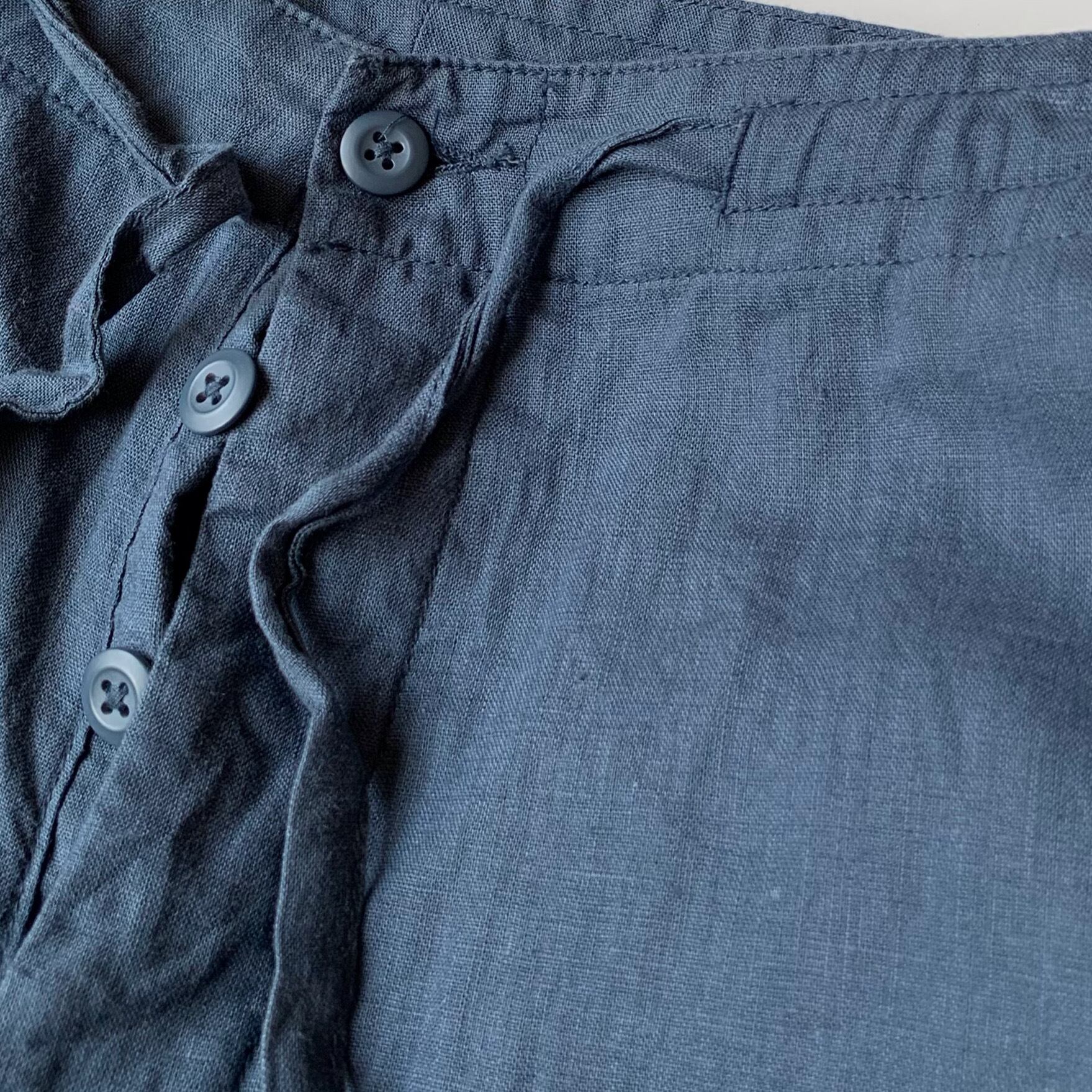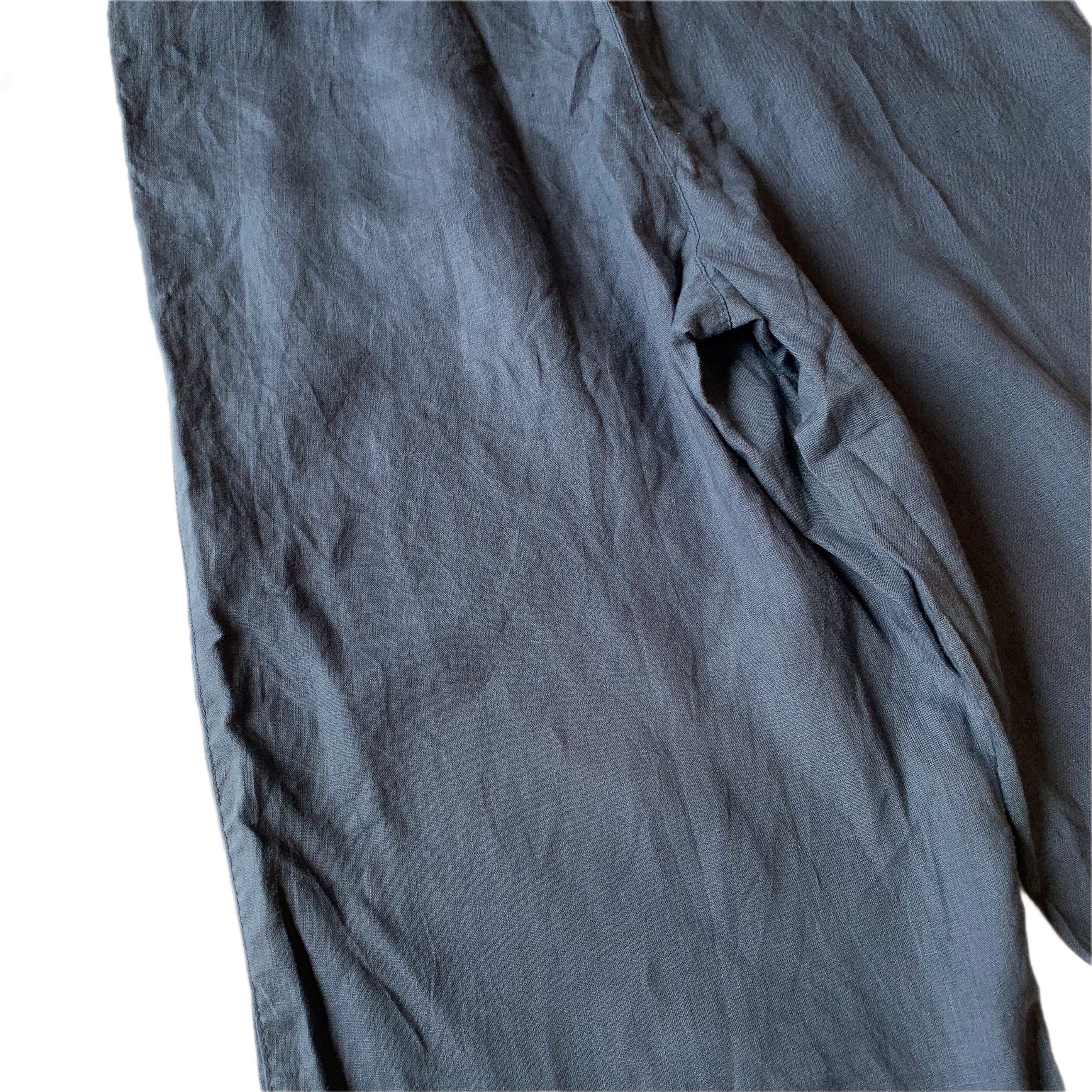 リネン100%のドレープ感のあるシルエットが魅力的です。ワタリ幅もしっかりあり、ストンと落ちるような形です。