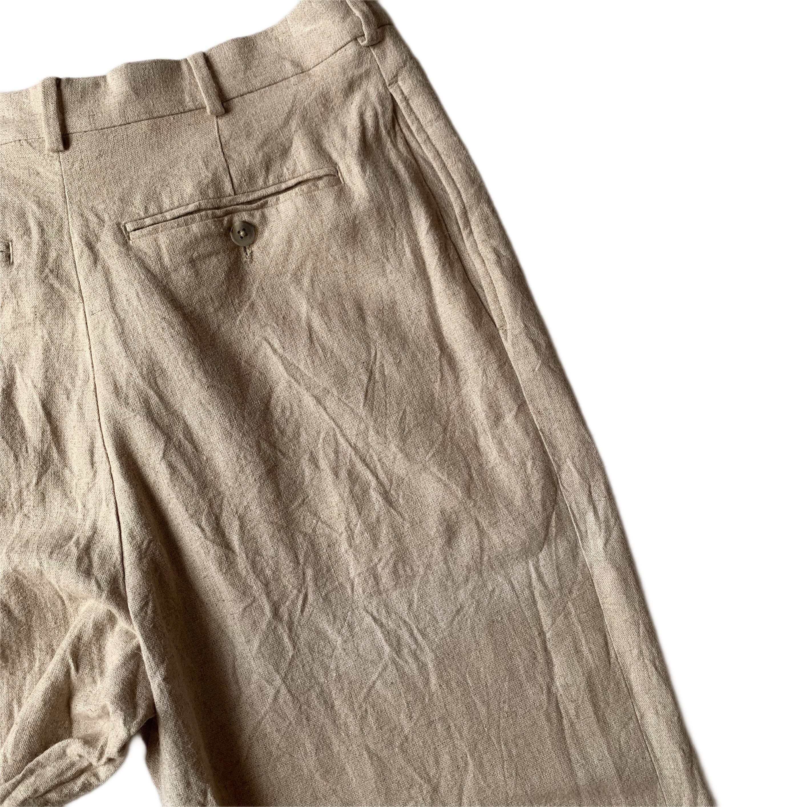 リネンの風合い良いカラーリング。裾はダブル仕上げ。裾に1部汚れがございますが、ロールアップして履けば問題ないないかと思います。