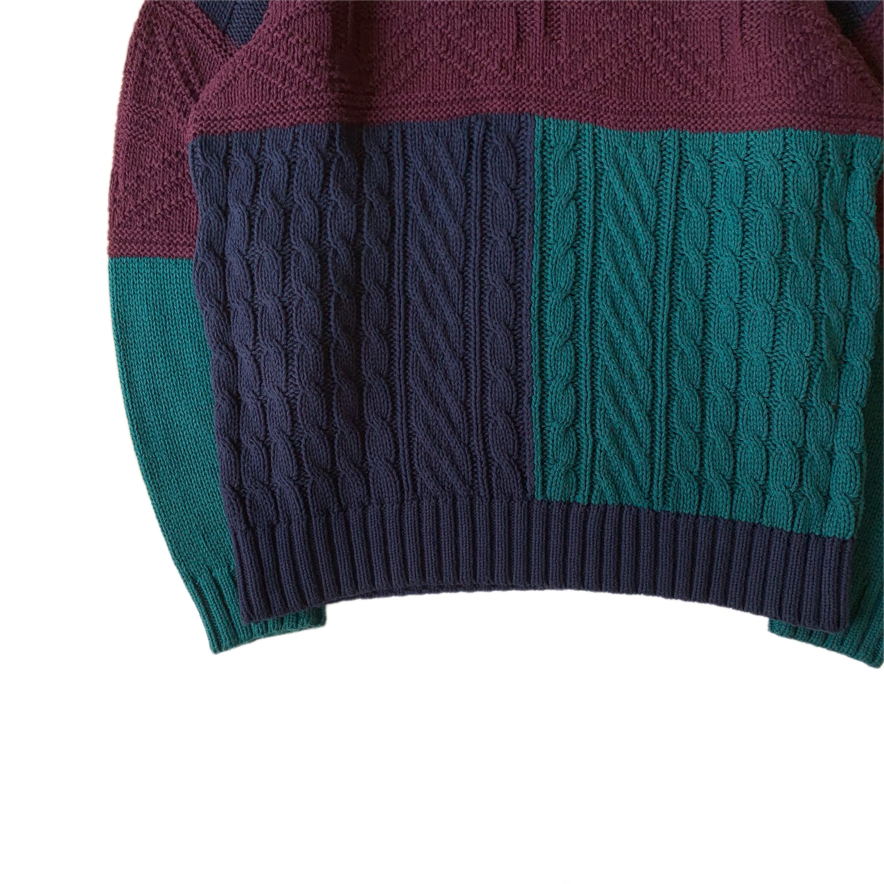 ネイビー×パープル×グリーン系の配色、配置パターンが素晴らしい1枚。よく見ると色ごとに編み方も切り替えられていて、かなり手が込んでいます。