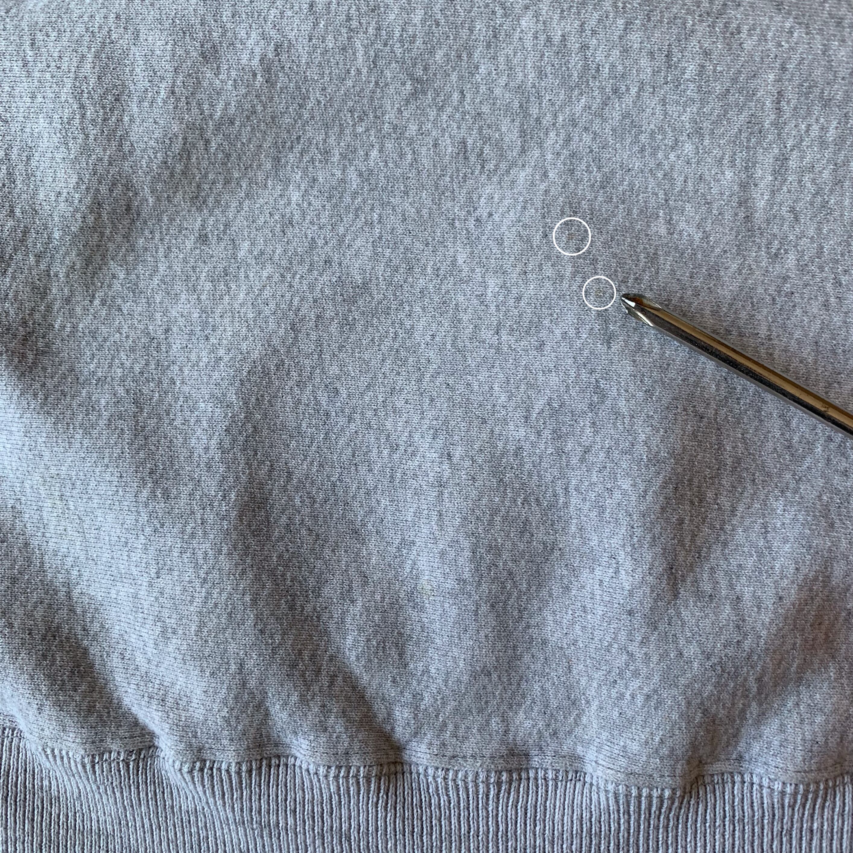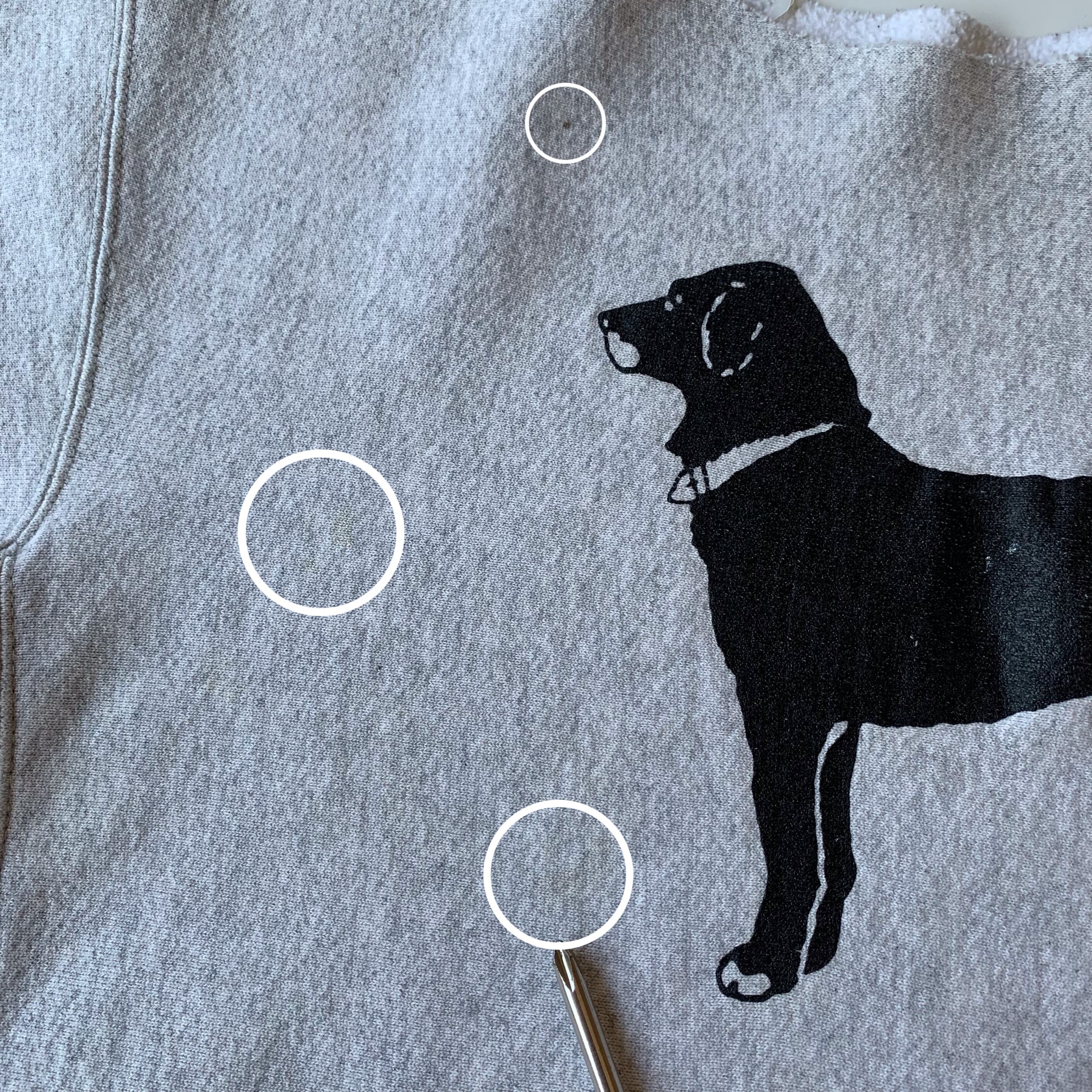・裾上、プリント付近、袖、袖リブなど所々にシミ・汚れがございます。