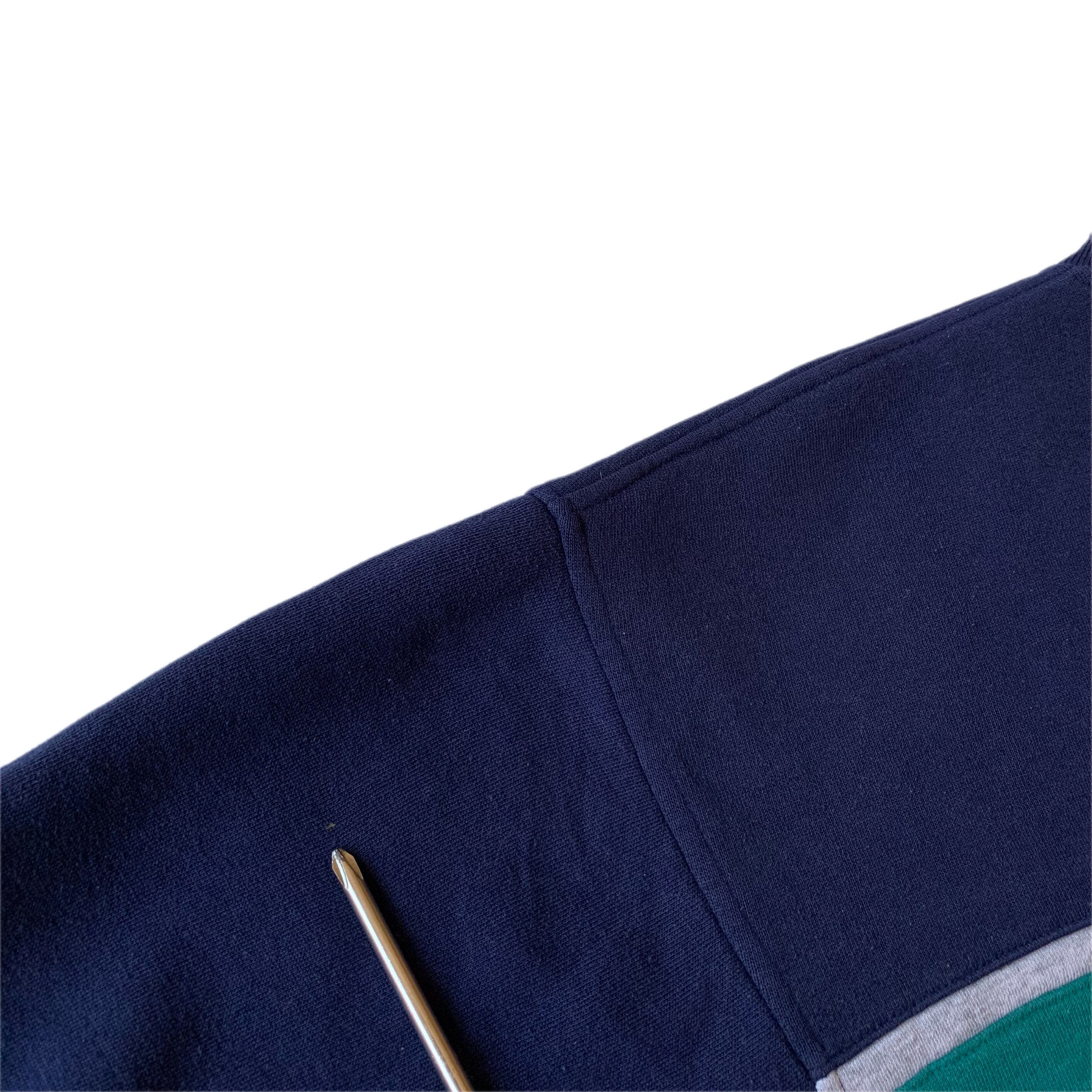 ネイビーボディの中央部にグリーン×グレーのボーダー柄が施されたデザインです。裾上にはスラッシュポケットが付いた珍しいディテール。